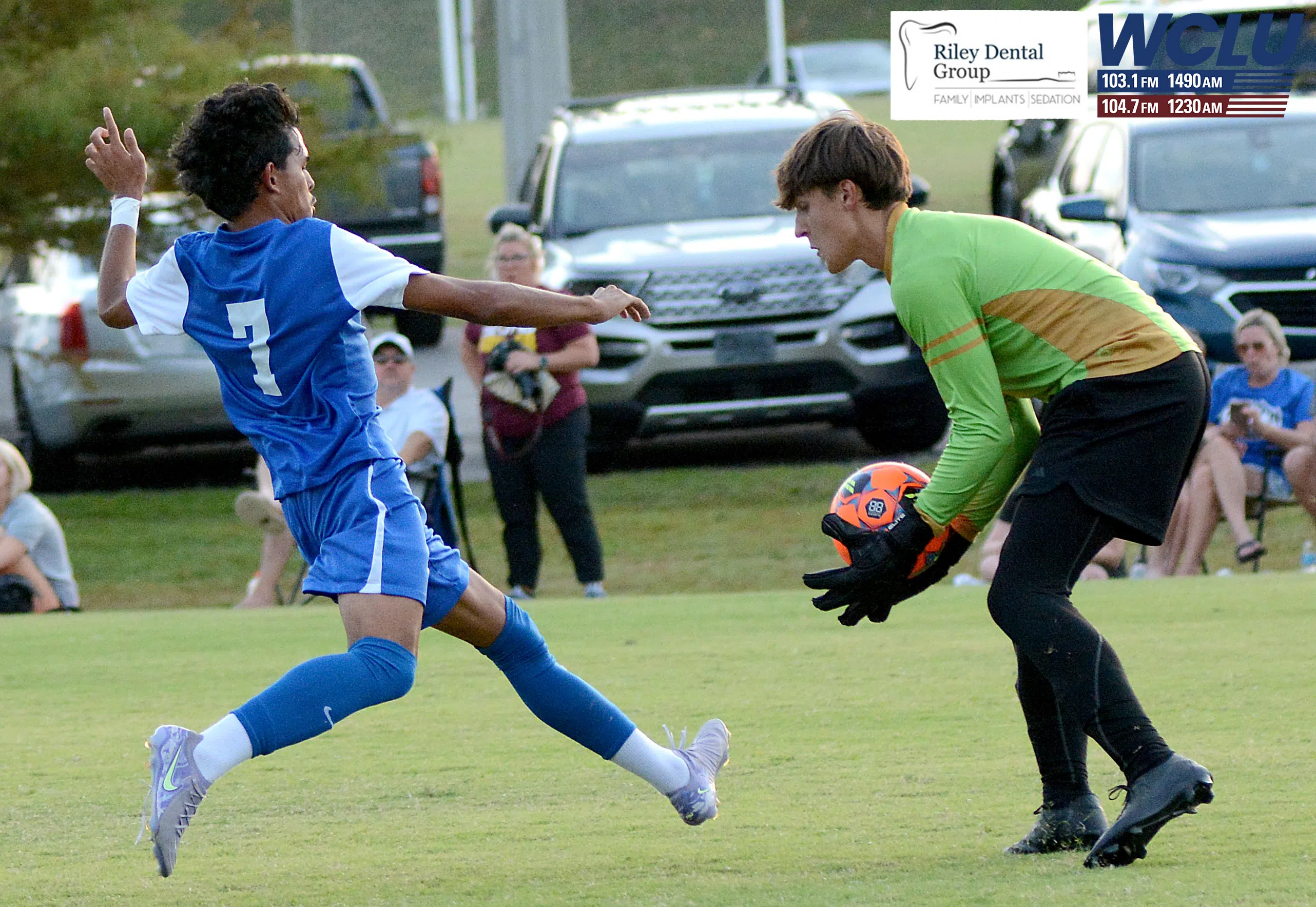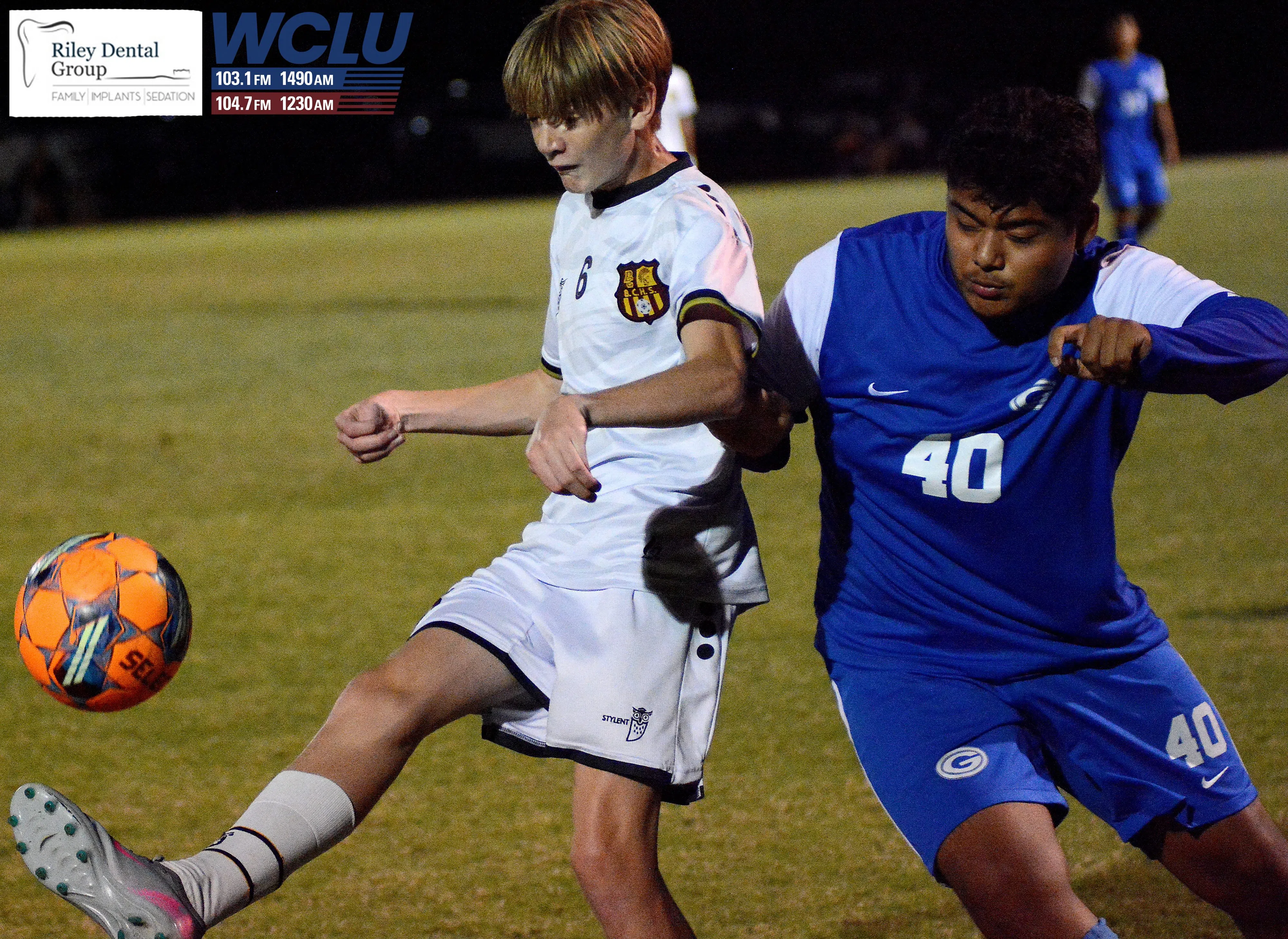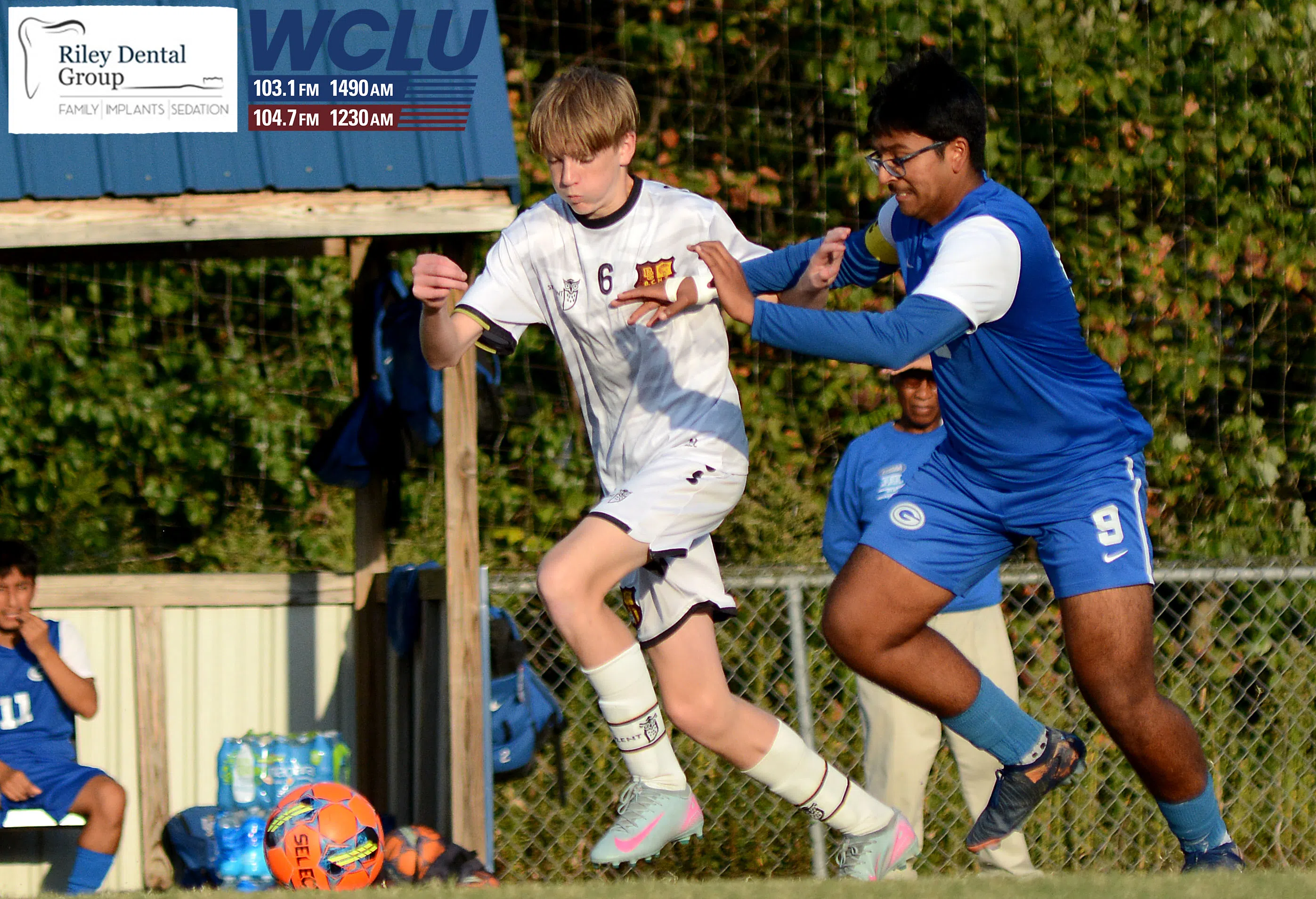 Glasgow’s Ronaldo Puldon attempts to get to the ball as Barren County’s Jacob Dooley grabs it. Glasgow won, 6-2. Auggie Brown/WCLU Sports