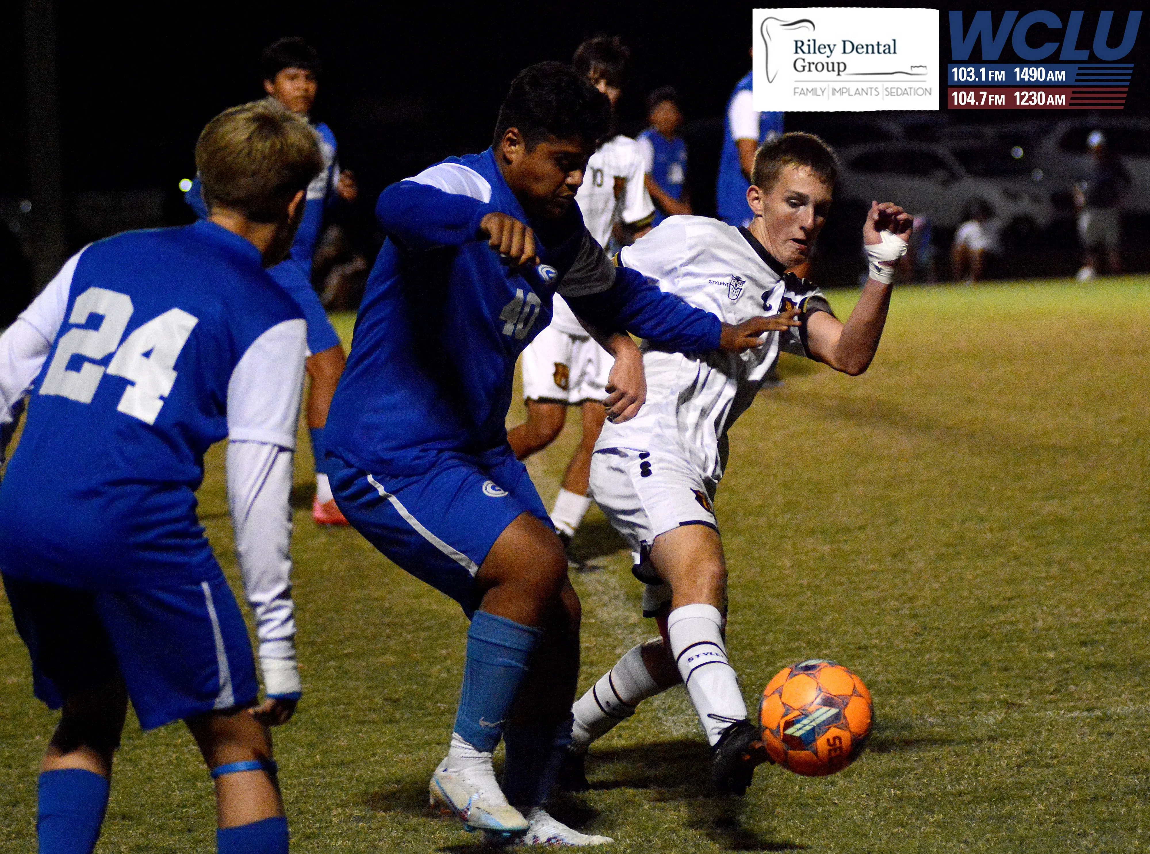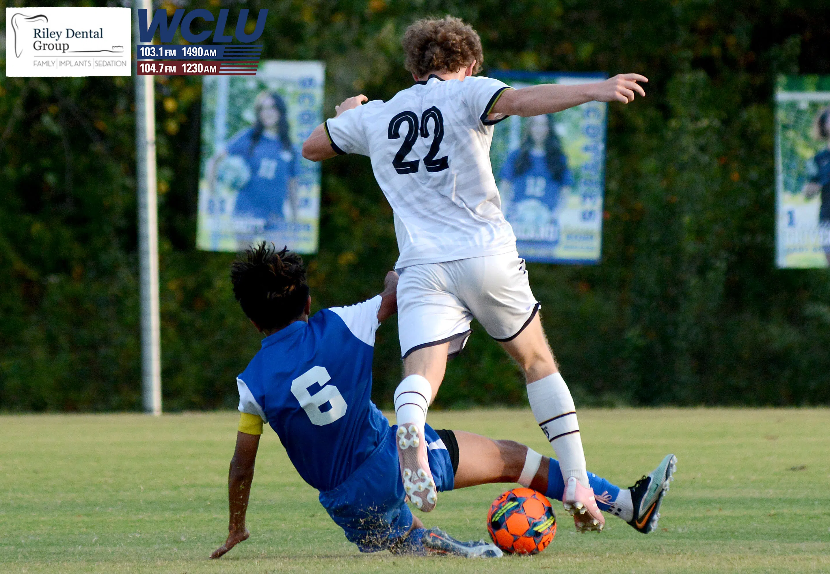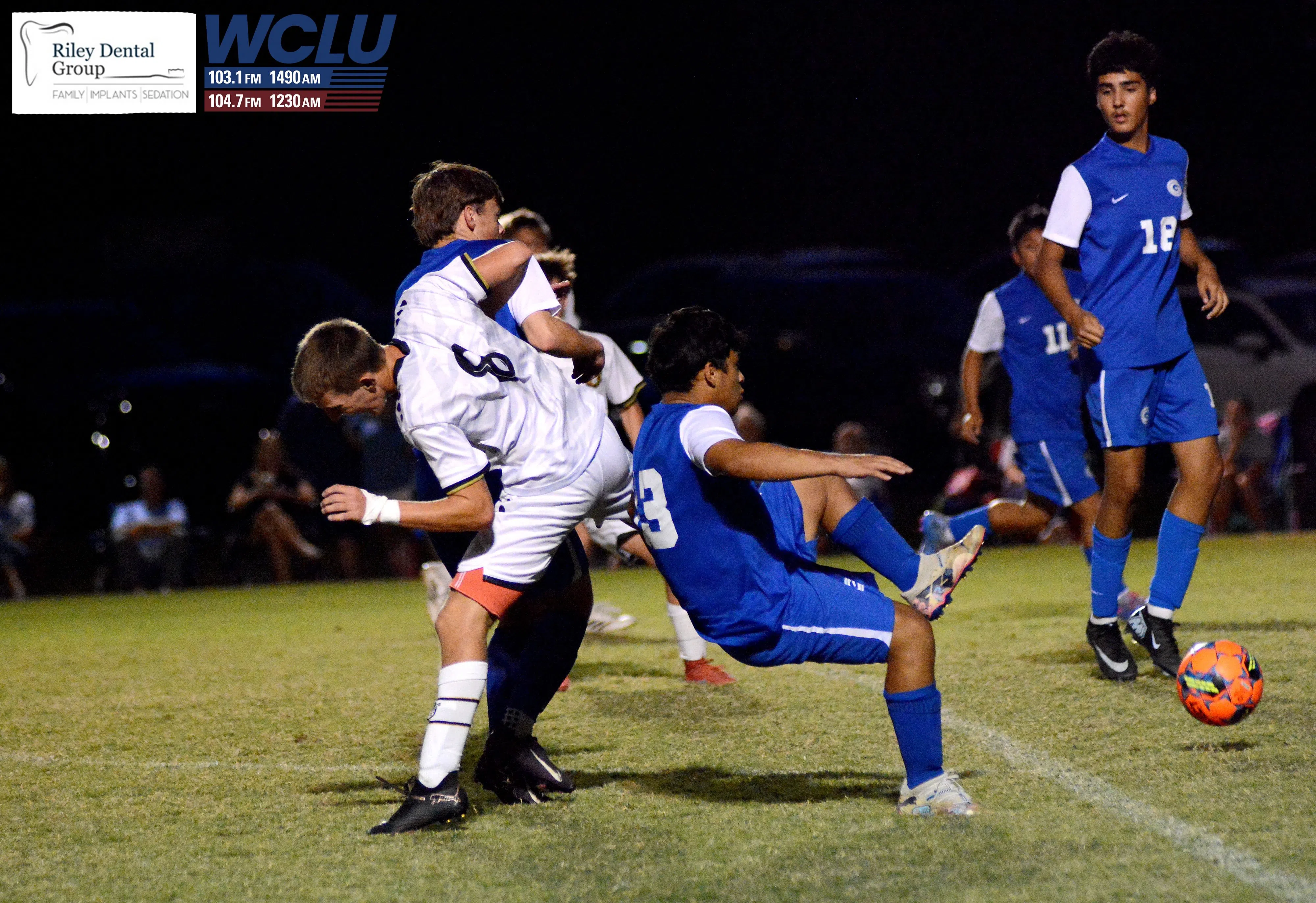 Glasgow’s Ronaldo Puldon attempts to get to the ball as Barren County’s Jacob Dooley grabs it. Glasgow won, 6-2. Auggie Brown/WCLU Sports