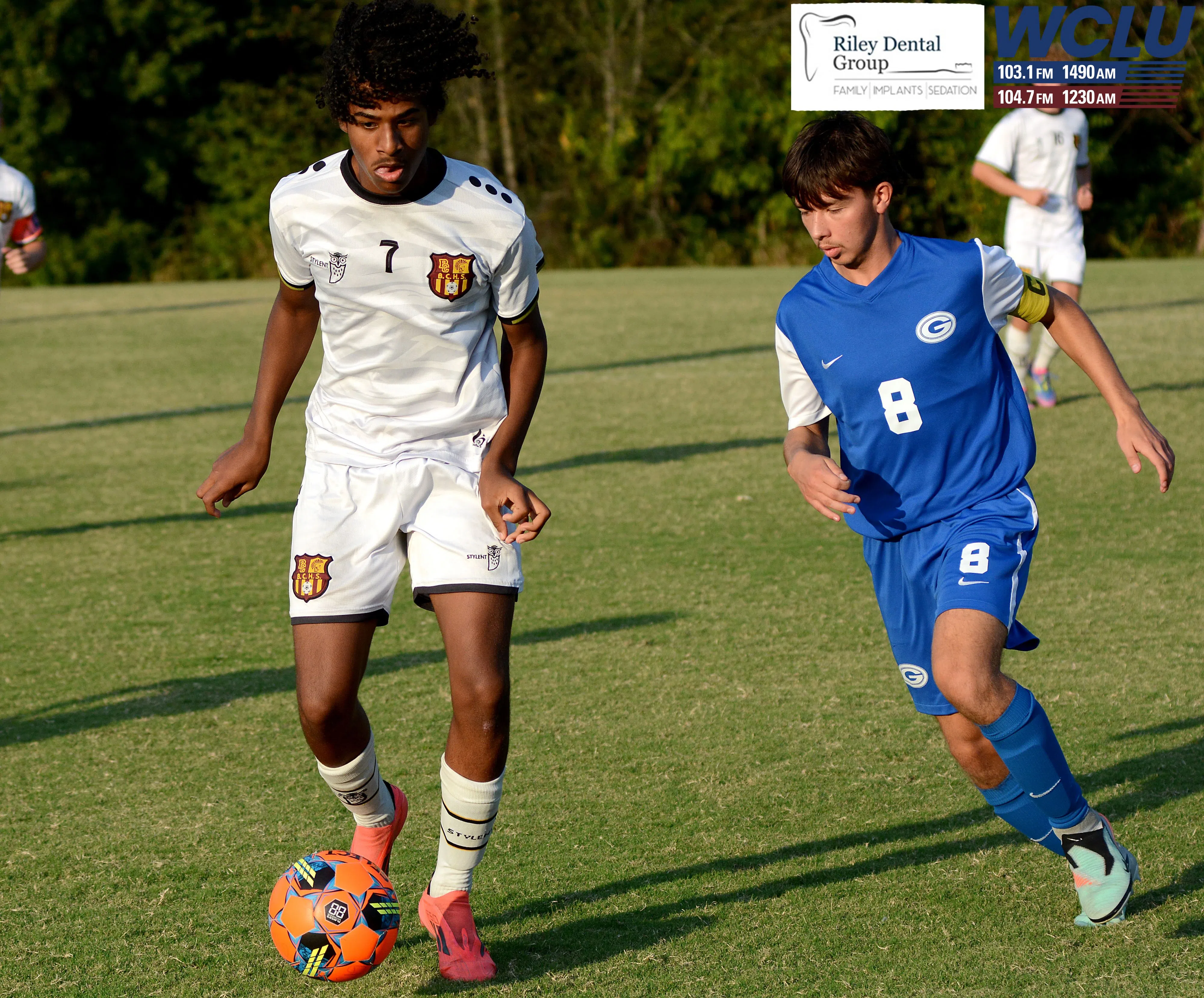 Barren County’s Gabriel Nyekan dribbles as Glasgow’s Isaiah Ramos comes to defend. Glasgow won, 6-2. Auggie Brown/WCLU Sports