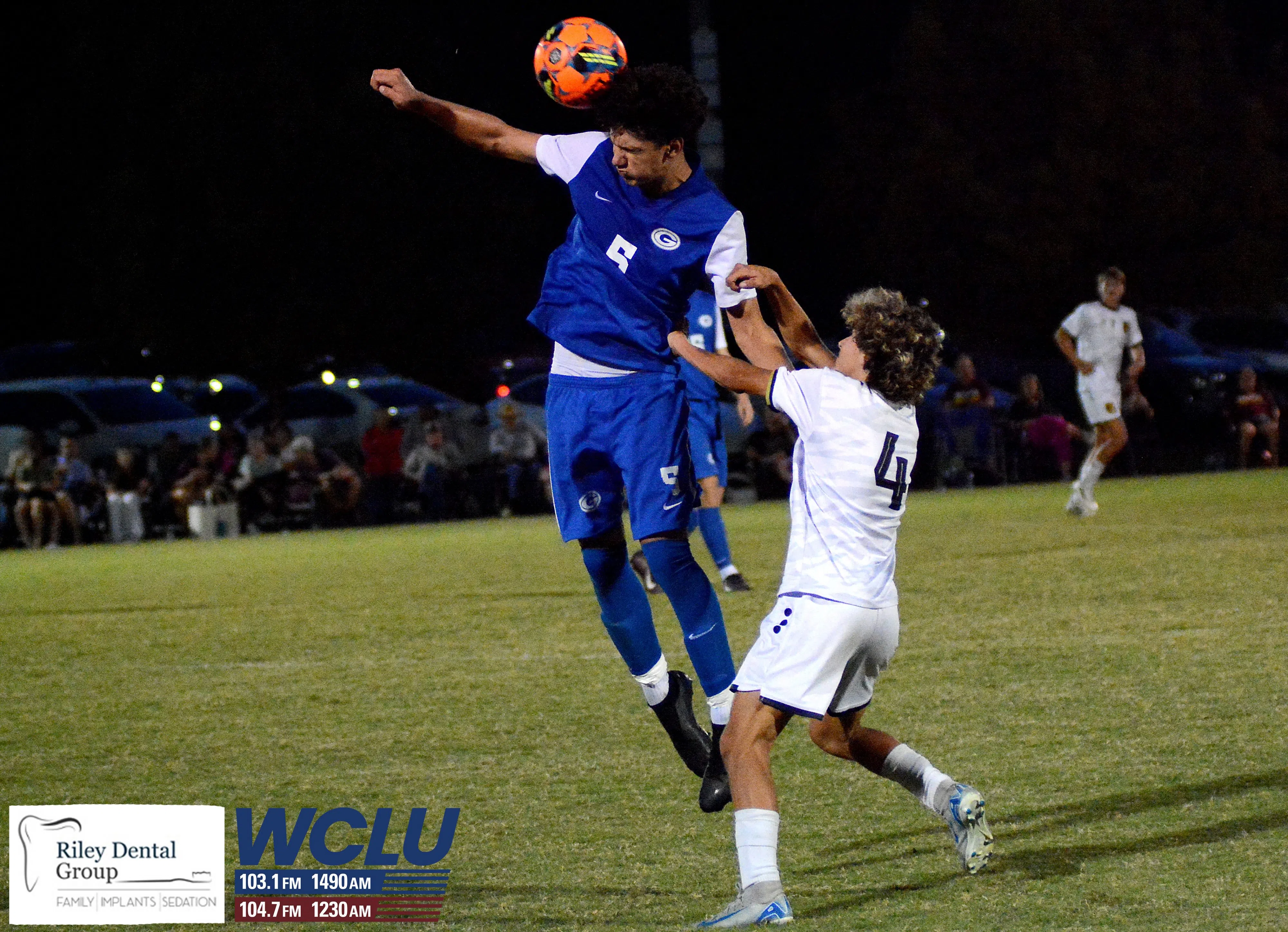 Glasgow’s Owen Travis heads the ball as Barren County’s Austin Emerson defends. Glasgow won, 6-2. Auggie Brown/WCLU Sports
