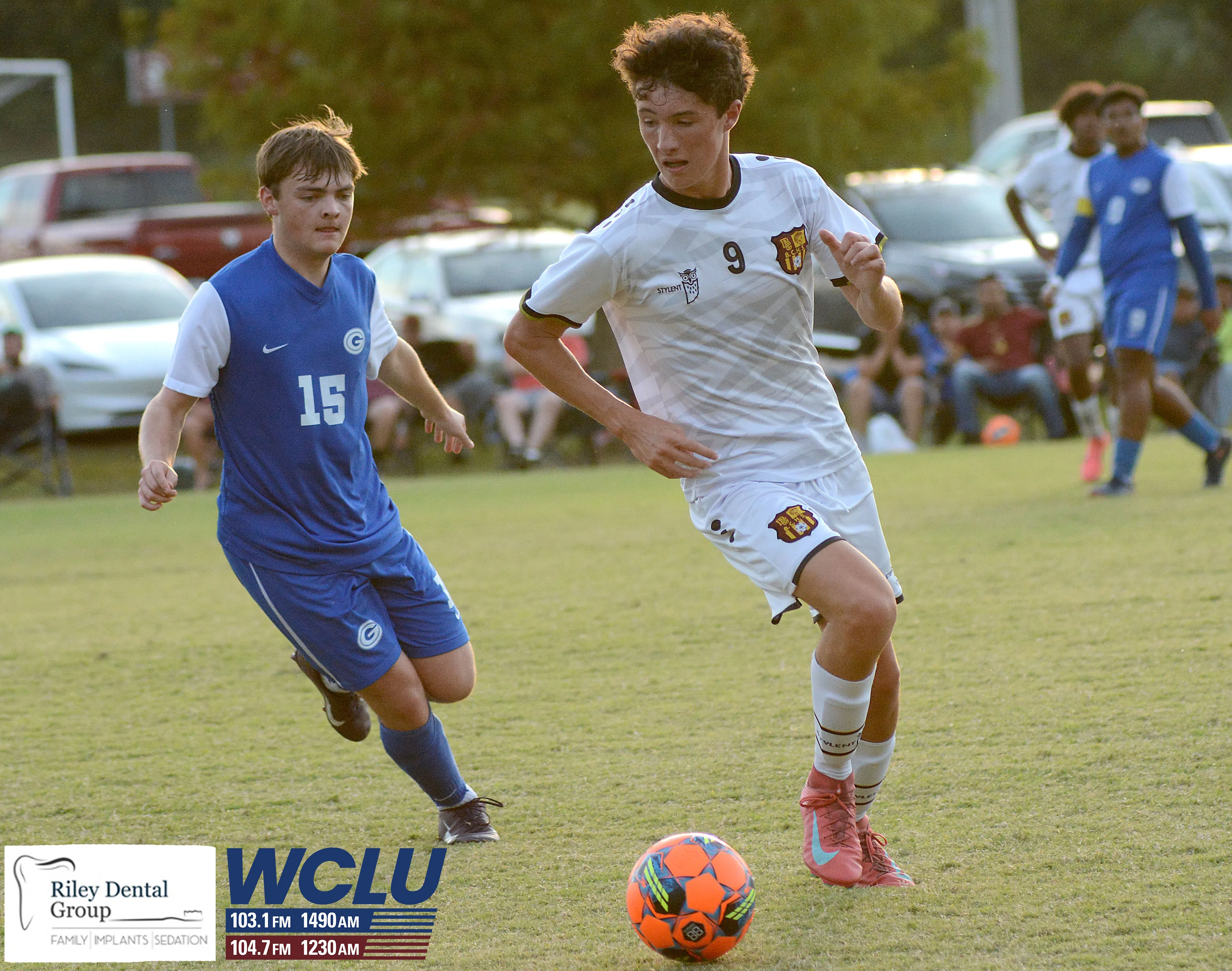 Barren County’s Beau Mitchell settles the ball on his foot as Glasgow’s Jefferson Fuentes defends. Glasgow won, 6-2. Auggie Brown/WCLU Sports