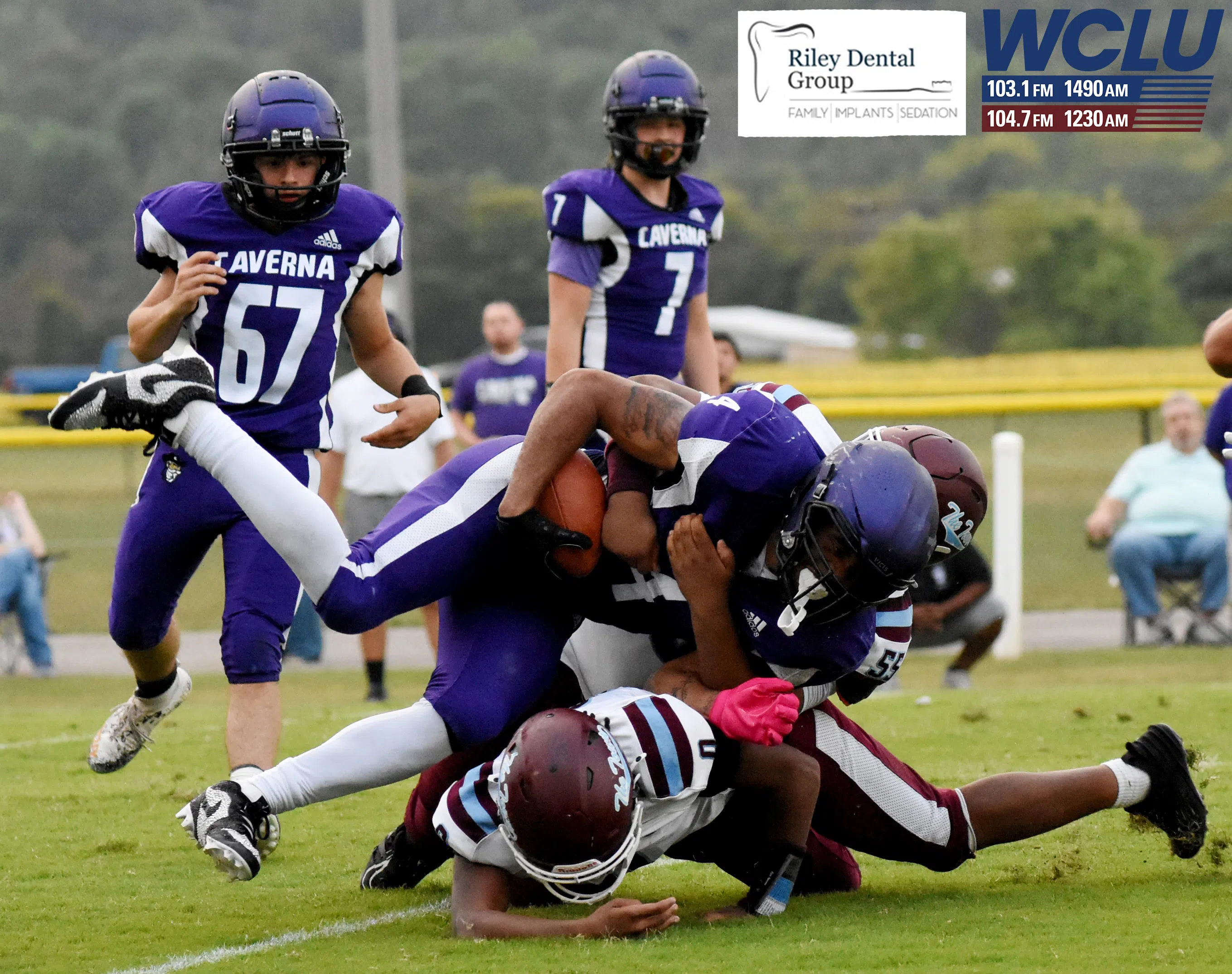 Caverna’s Karim Elnahdy and Keylan Bailey combine to make a tackle against Jeffersontown. The Colonels lost, 50-12. James Brown/WCLU Sports