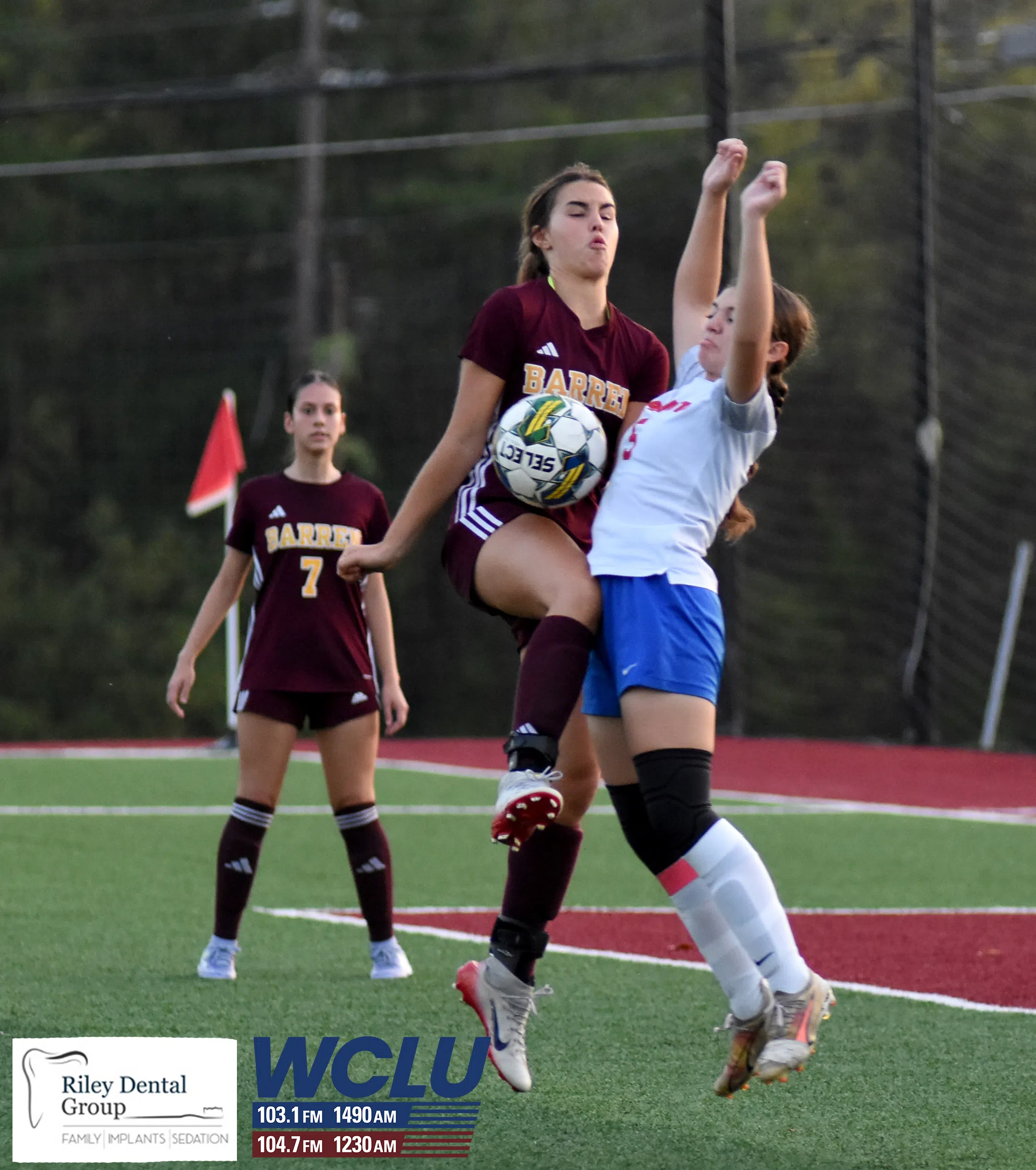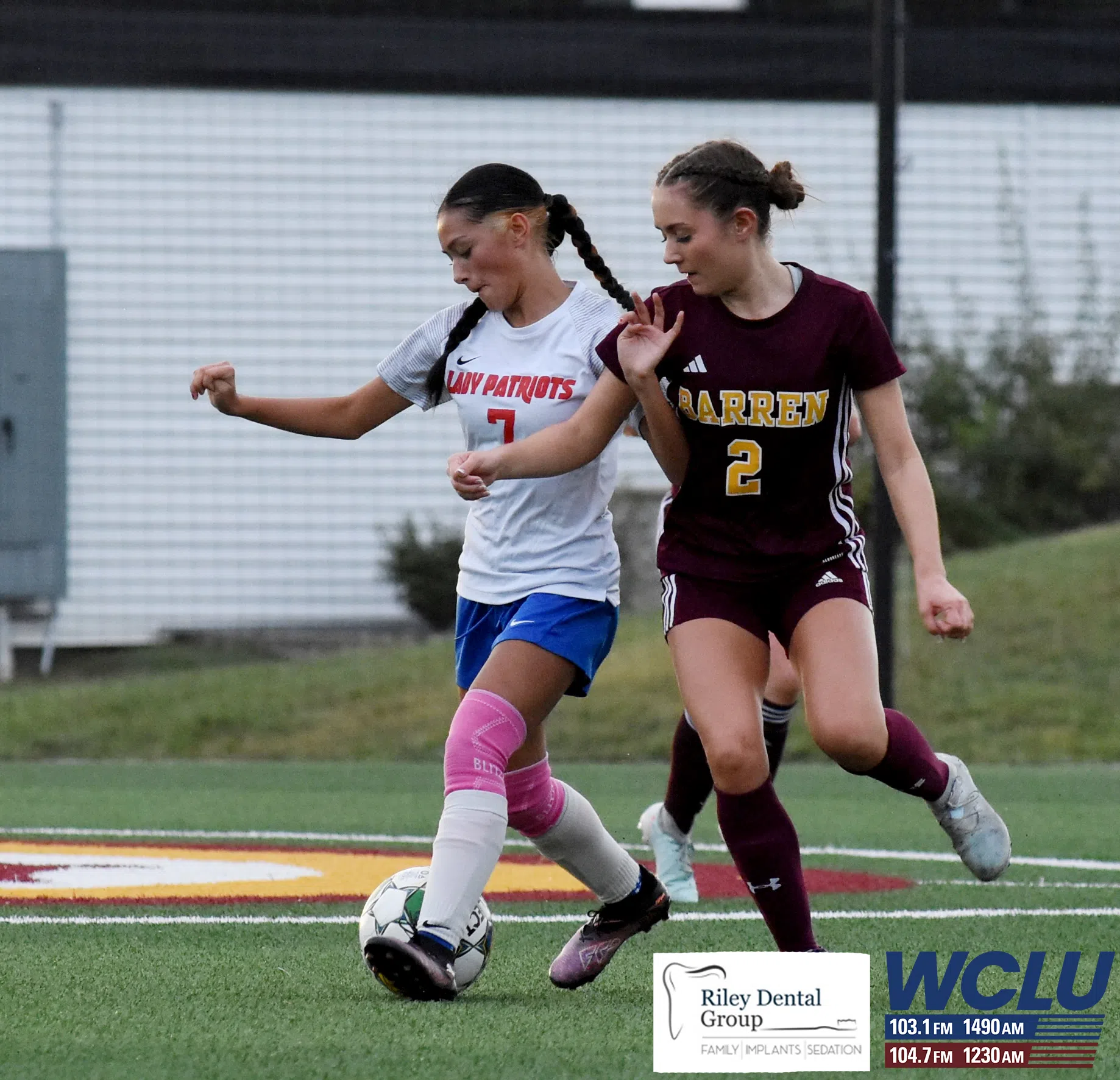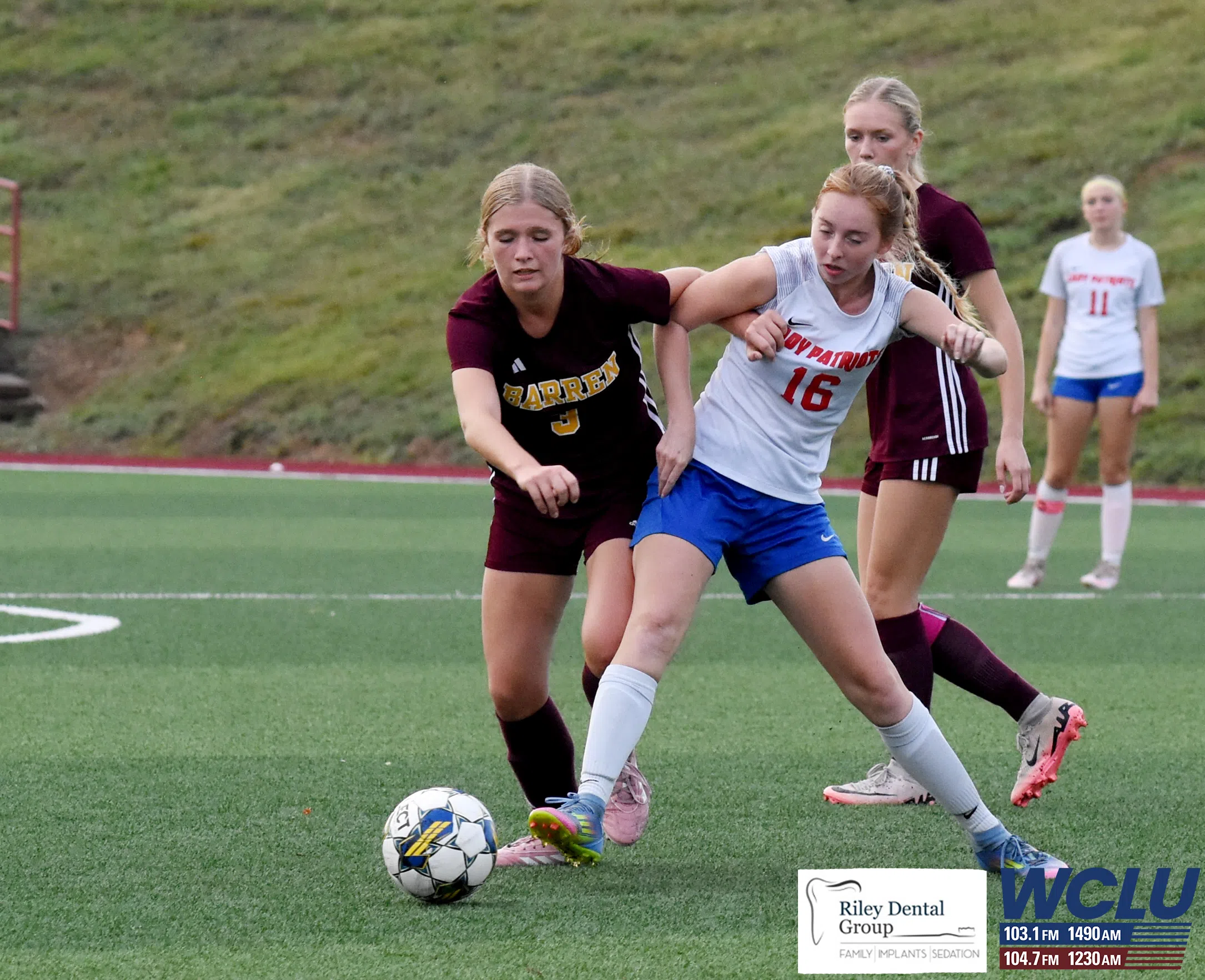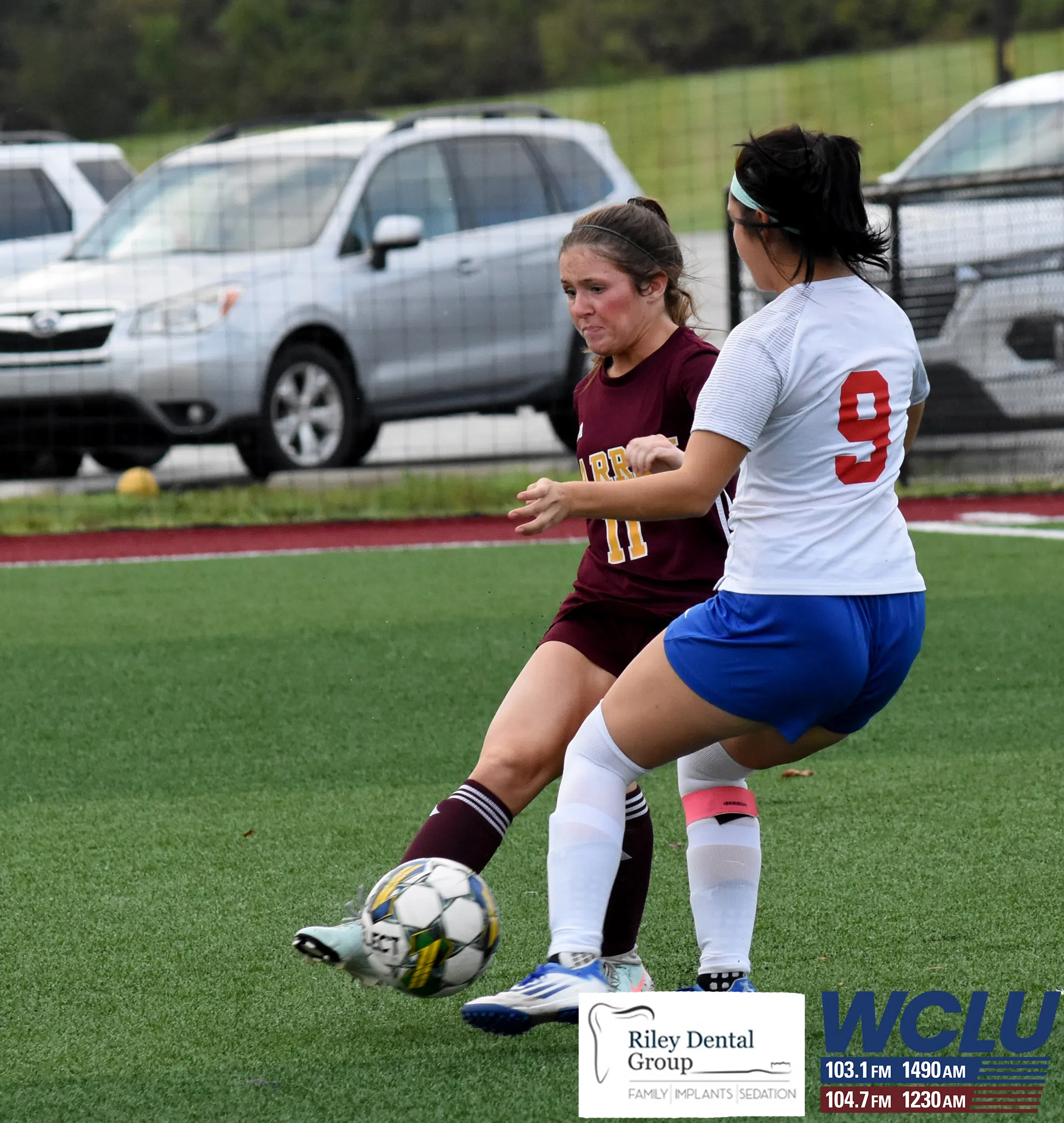 Barren County’s Shelby Byrd battles for the ball against Allen County-Scottsville in a 15th District contest. The Trojanettes won, 4-0. James Brown/WCLU Sports