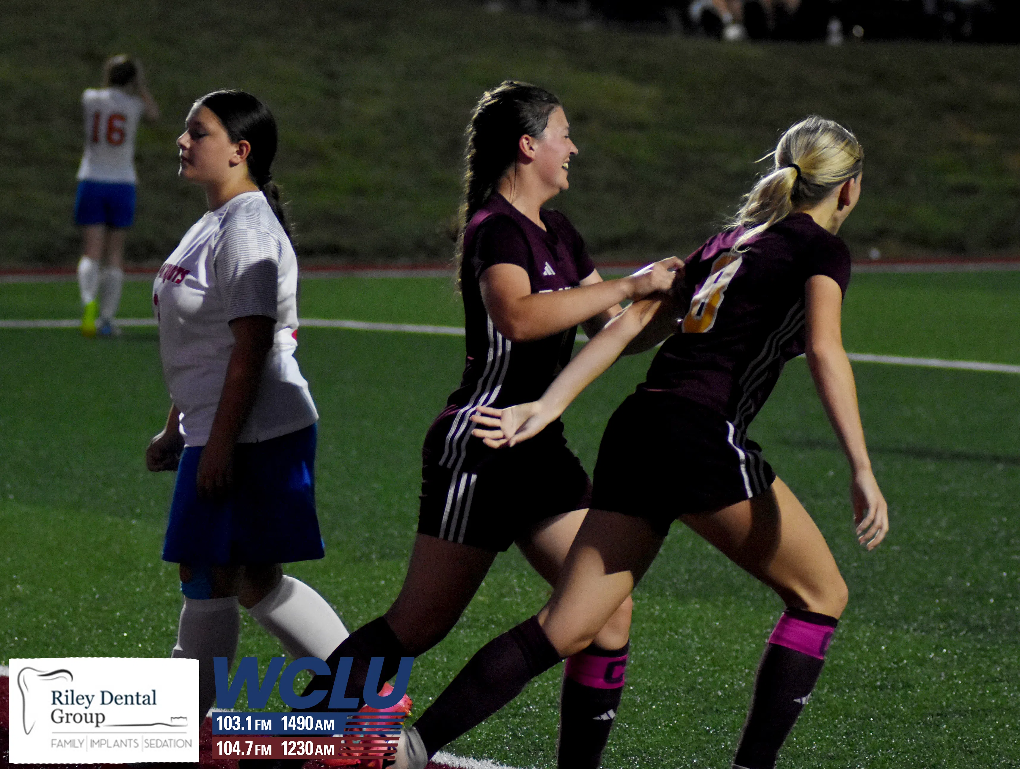 Barren County’s Kathrynn Dooley and Kayla Kaumanns celebrate after Dooley scored a goal against Allen County-Scottsville in a 15th District contest. The Trojanettes won, 4-0. James Brown/WCLU Sports