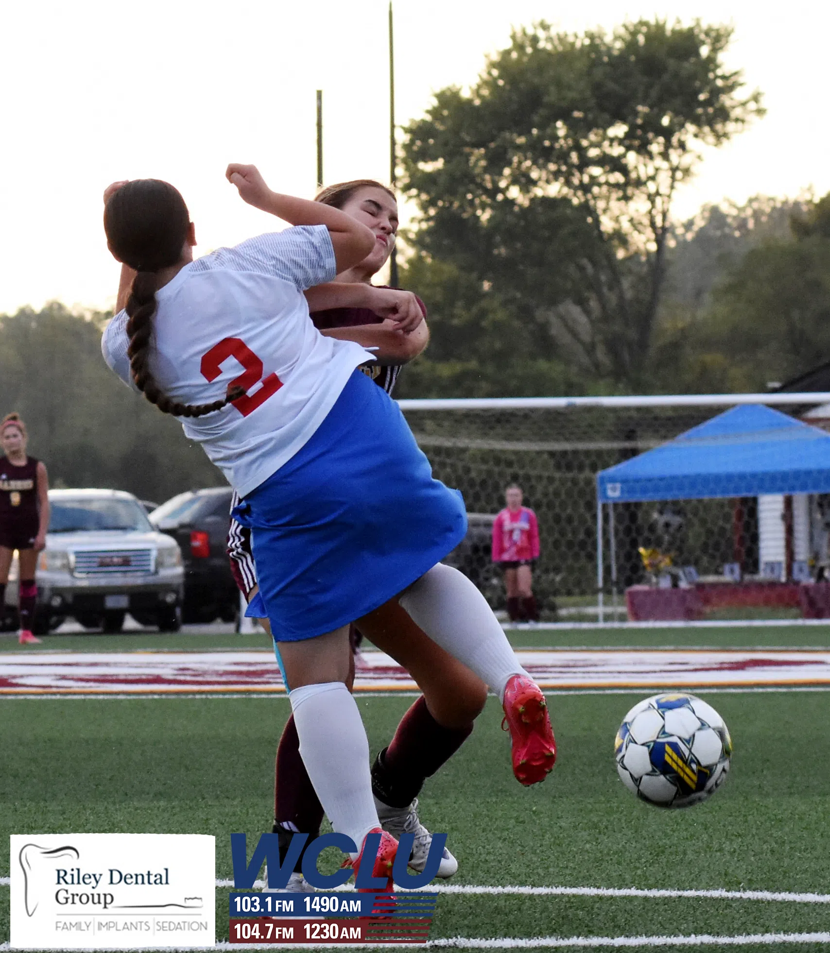 Barren County’s Shelby Byrd collides with a defender against Allen County-Scottsville in a 15th District contest. The Trojanettes won, 4-0. James Brown/WCLU Sports