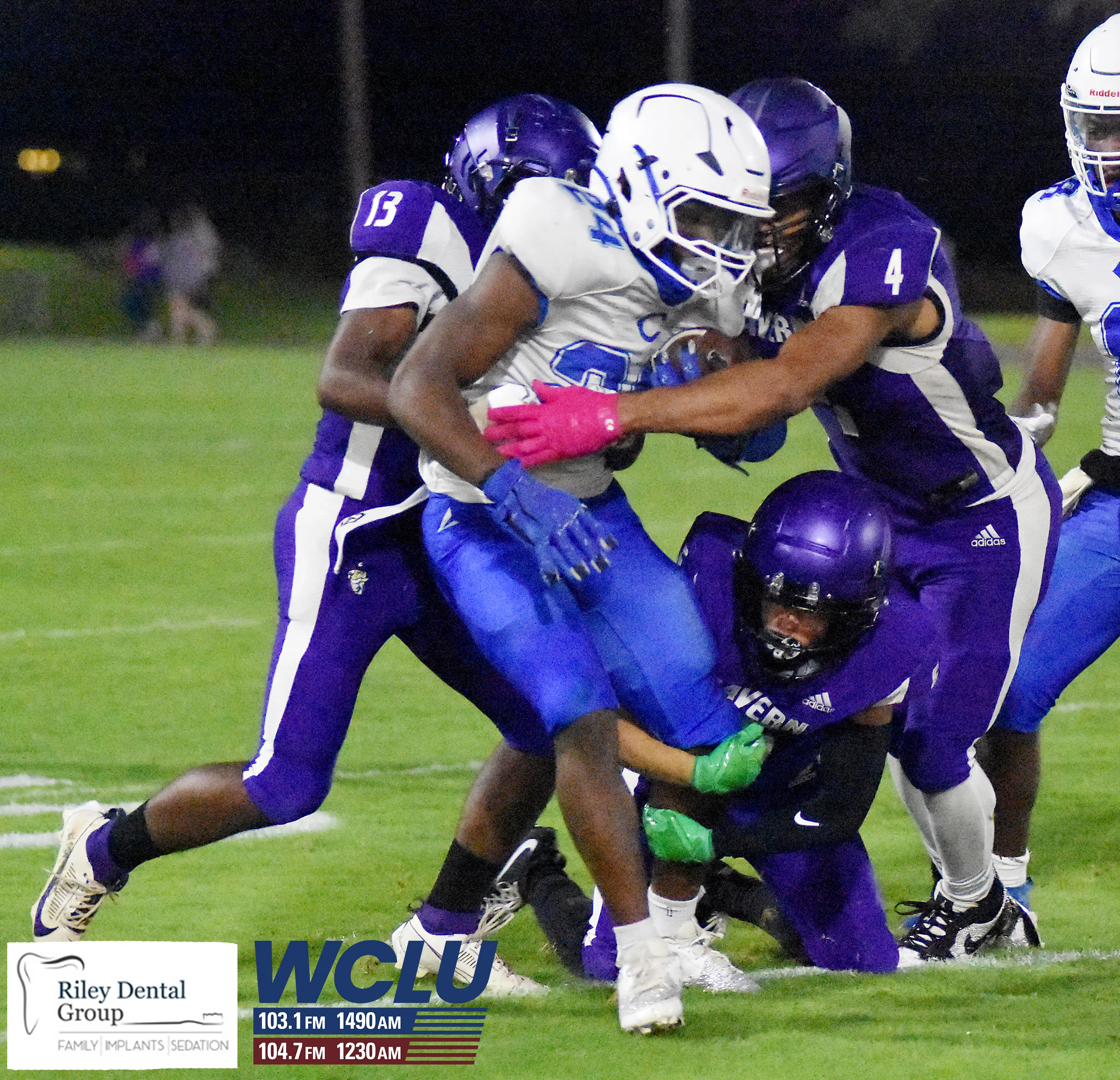 Caverna’s Taviane Alexander (13), Tyson Martin and Caleb Burris combine to make a tackle against Christian County. The Colonels lost, 40-32. James Brown/WCLU Sports