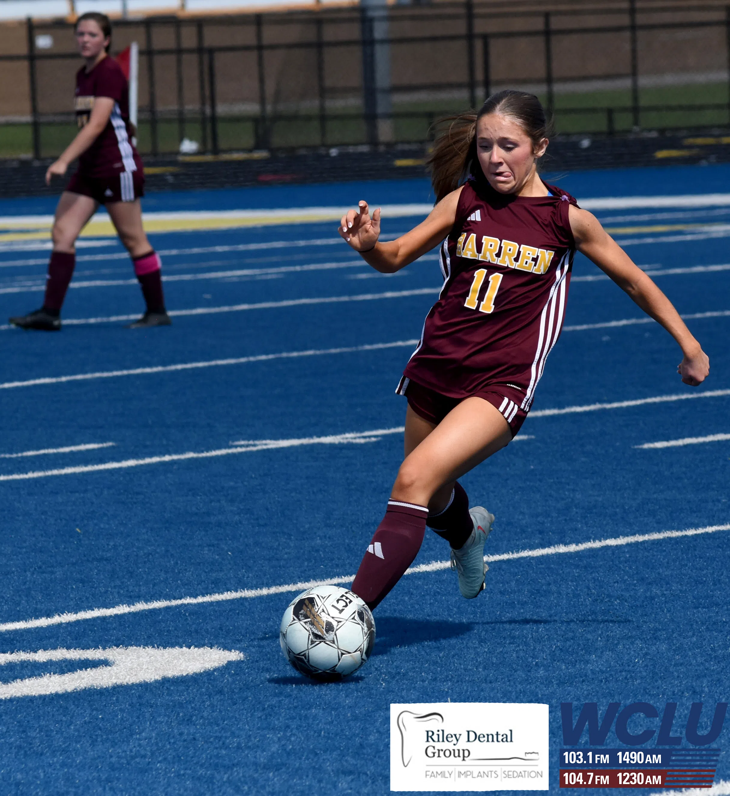 Barren County’s Emma Mouser dribbles the ball against Warren East in the 15th District Tournament. The Trojanettes lost, 2-1. James Brown/WCLU Sports