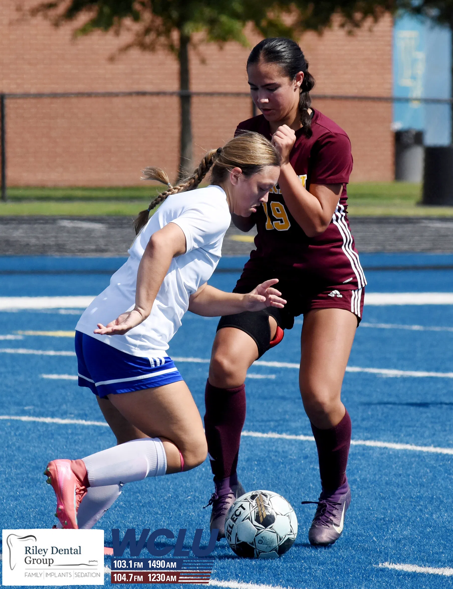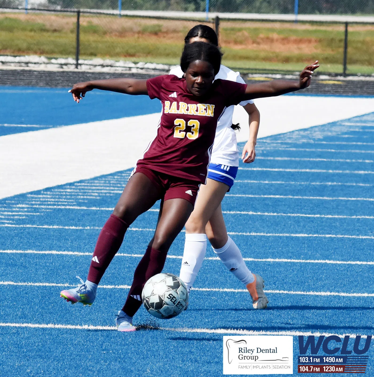 Barren County’s Mahalia Burton battles for the ball against Warren East in the 15th District Tournament. The Trojanettes lost, 2-1. James Brown/WCLU Sports