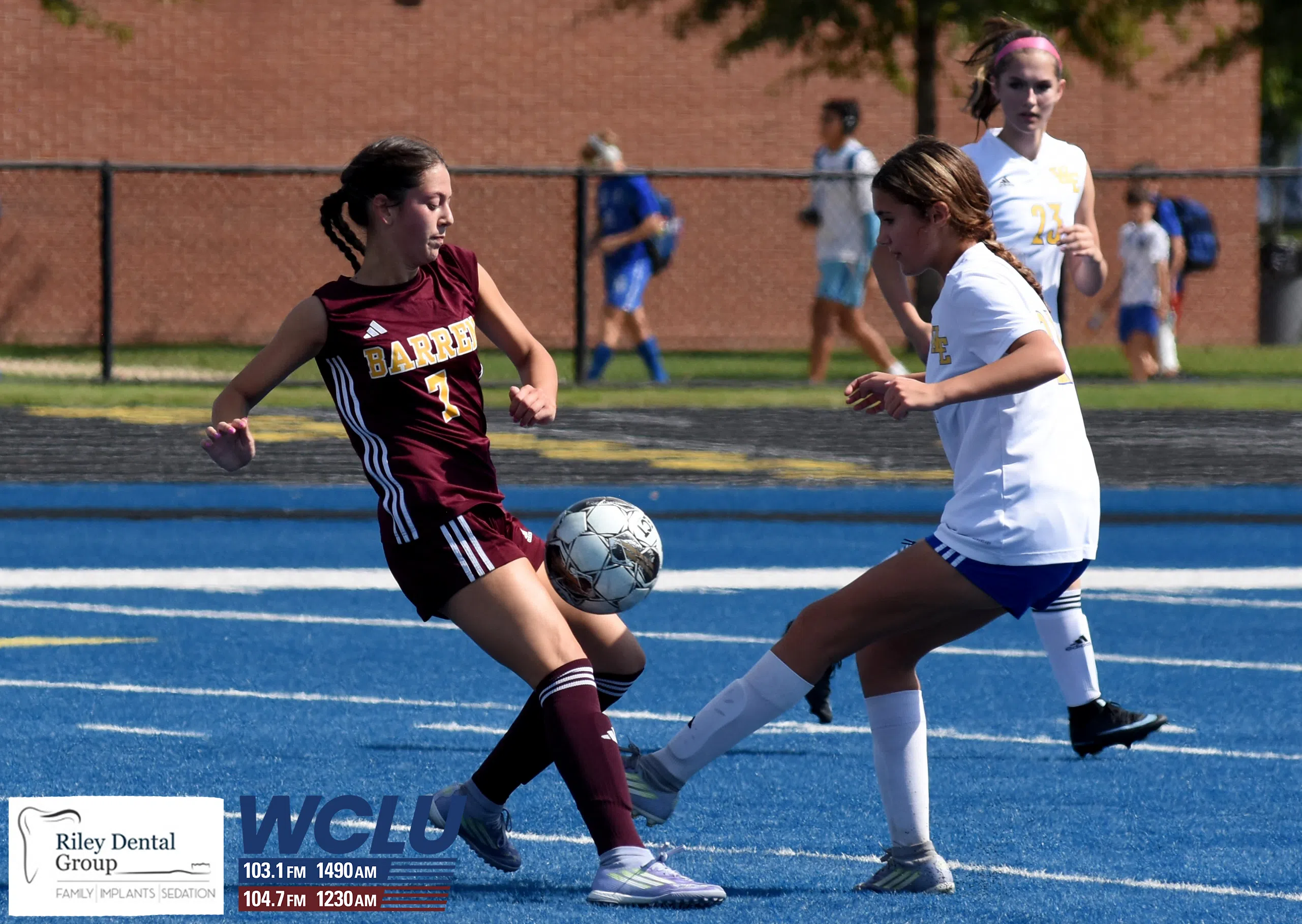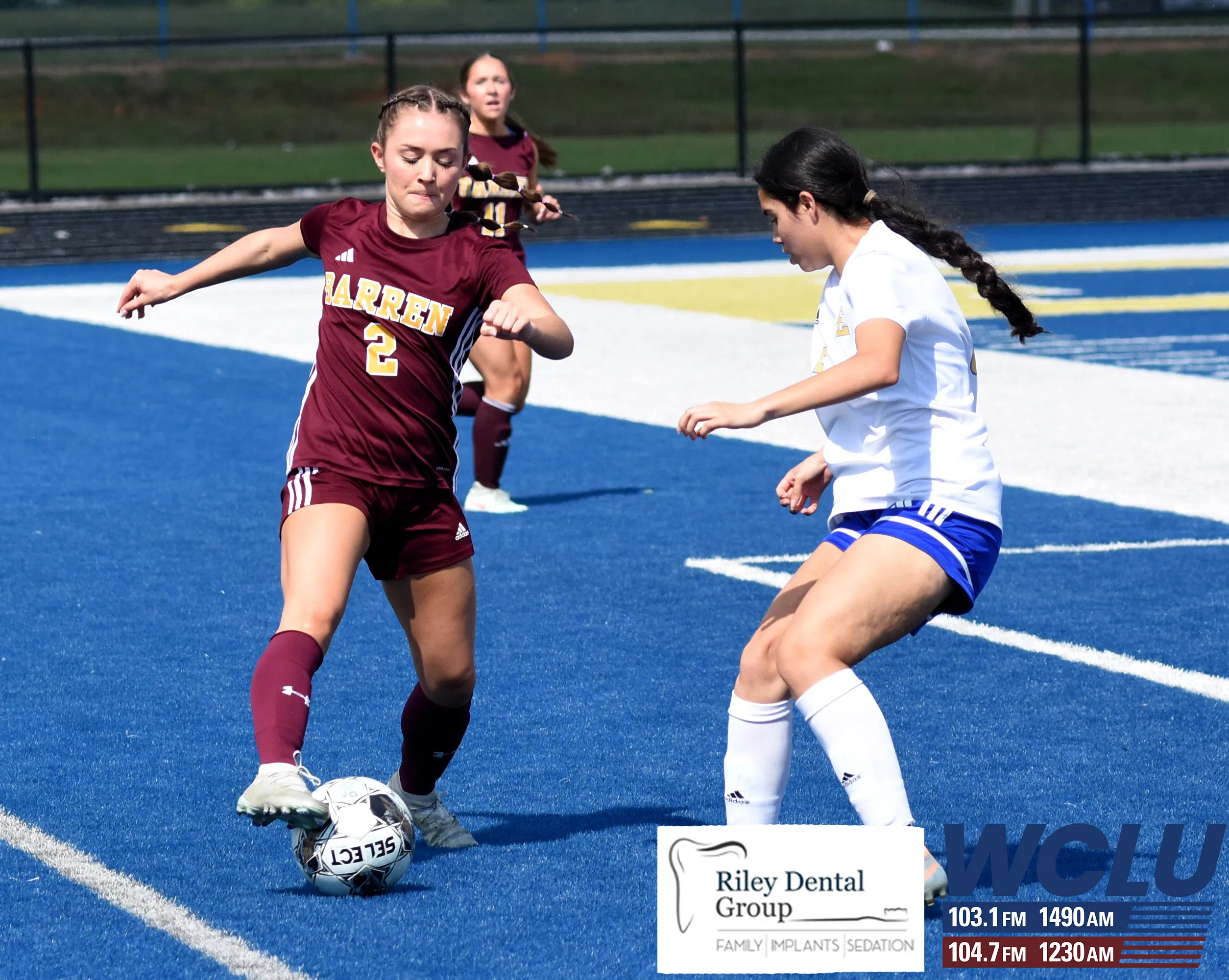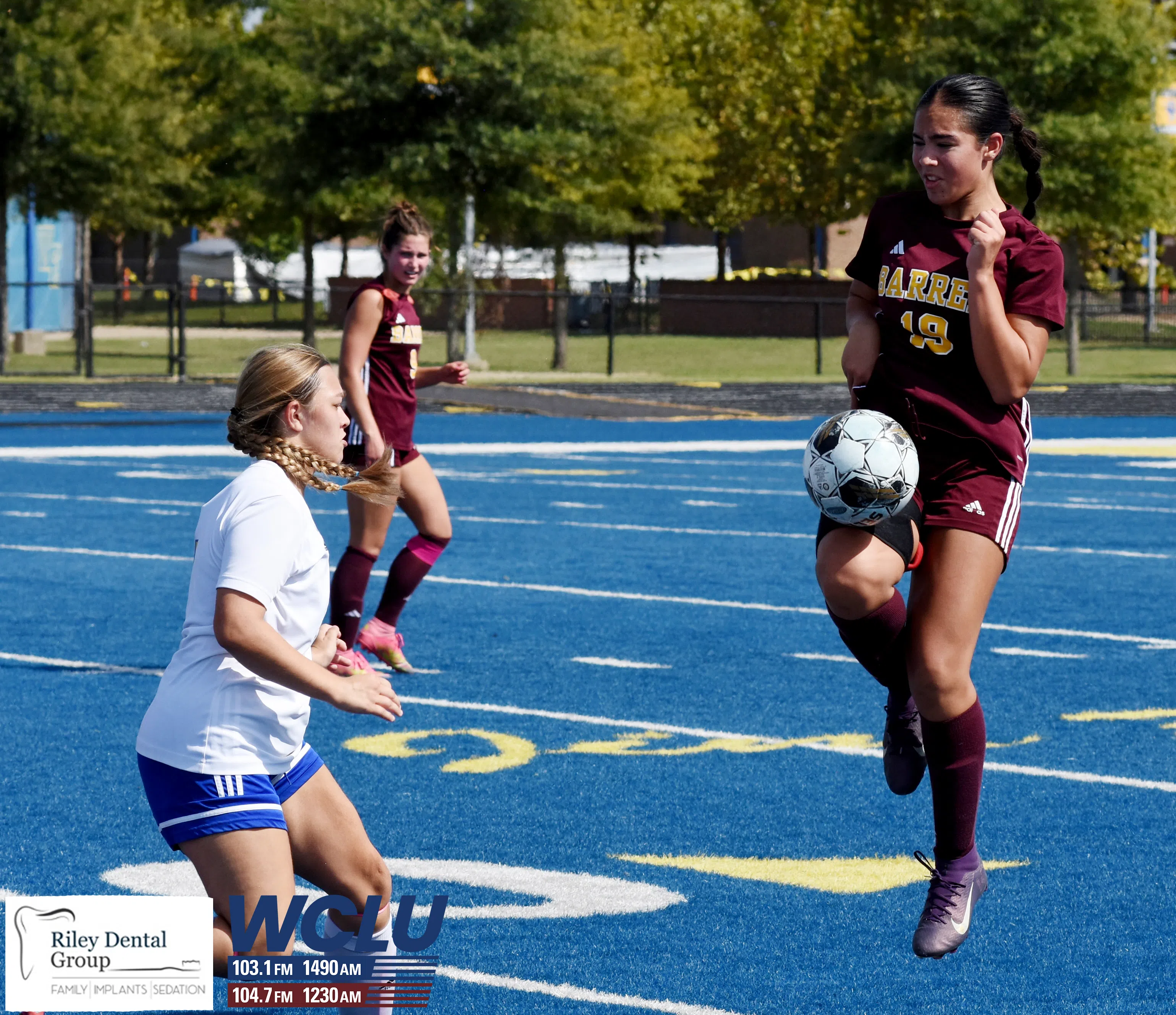 Barren County’s Haylin Adams dribbles the ball against Warren East in the 15th District Tournament. The Trojanettes lost, 2-1. James Brown/WCLU Sports