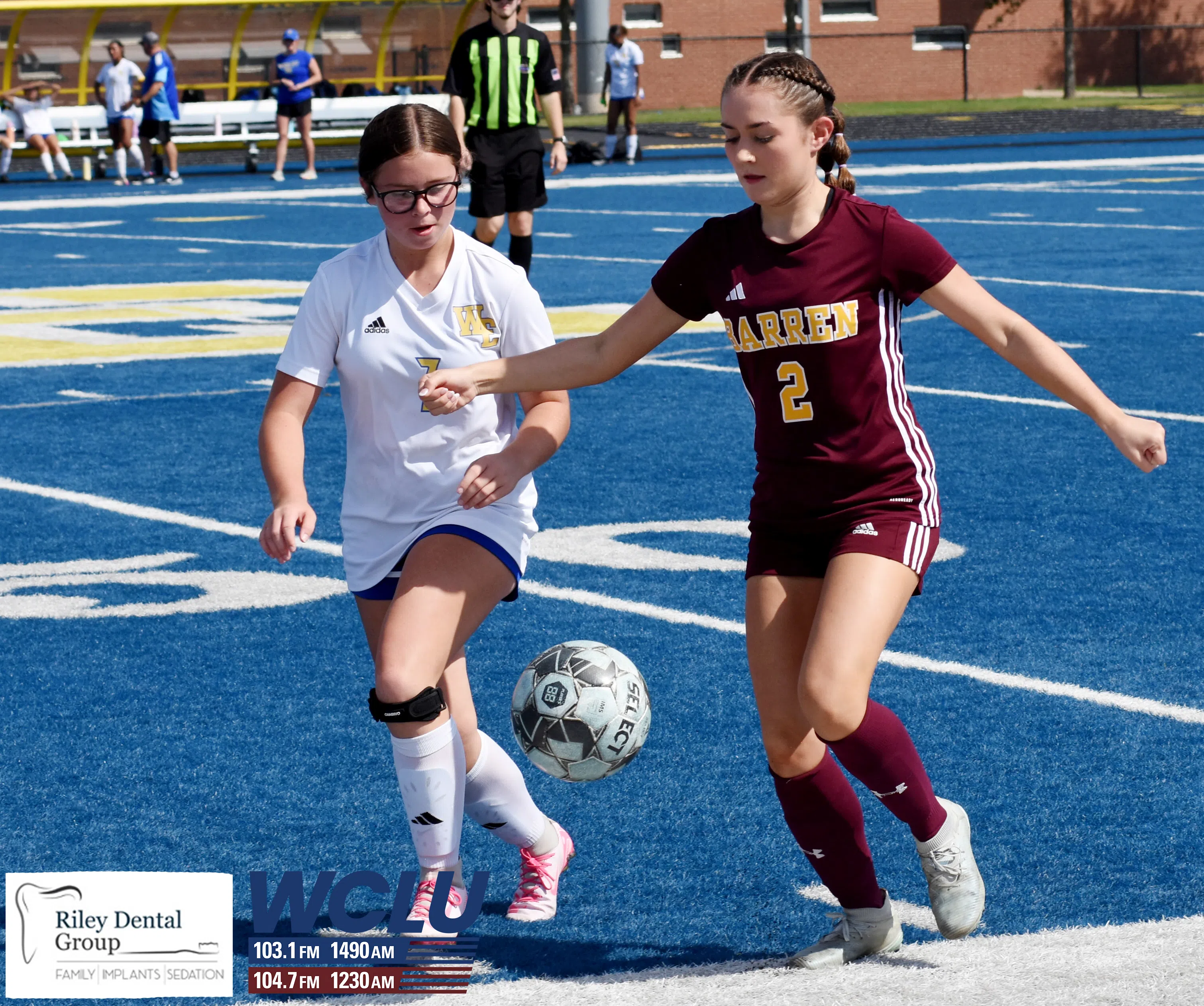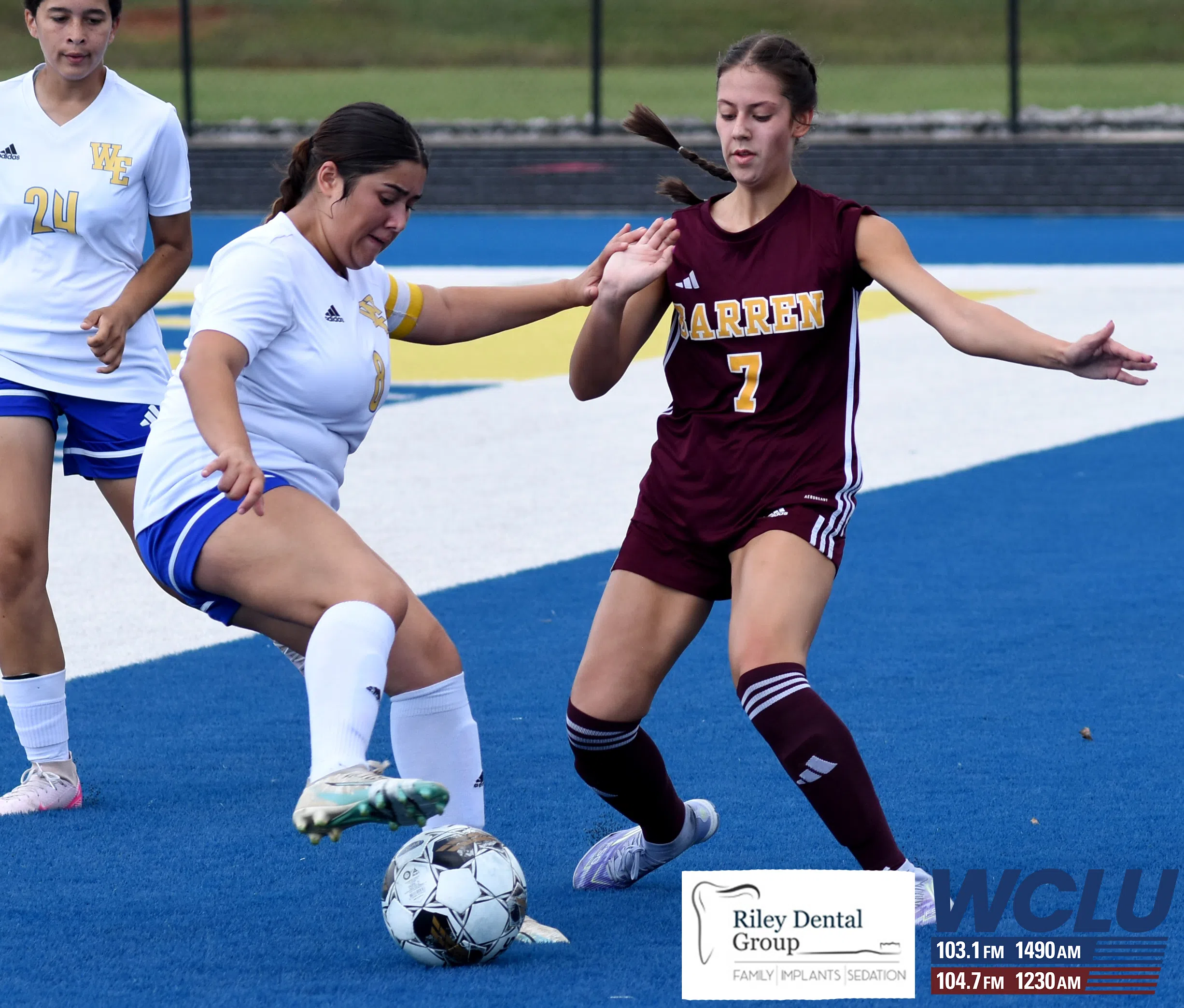 Barren County’s Shelby Byrd battles for the ball against Warren East in the 15th District Tournament. The Trojanettes lost, 2-1. James Brown/WCLU Sports