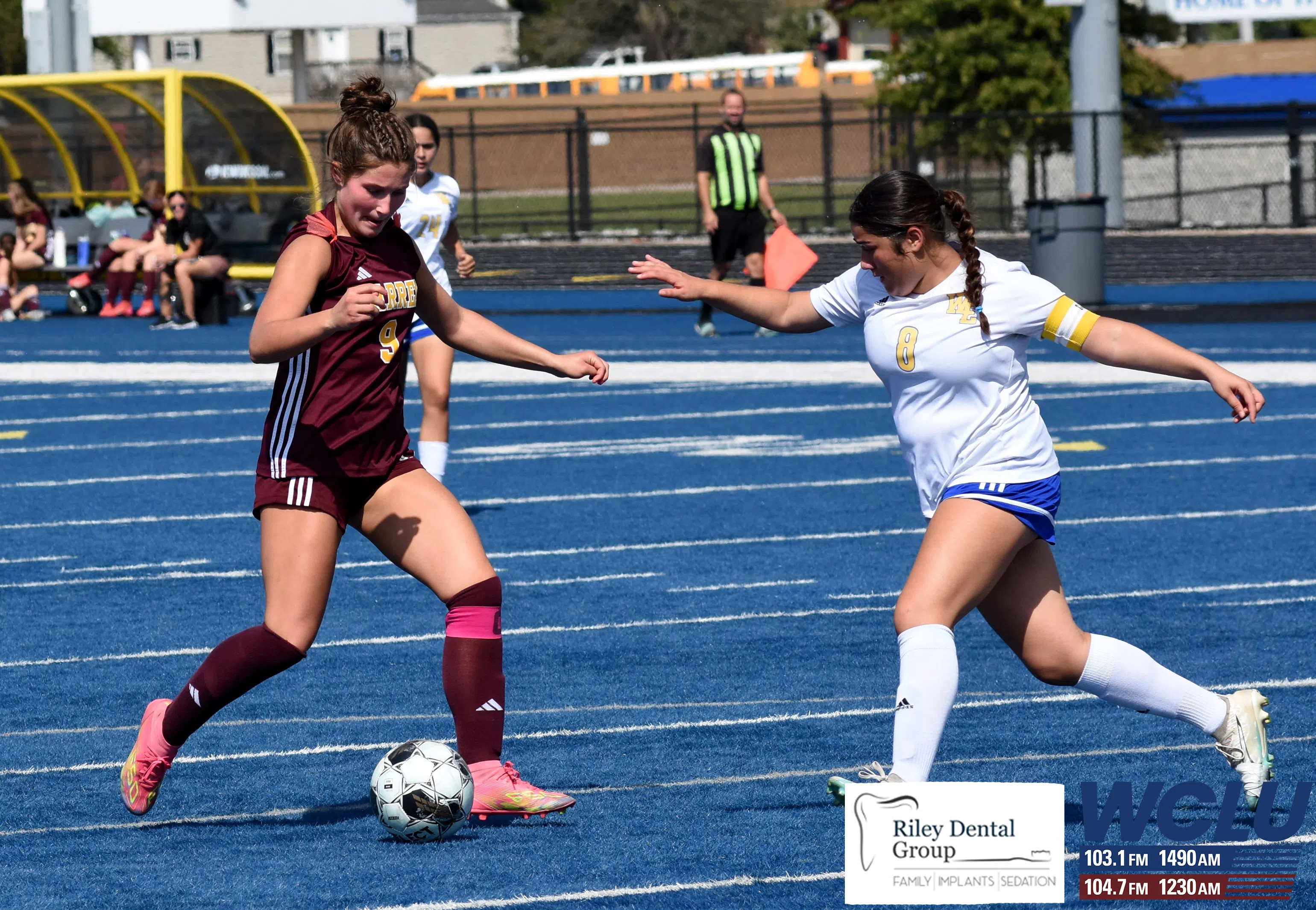 Barren County’s Neela Furlong battles for the ball against Warren East in the 15th District Tournament. The Trojanettes lost, 2-1. James Brown/WCLU Sports