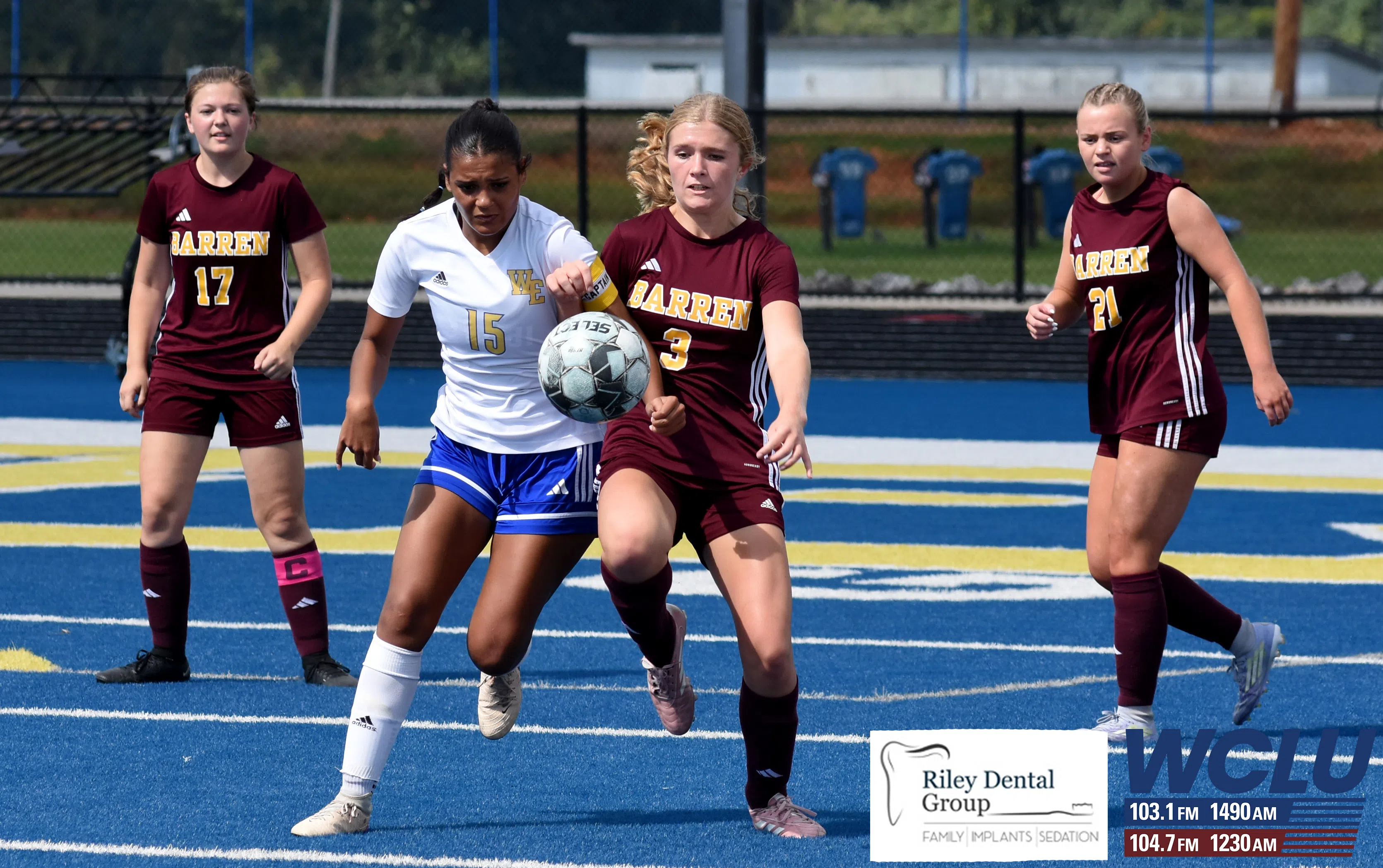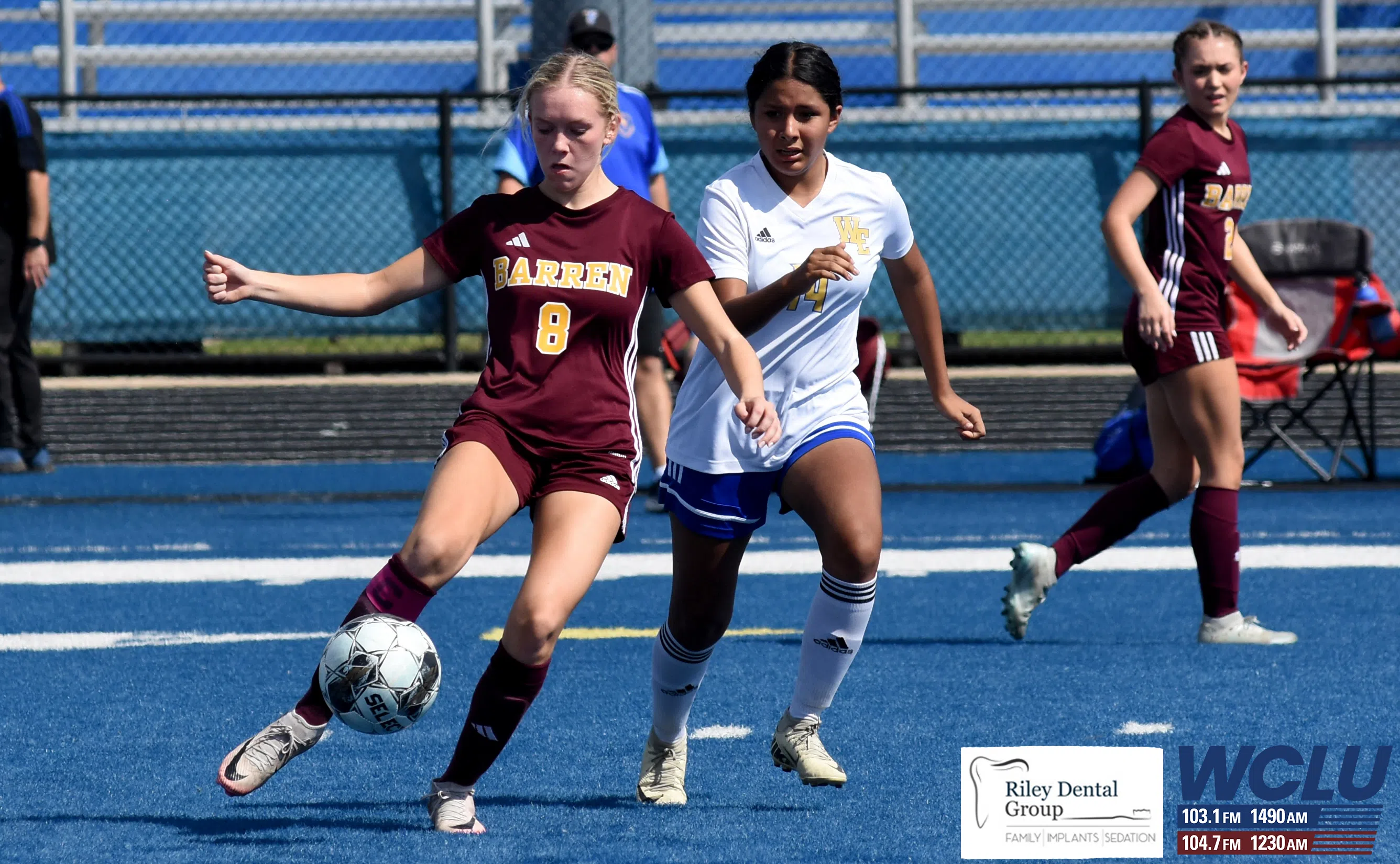 Barren County’s Emma Mouser dribbles the ball against Warren East in the 15th District Tournament. The Trojanettes lost, 2-1. James Brown/WCLU Sports