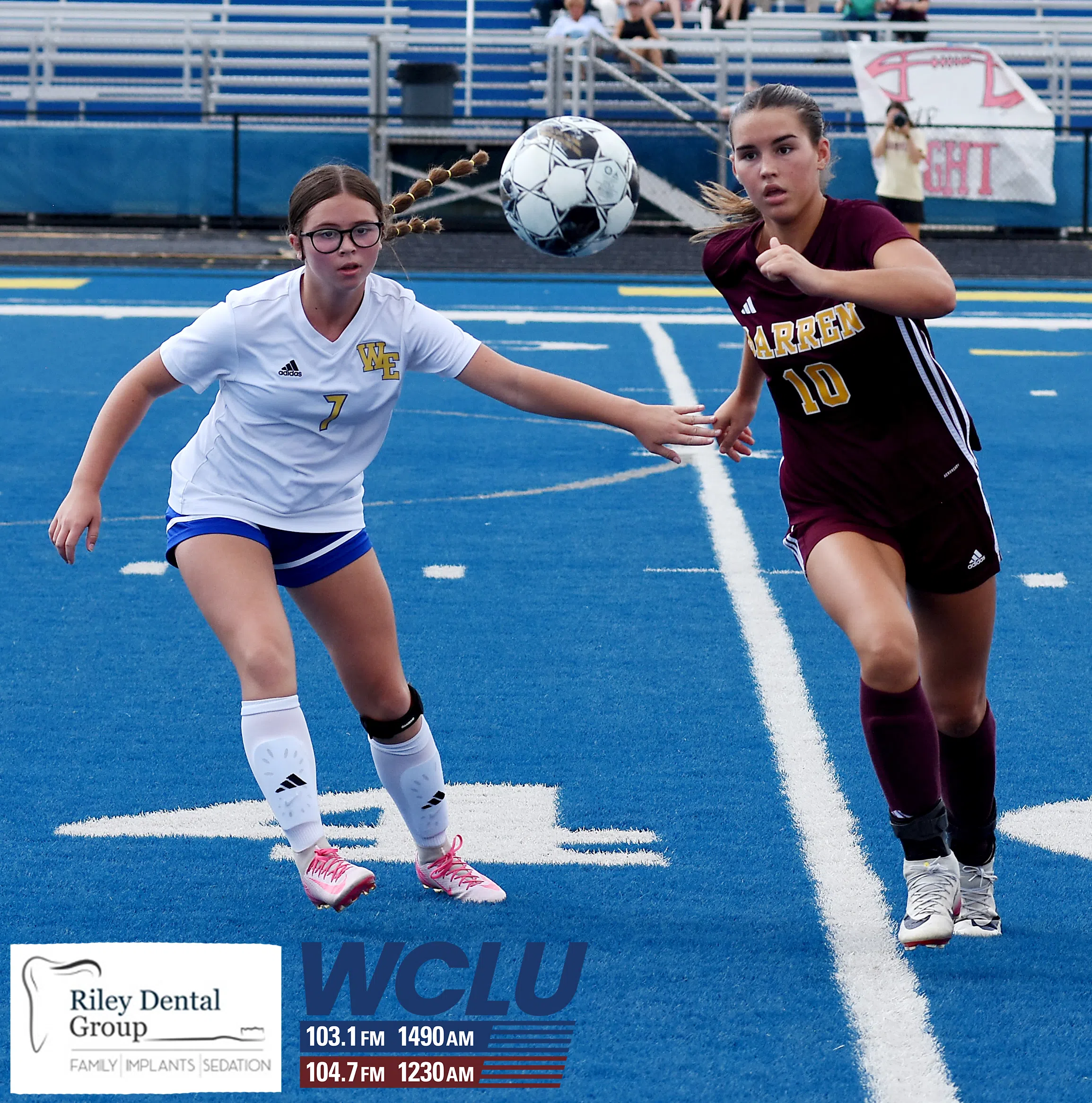 Barren County’s Natalie Somerville battles for the ball against Warren East in the 15th District Tournament. The Trojanettes lost, 2-1. James Brown/WCLU Sports