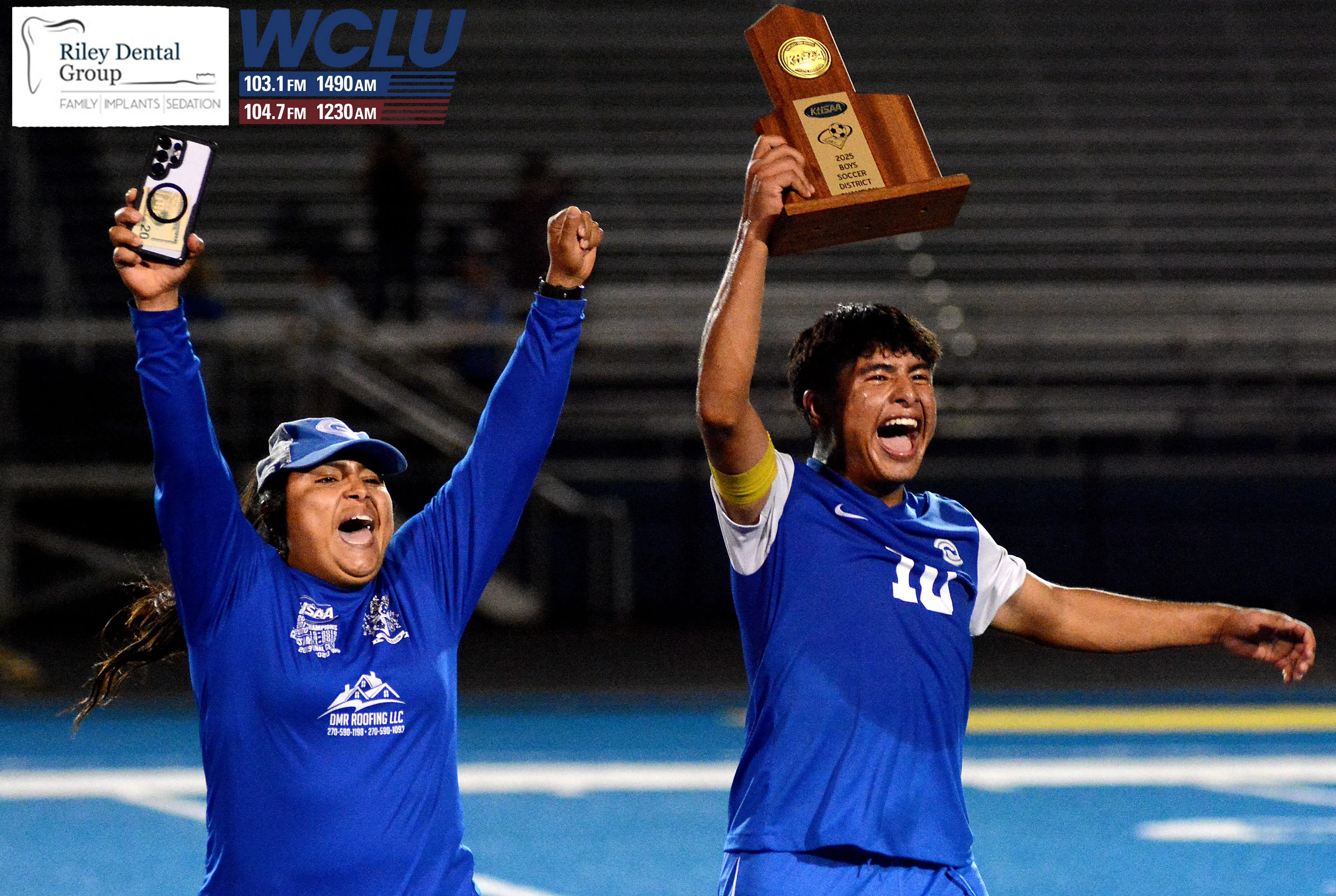 Glasgow’s Jared Malagon holds up the 15th District Soccer championship trophy as he and his mom, assistant coach Fabiola Malagon, celebrate their 4-1 win over Warren East. Auggie Brown/WCLU Sports
