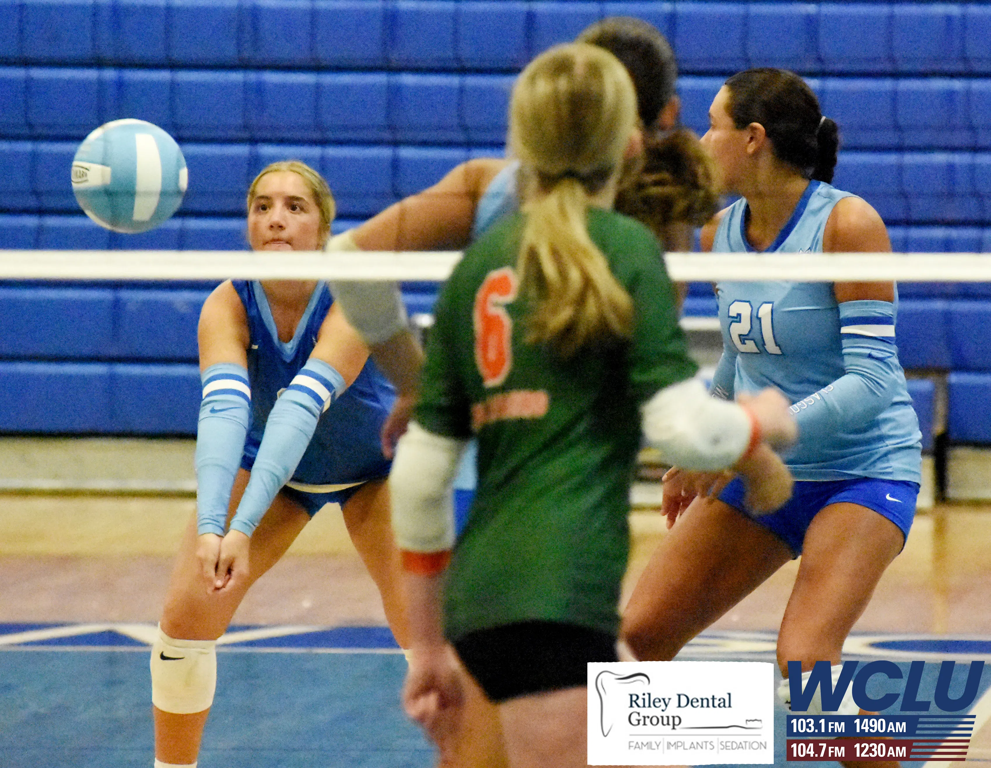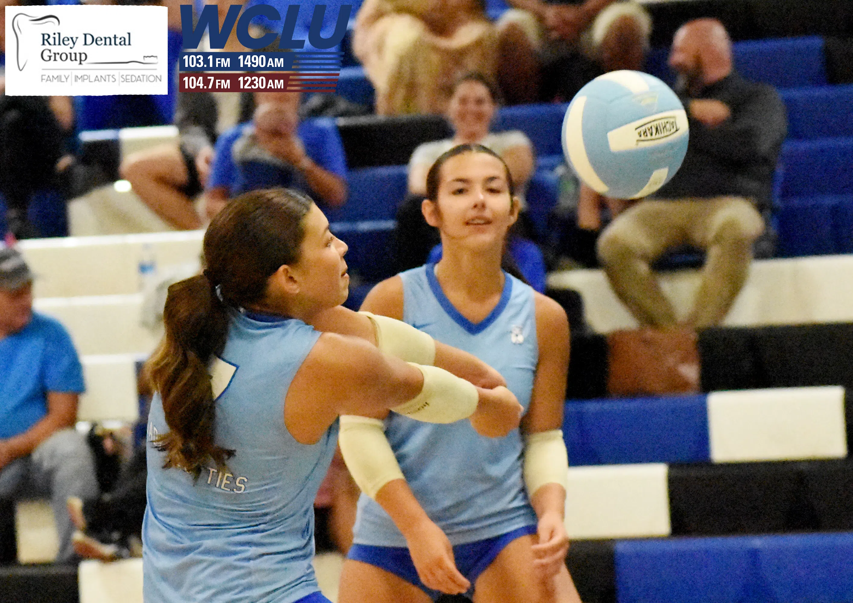 Glasgow’s Preslee Martin sets the ball as Jamesana Soto calls out against Hart County on Senior Night. The Lady Scotties won, 2-0. James Brown/WCLU Sports