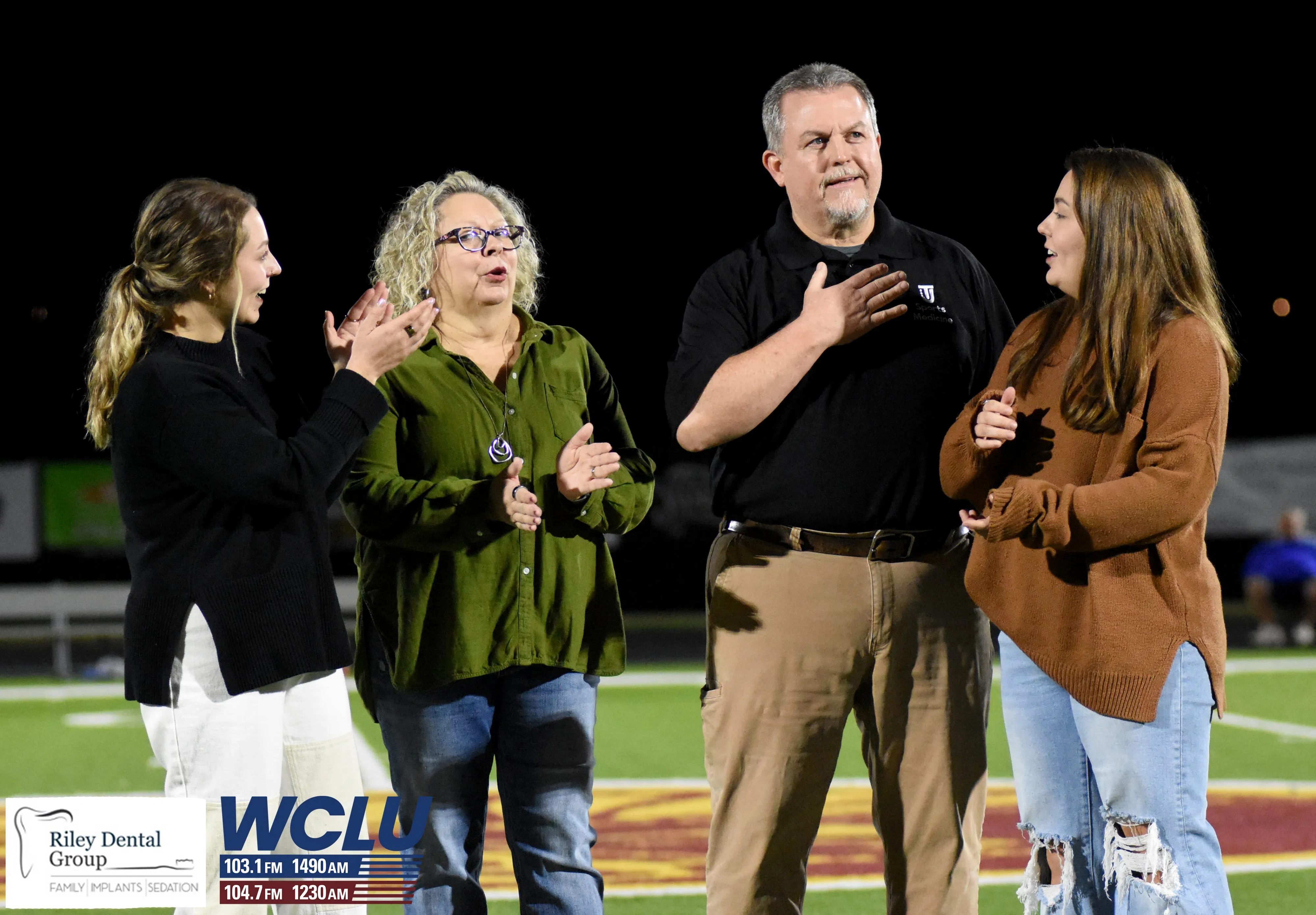 Barren County’s Steele Whitaker listens as his coach speaks against Macon County, Tenn. The Trojans lost, 29-14. James Brown/WCLU Sports