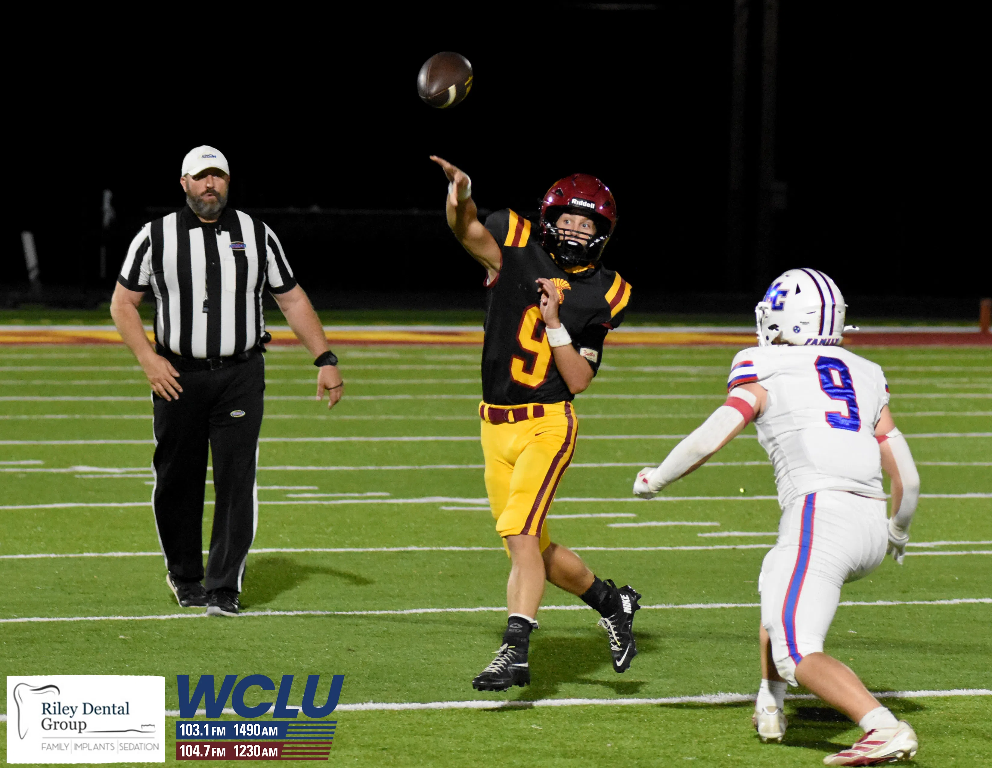 Barren County’s Briggs Harris passes the ball against Macon County, Tenn. The Trojans lost, 29-14. James Brown/WCLU Sports
