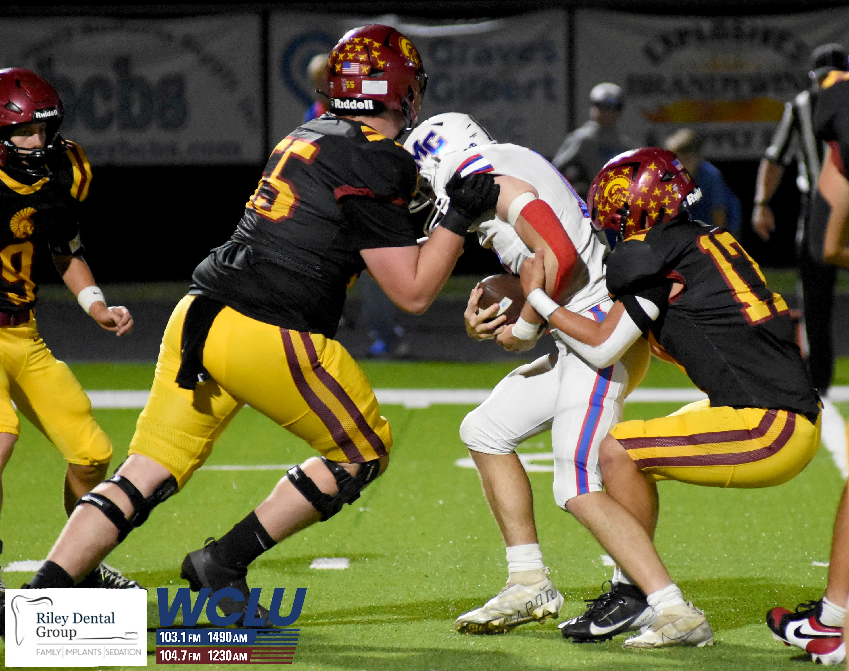 Barren County’s Corbin Wells, Braxton Carnes and Cameron Crawford combine for a tackle against Macon County, Tenn. The Trojans lost, 29-14. James Brown/WCLU Sports