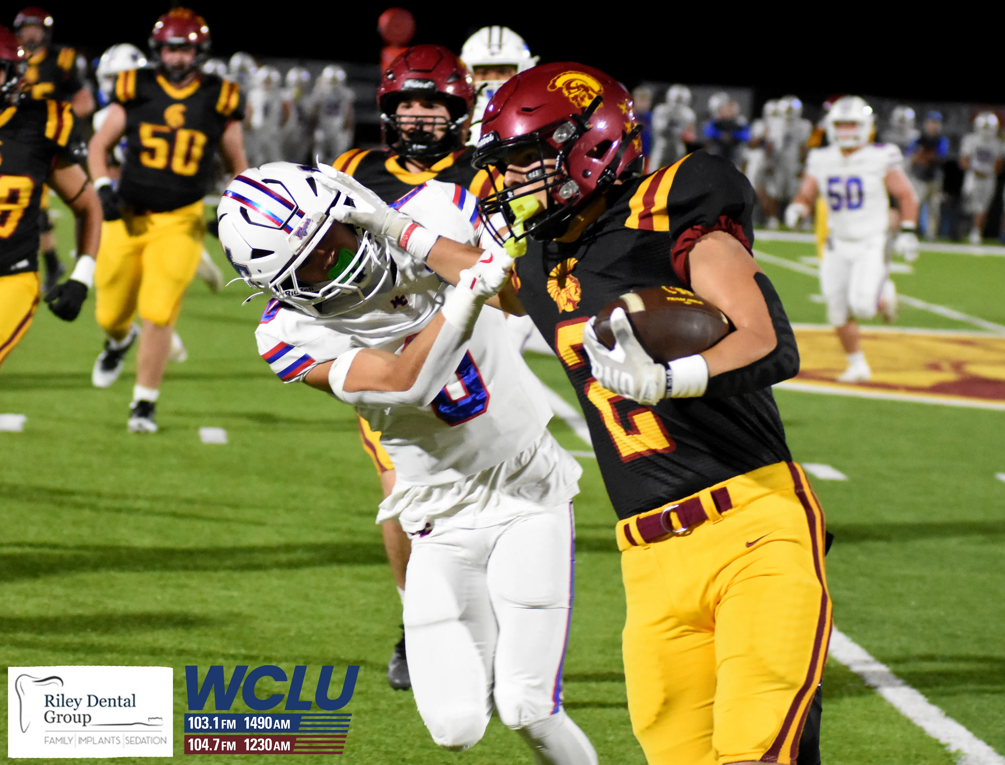 Barren County’s Greyson Billingsley and Baylor Browning combine to make a tackle against Macon County, Tenn. The Trojans lost, 29-14. James Brown/WCLU Sports