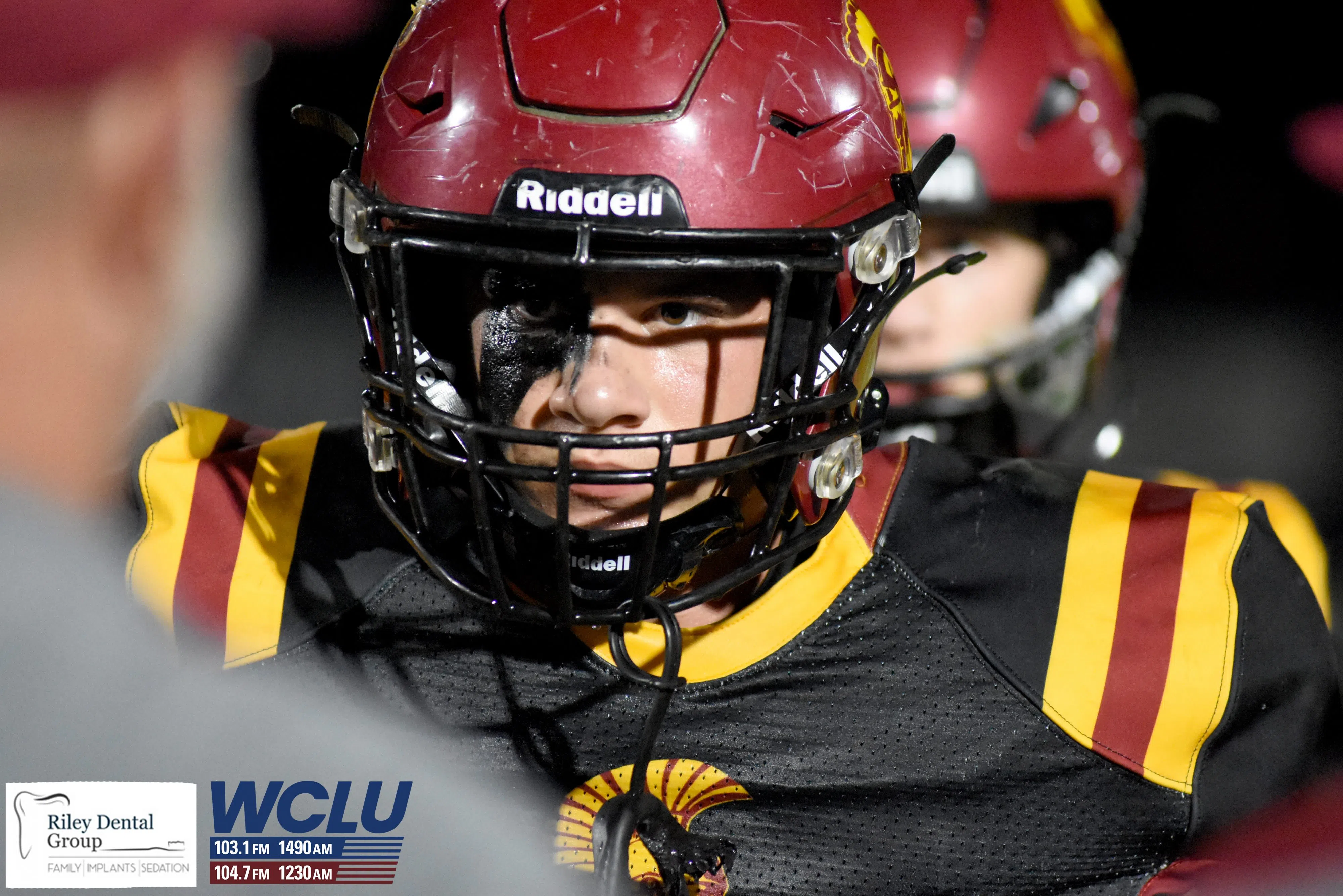 Barren County’s Steele Whitaker listens as his coach speaks against Macon County, Tenn. The Trojans lost, 29-14. James Brown/WCLU Sports