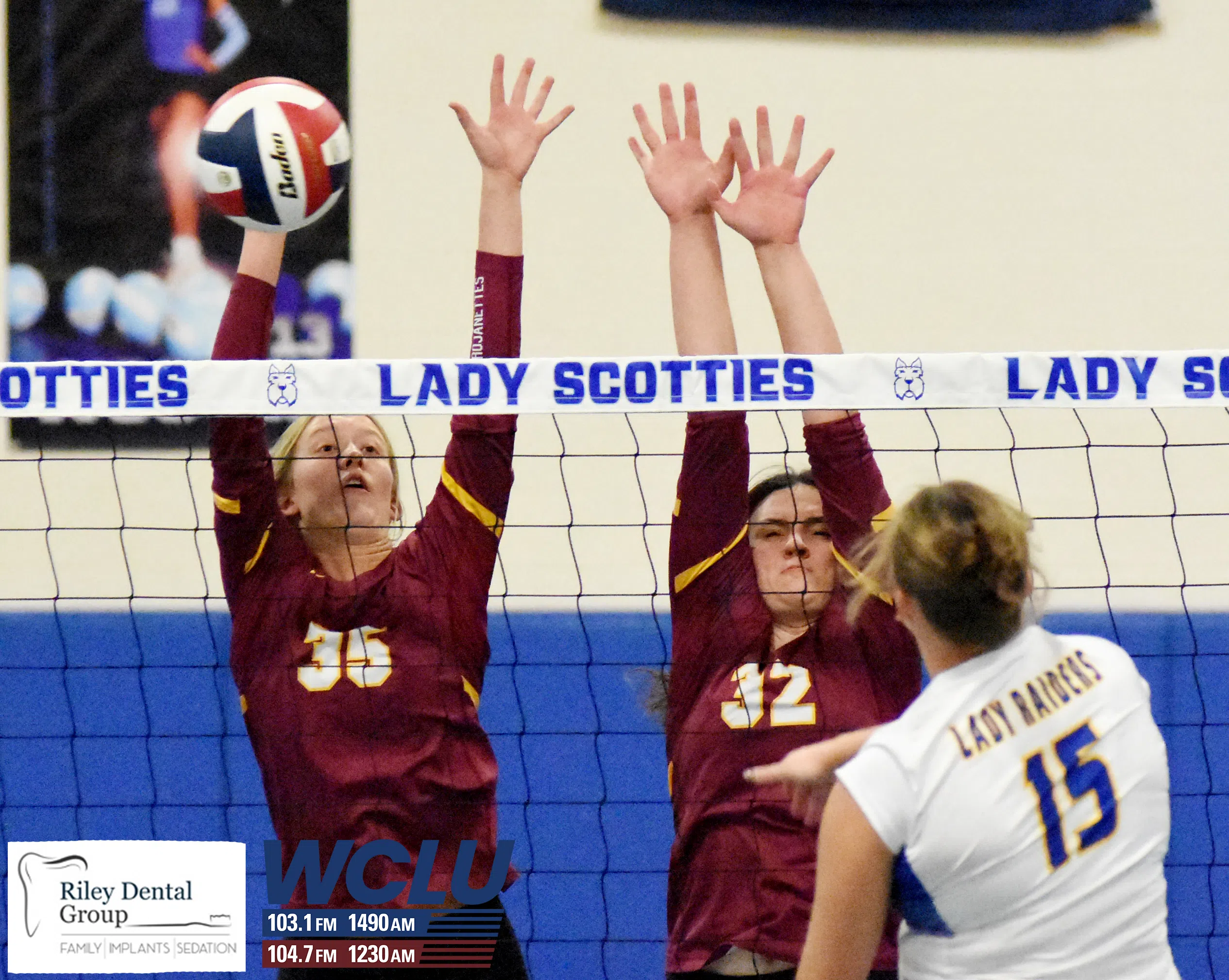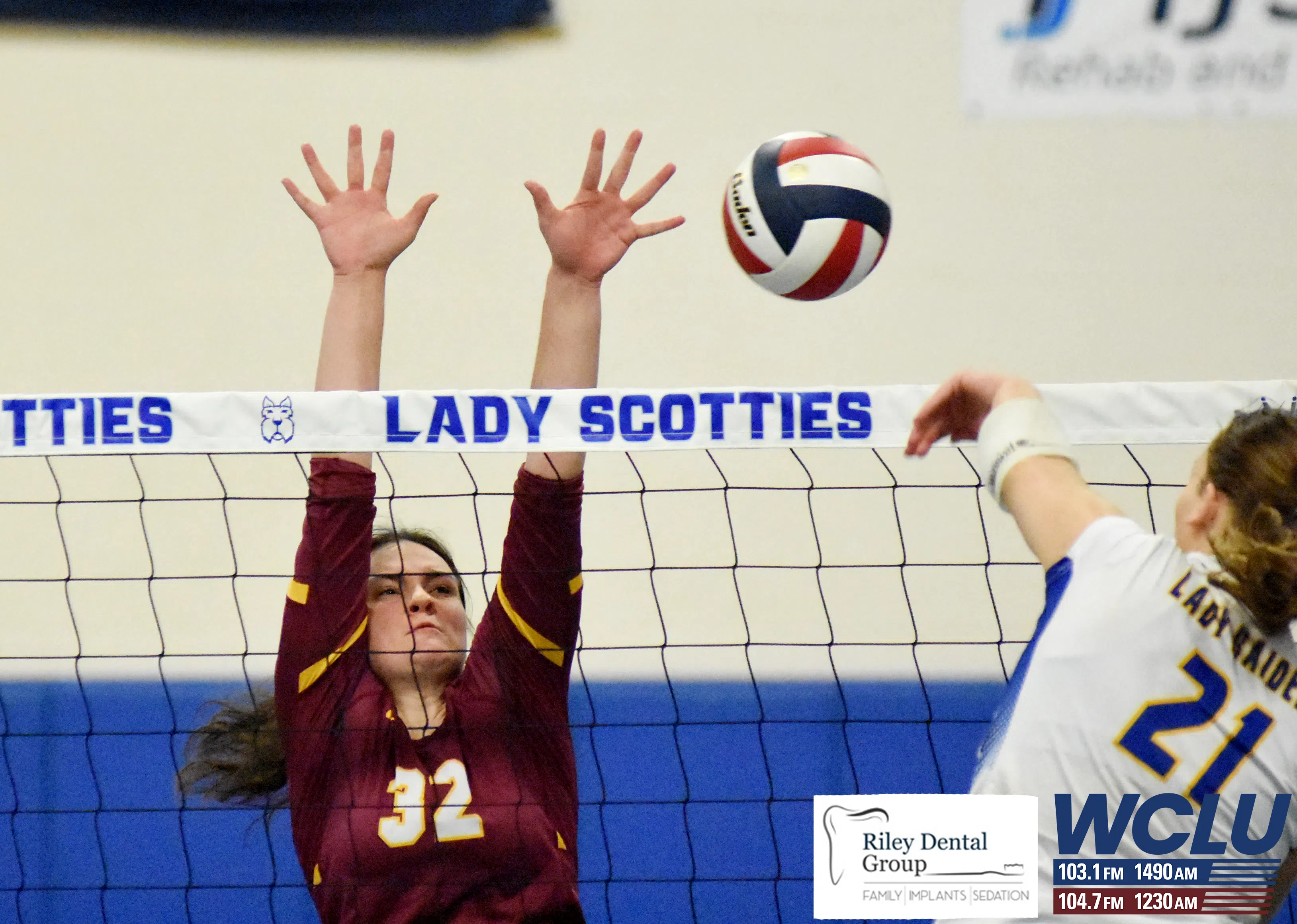 Barren County’s Adley Cunningham defends at the net against Warren East in the 15th District Volleyball Tournament. The Trojanettes lost, 3-0. James Brown/WCLU Sports