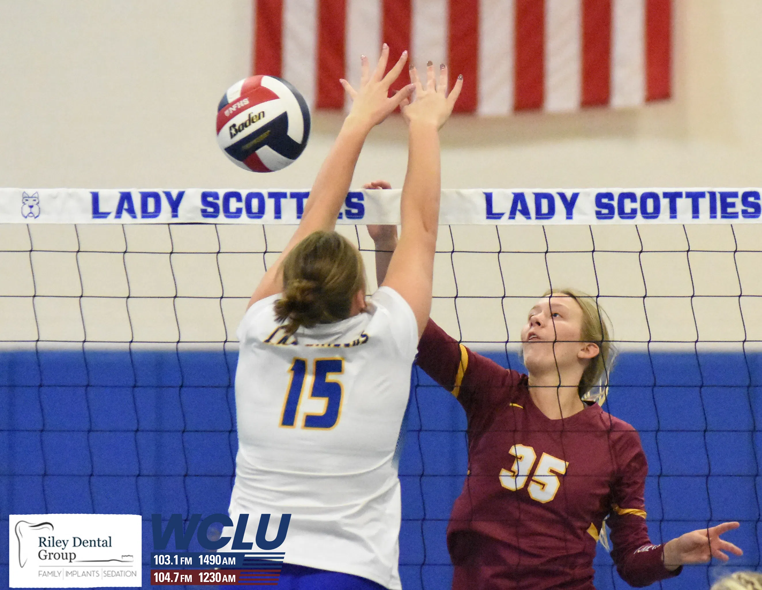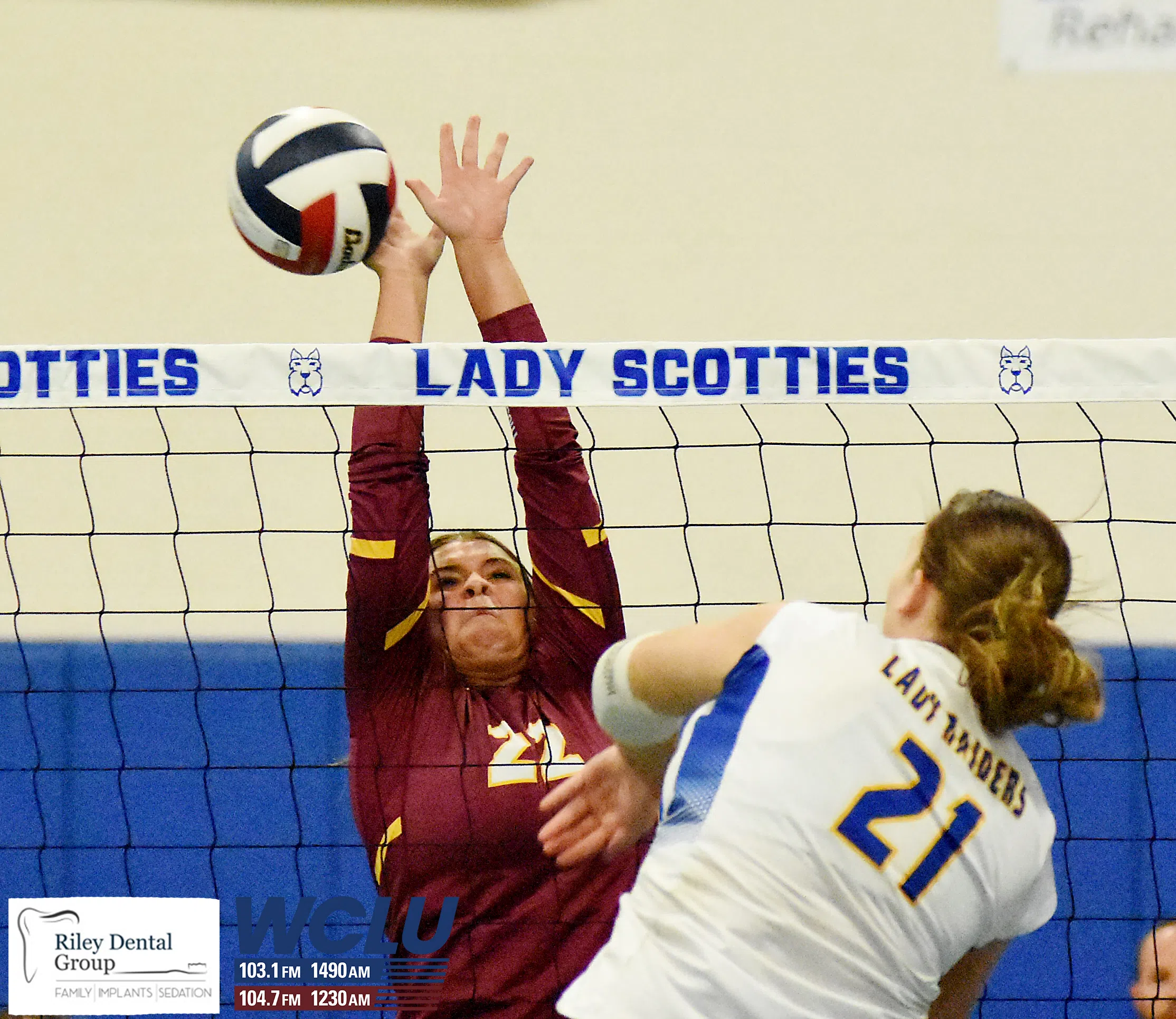 Barren County’s Adley Cunningham defends at the net against Warren East in the 15th District Volleyball Tournament. The Trojanettes lost, 3-0. James Brown/WCLU Sports
