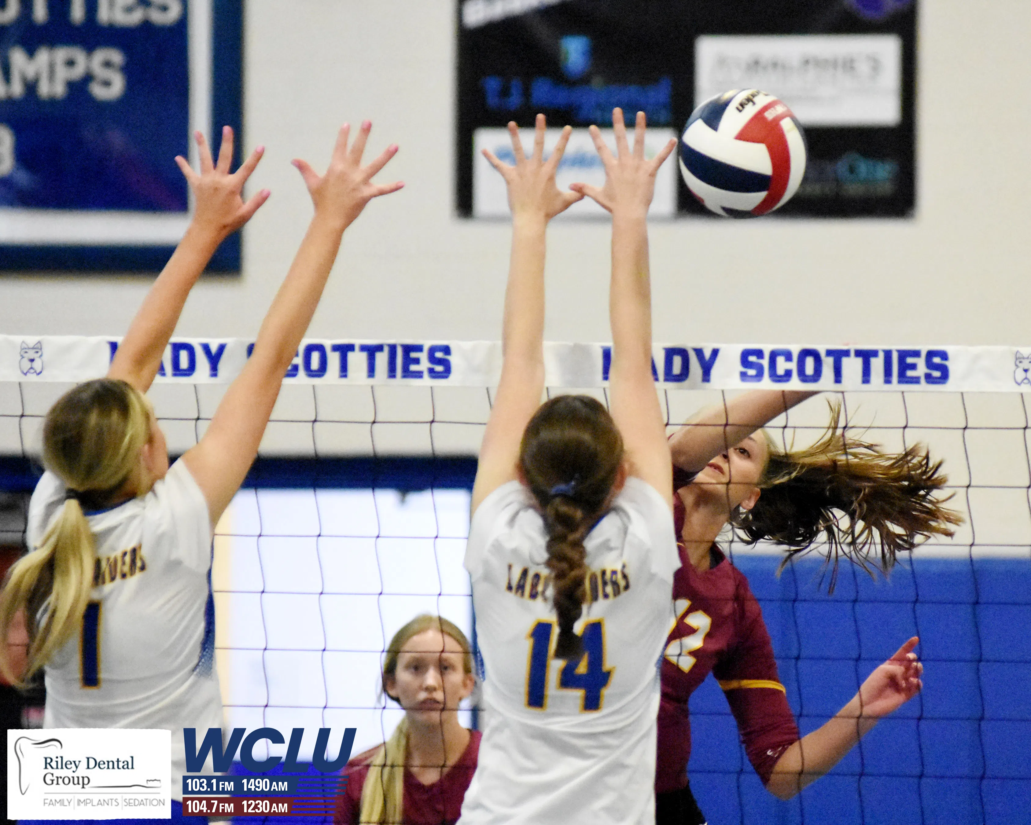 Barren County’s Ann Ashley Atkinson hits at the net against Warren East in the 15th District Volleyball Tournament. The Trojanettes lost, 3-0. James Brown/WCLU Sports