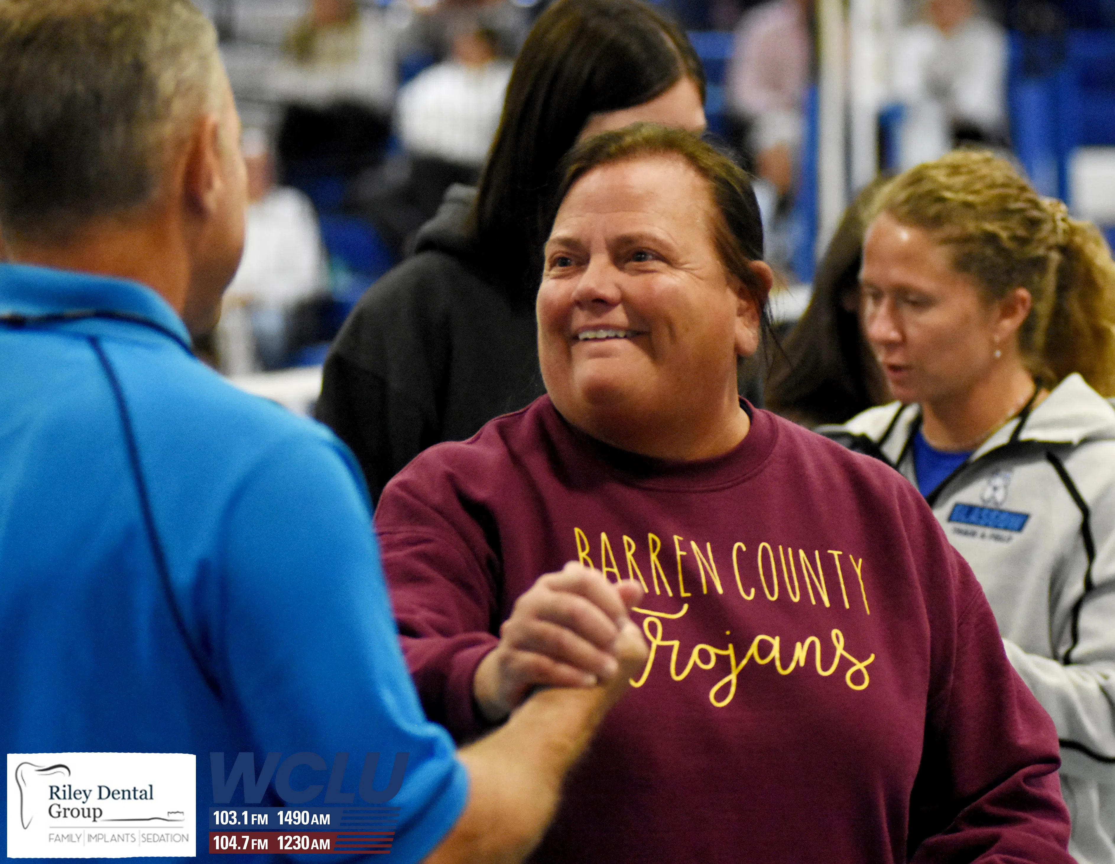 Barren County coach Robin Bartley shares hand shake with volleyball official and former basketball coach Bart Flener. The game against Warren East in the 15th District Volleyball Tournament was Bartley’s last as head coach. James Brown/WCLU Sports
