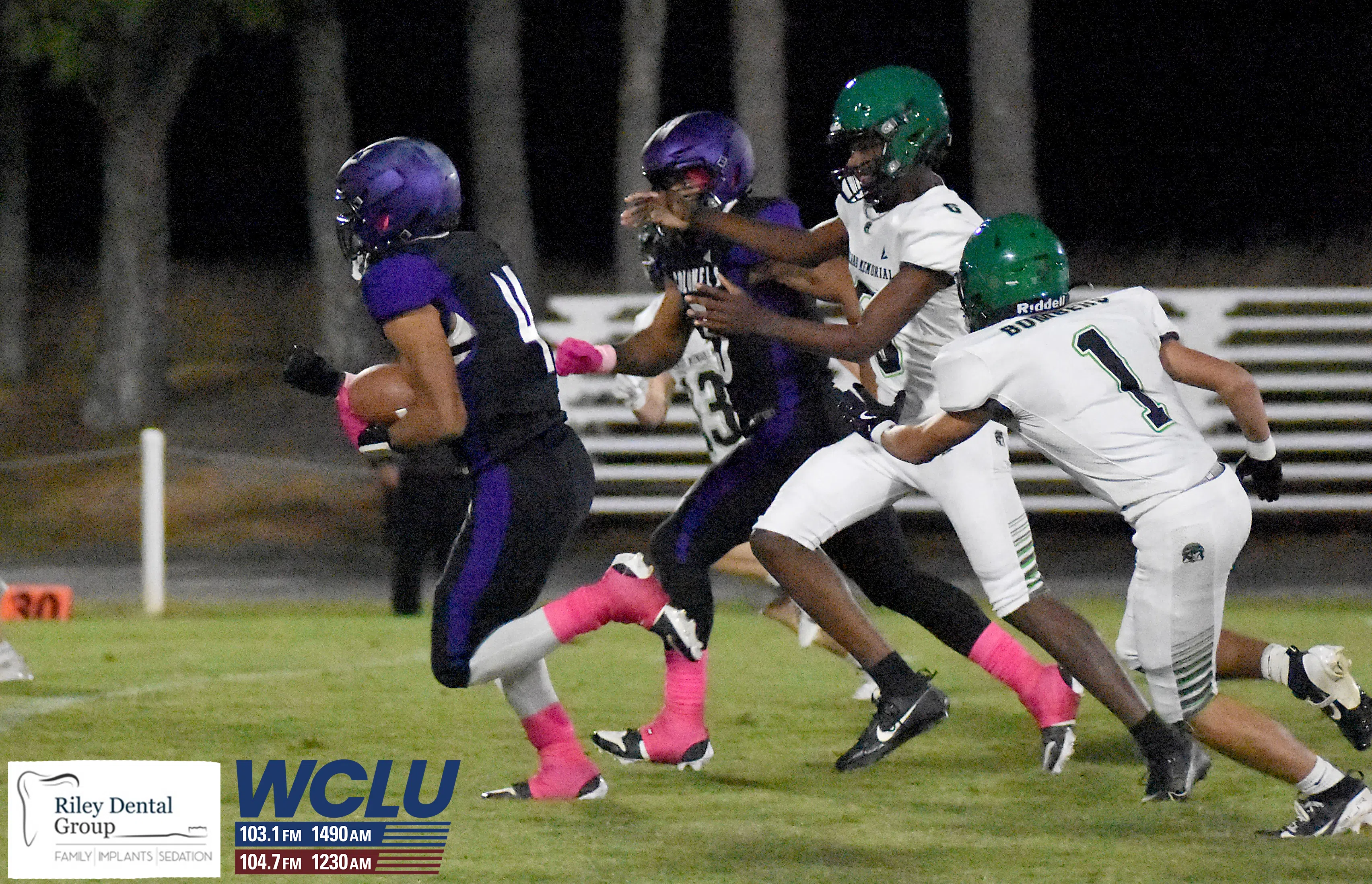 Caverna’s Kenyon Martin, Tyson Martin and Taviane Alexander combine to make a tackle against Ballard Memorial. The Colonels won, 36-0. James Brown/WCLU Sports