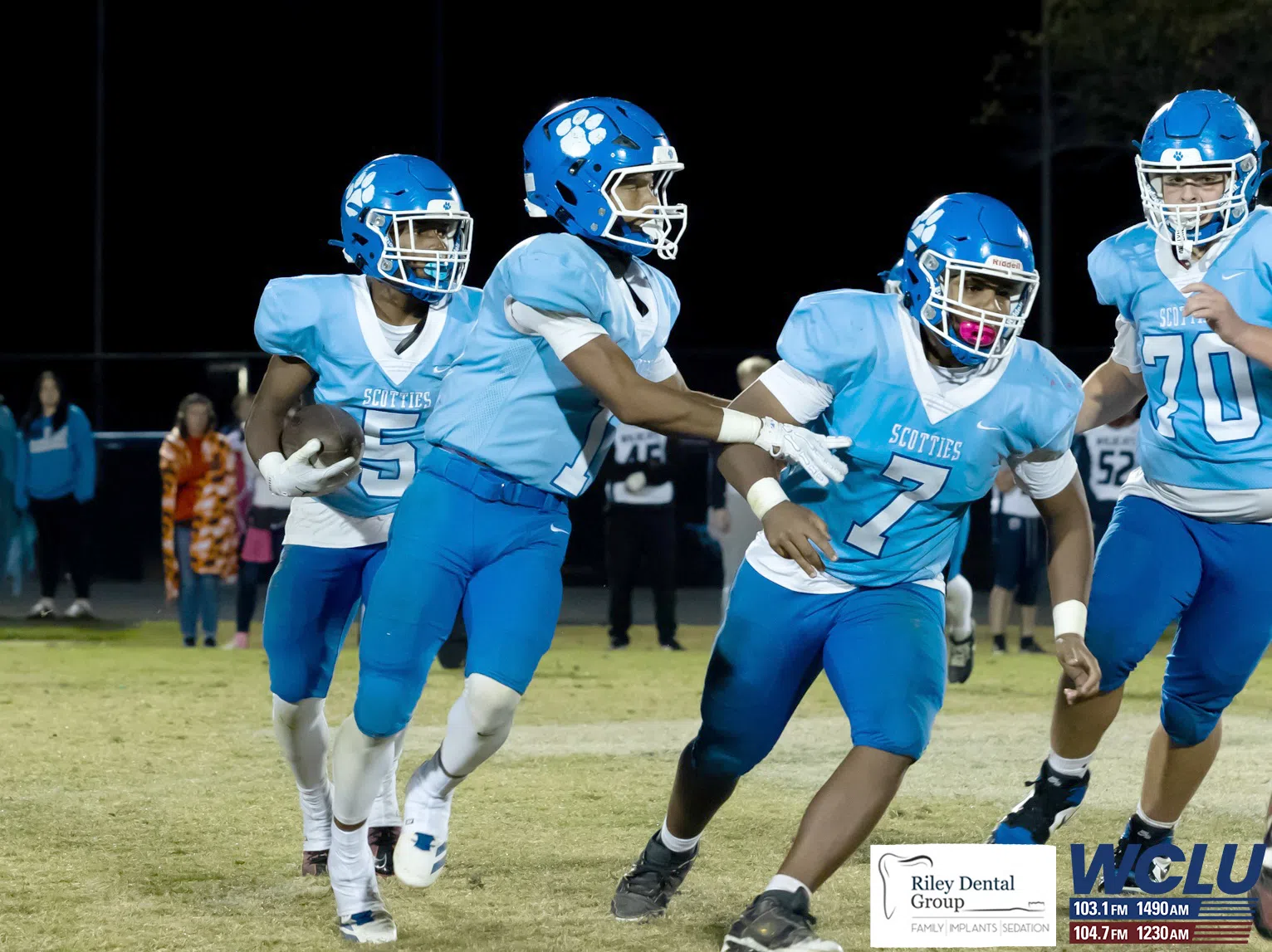 Glasgow’s Jaithan Franklin and Jaylen Bradley lead as Kaebran Jones runs with the football against Edmonson County. The Scotties won, 57-0. Addie McCoy/For WCLU Sports