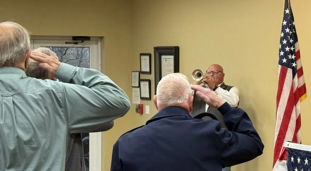 For the 19th year, veterans gathered inside the South Central Bank Operations Center for the annual Veterans Day breakfast on Nov. 10. Robbie Fudge performed Taps during the brief ceremony. Michael Crimmins/Glasgow News 1