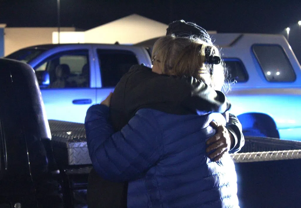 Cody Morrison got out of his truck that was stopped in the Walmart parking lot on Dec. 3 to hug Crystal James (blue coat) after she gifted him $100 as part of the Let Hope In event. Michael Crimmins/Glasgow News 1.