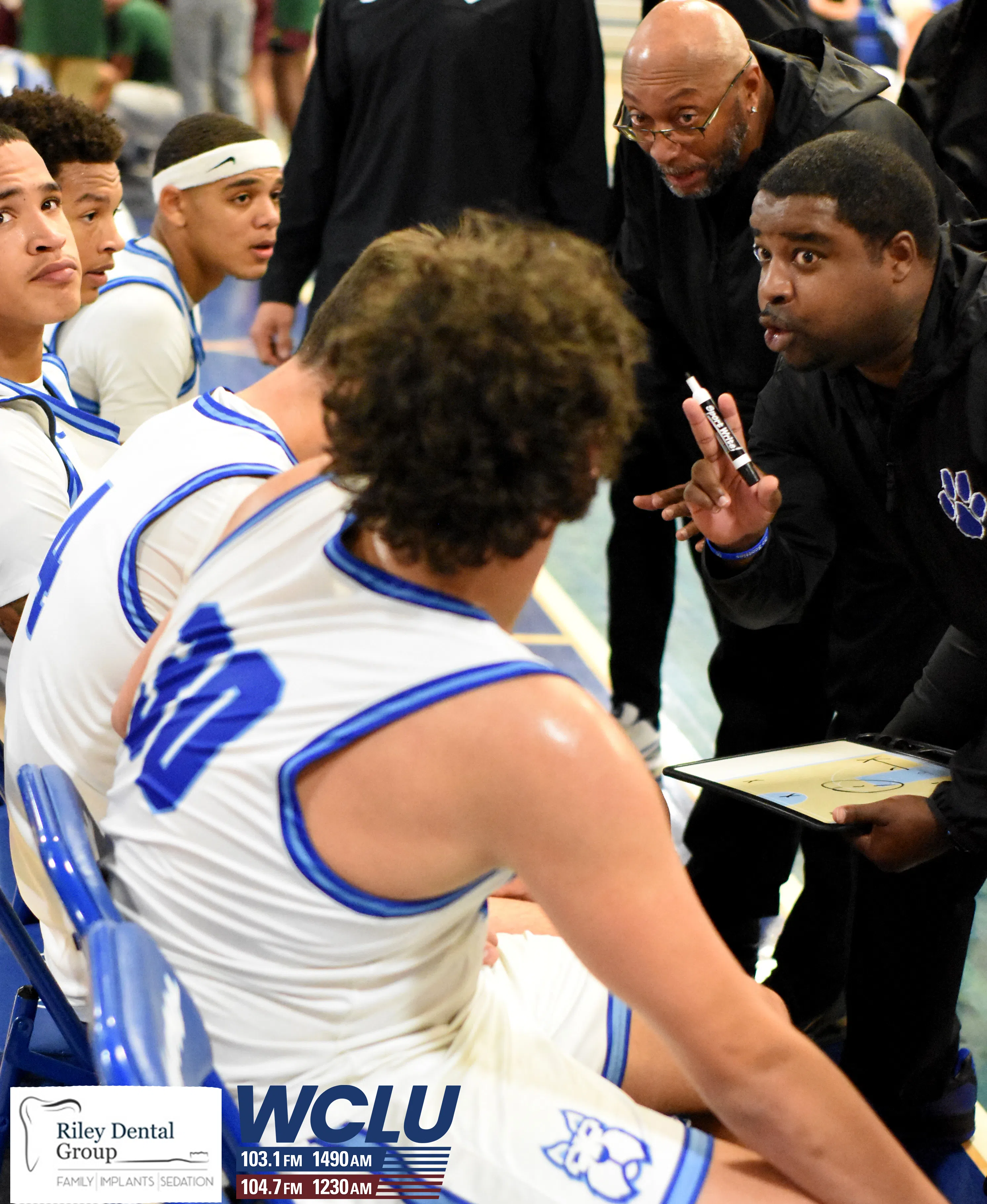 Glasgow Scotties coach Brandon Stockton talks to his team during a time out against Greenwood. The Scotties won, 65-62. James Brown/WCLU Sports