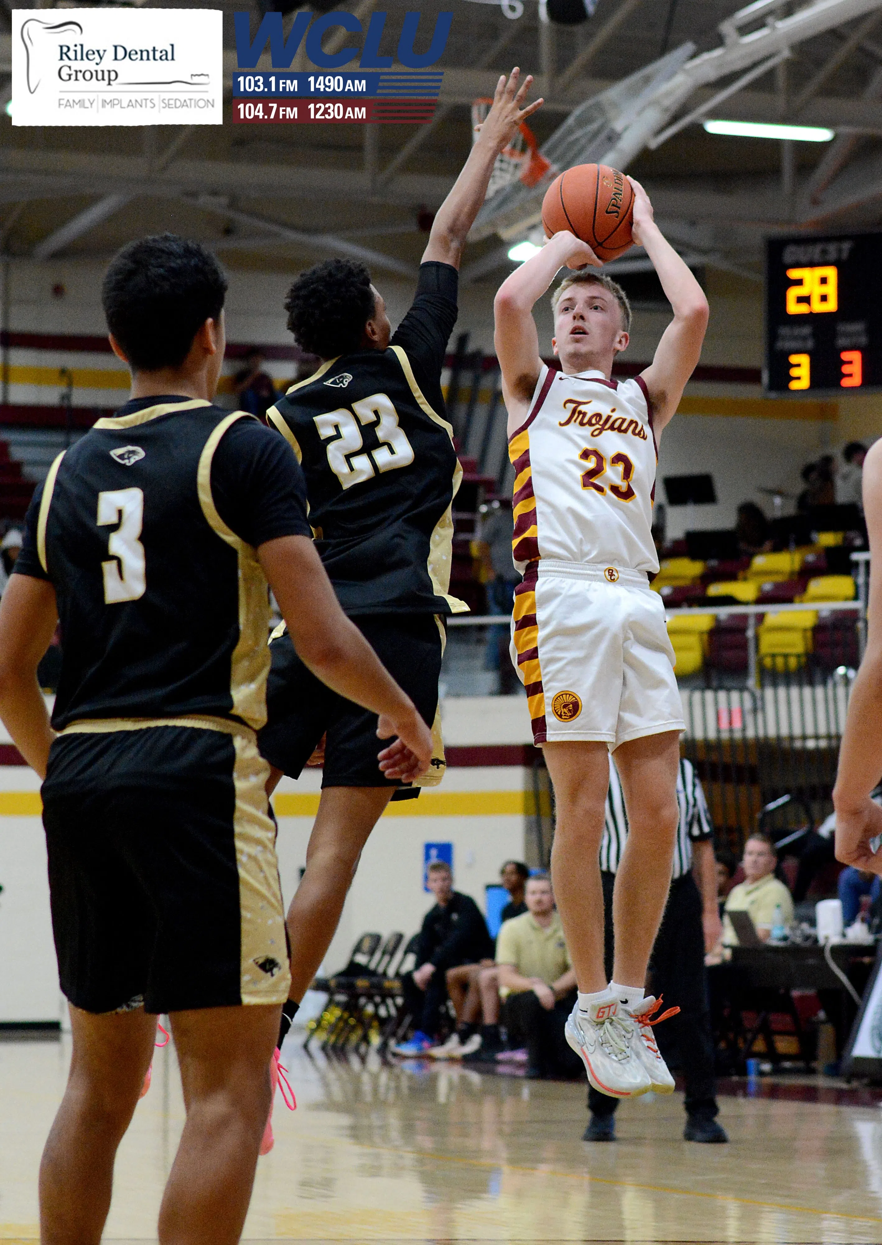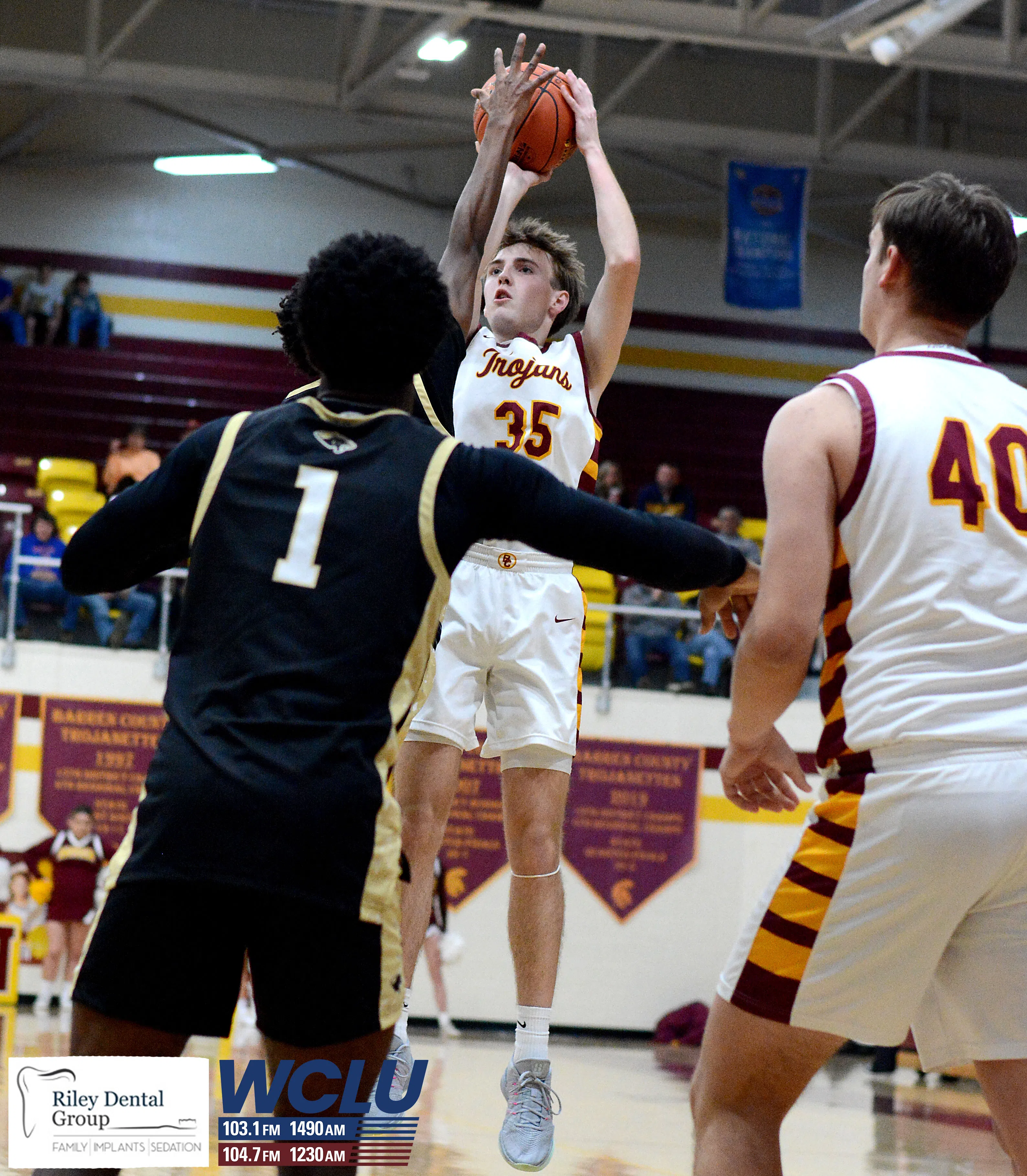 Barren County’s Kade Hardy shoots a 3-pointer against Russellville. The Trojans won, 65-46. Auggie Brown/WCLU Sports