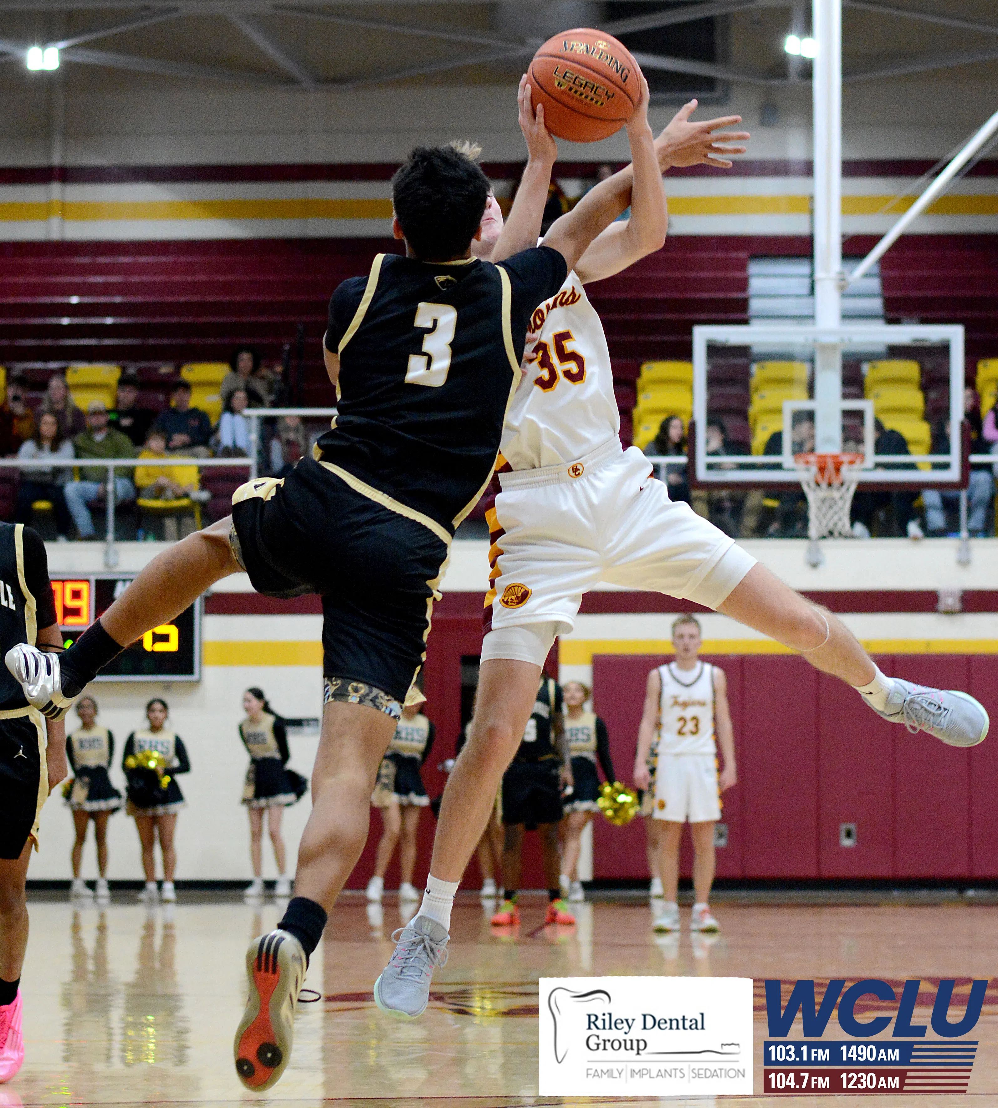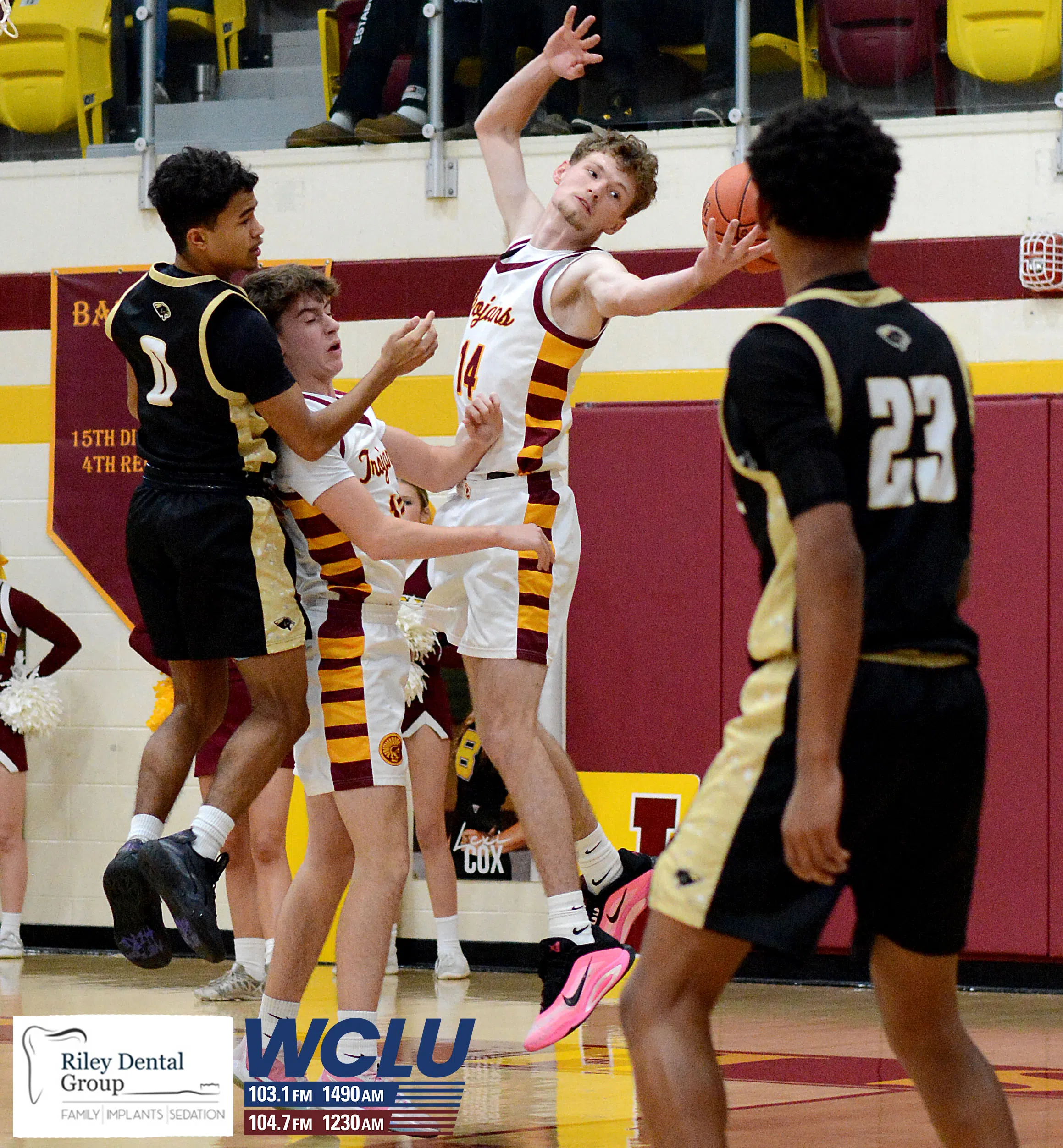 Barren County’s Jaxson Byrd grabs a rebound against Russellville. The Trojans won, 65-46. Auggie Brown/WCLU Sports