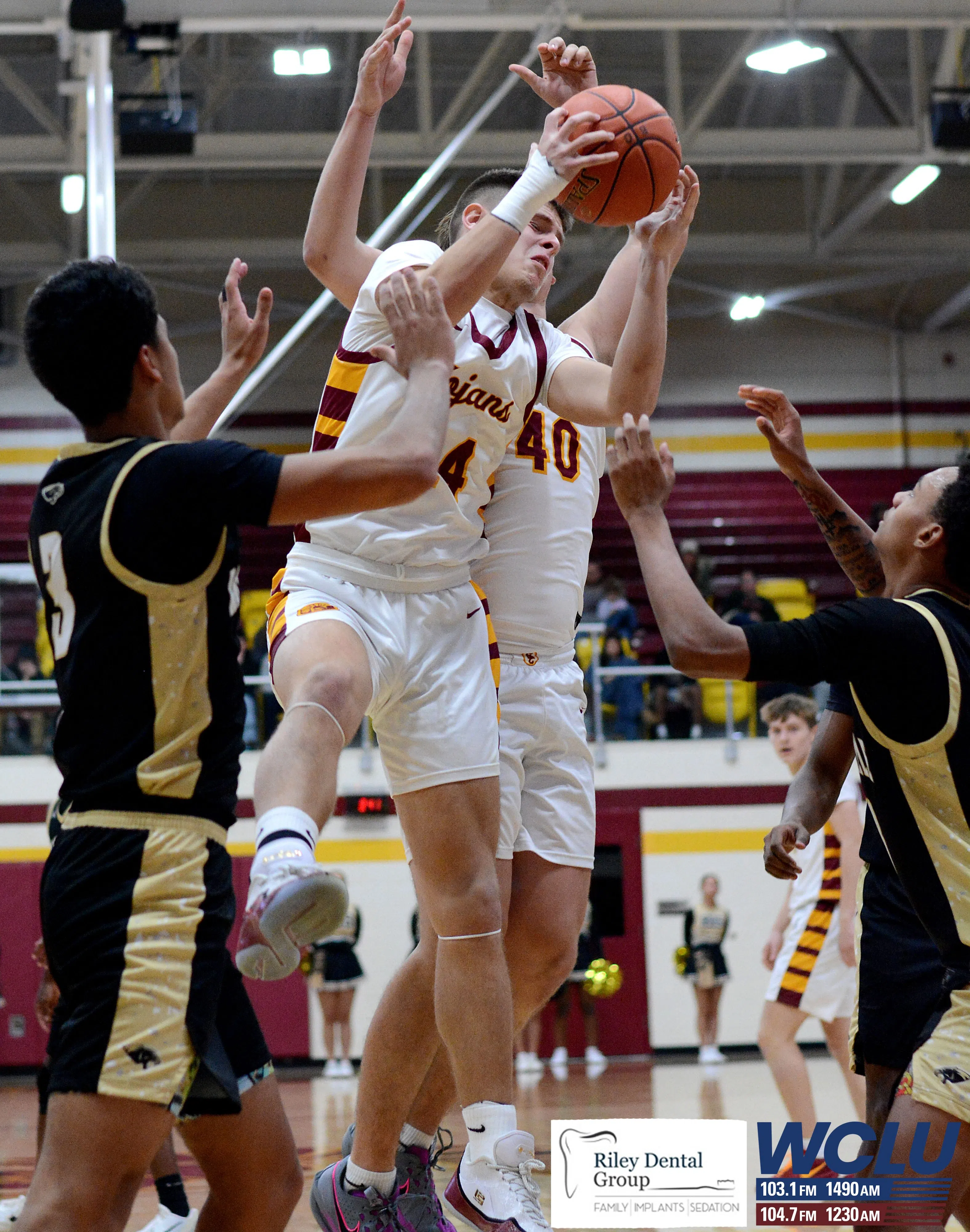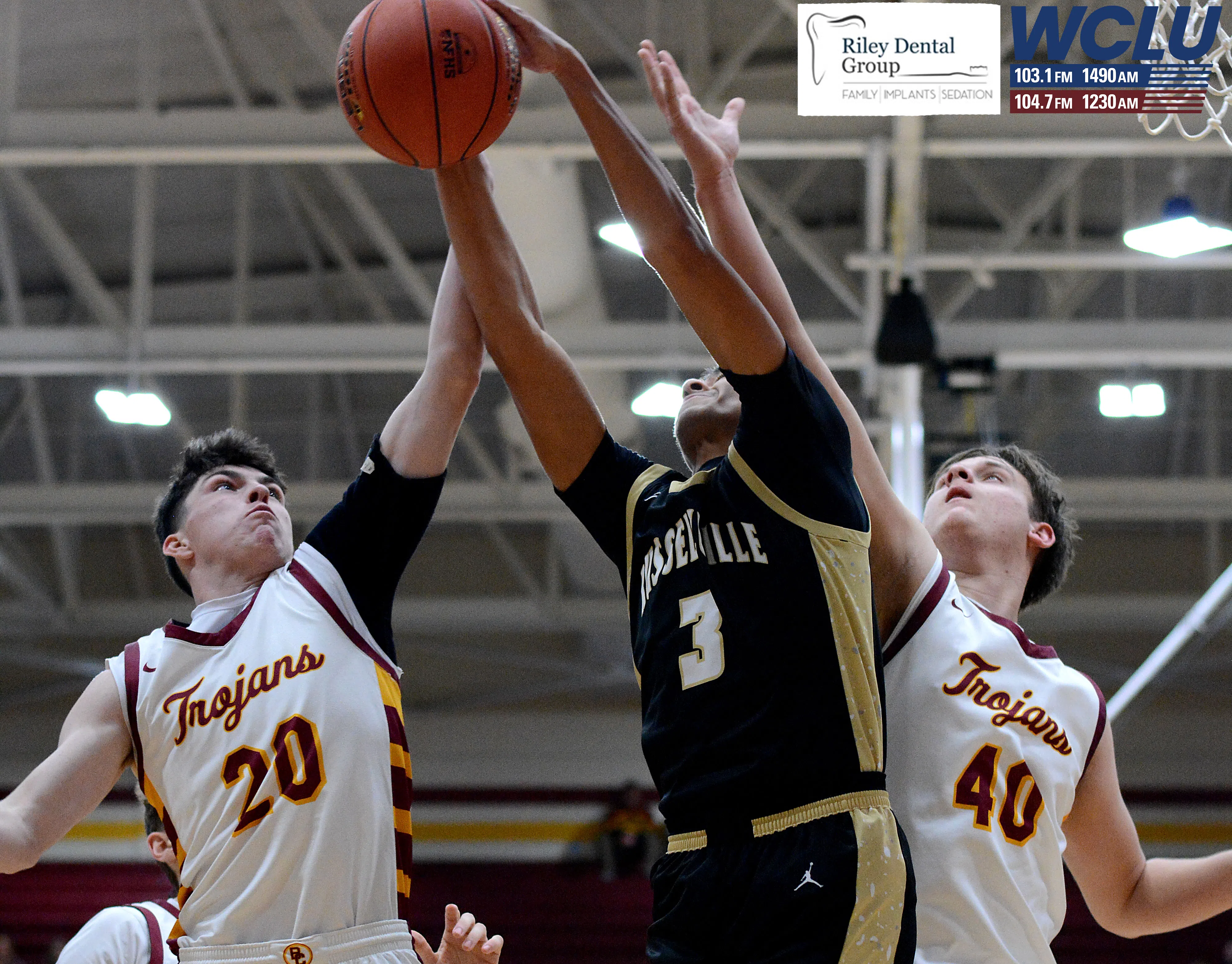 Barren County’s Carson Browning and Gavin Nunn battle for a rebound against Russellville. The Trojans won, 65-46. Auggie Brown/WCLU Sports