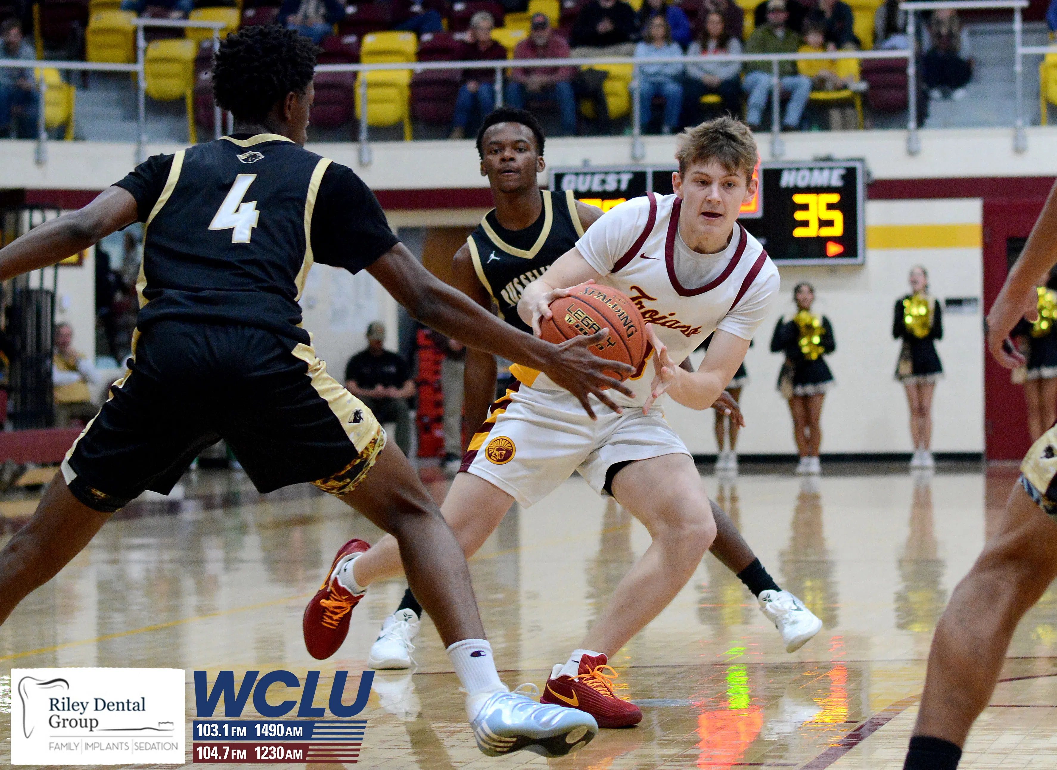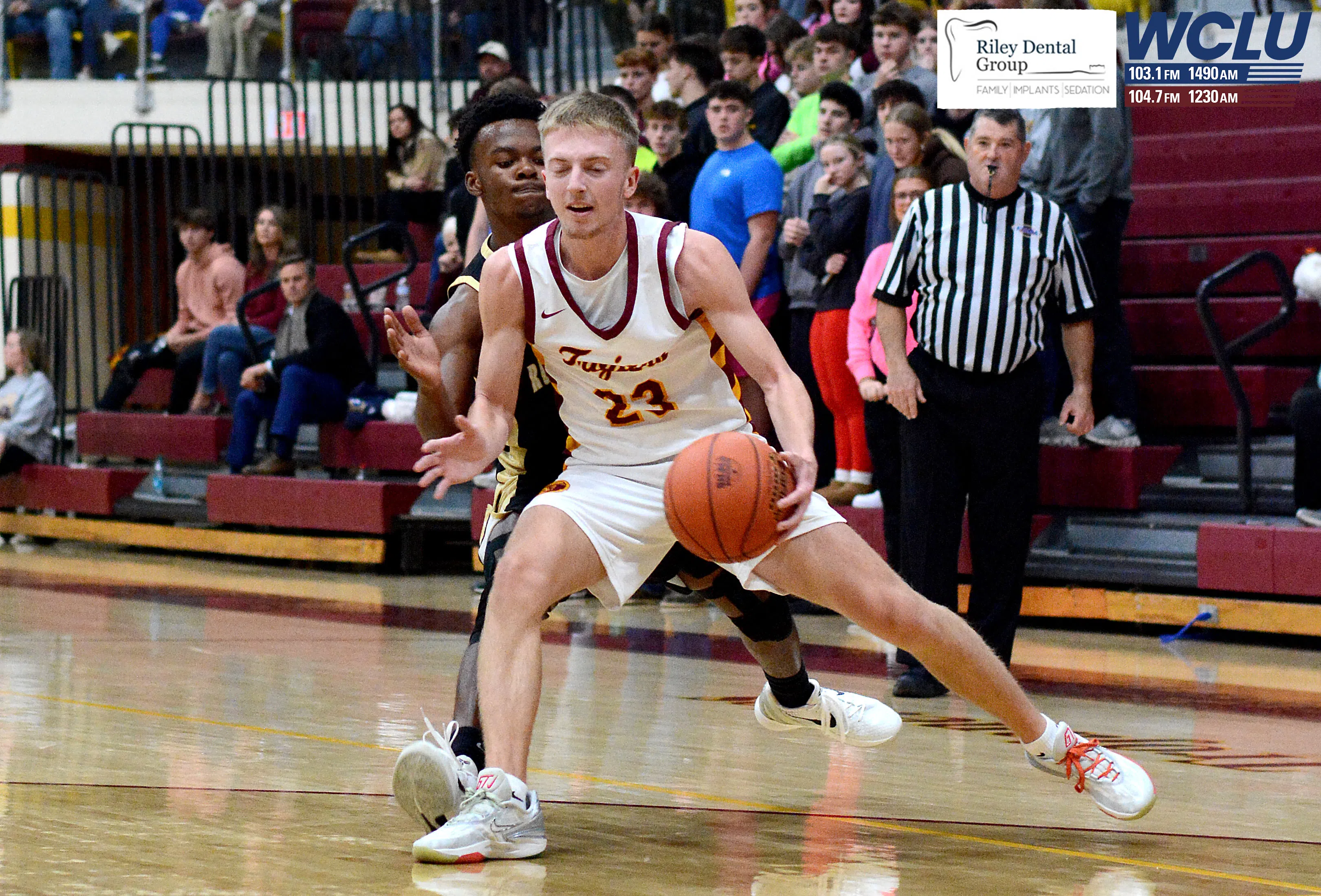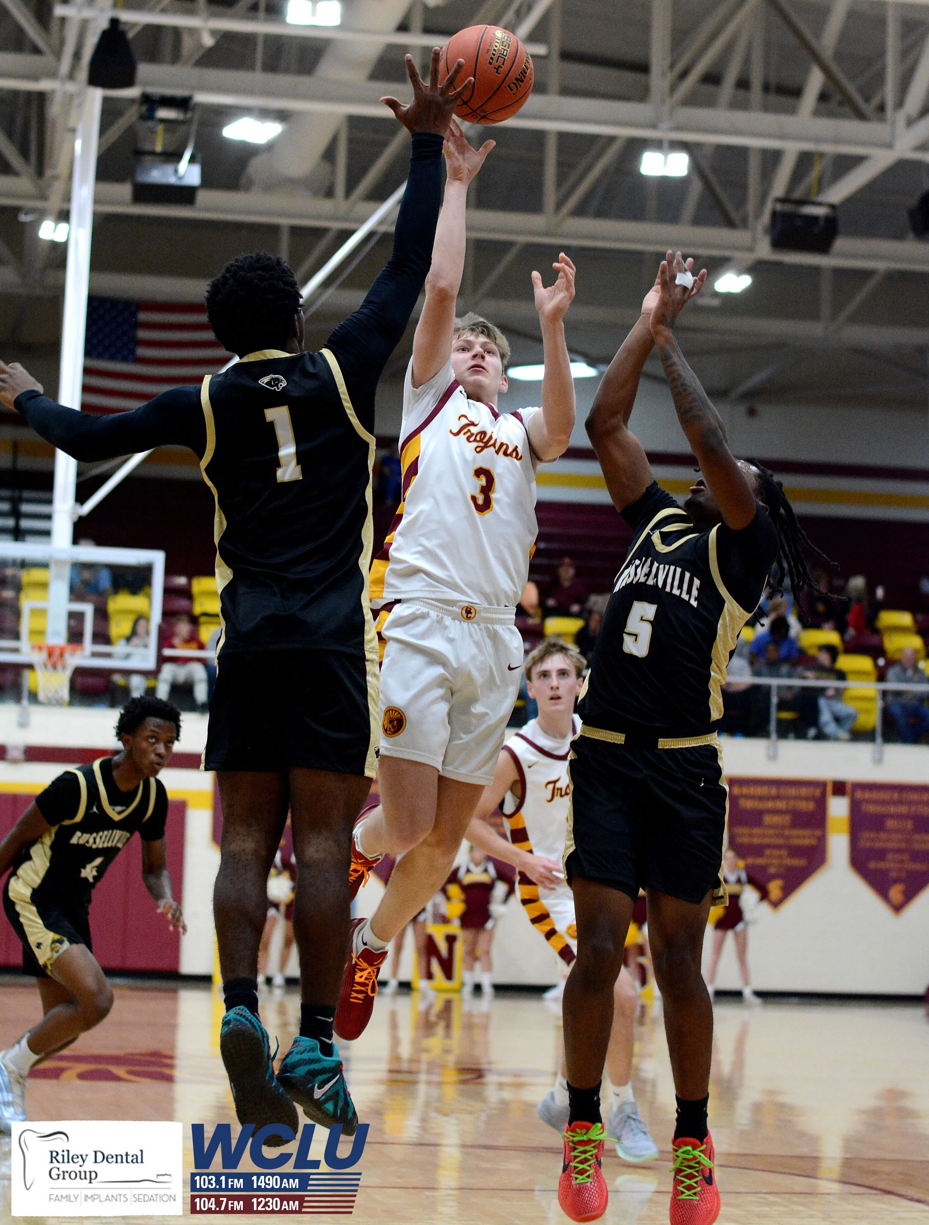 Barren County’s Weston Shelton drives toward the basket against Russellville. The Trojans won, 65-46. Auggie Brown/WCLU Sports