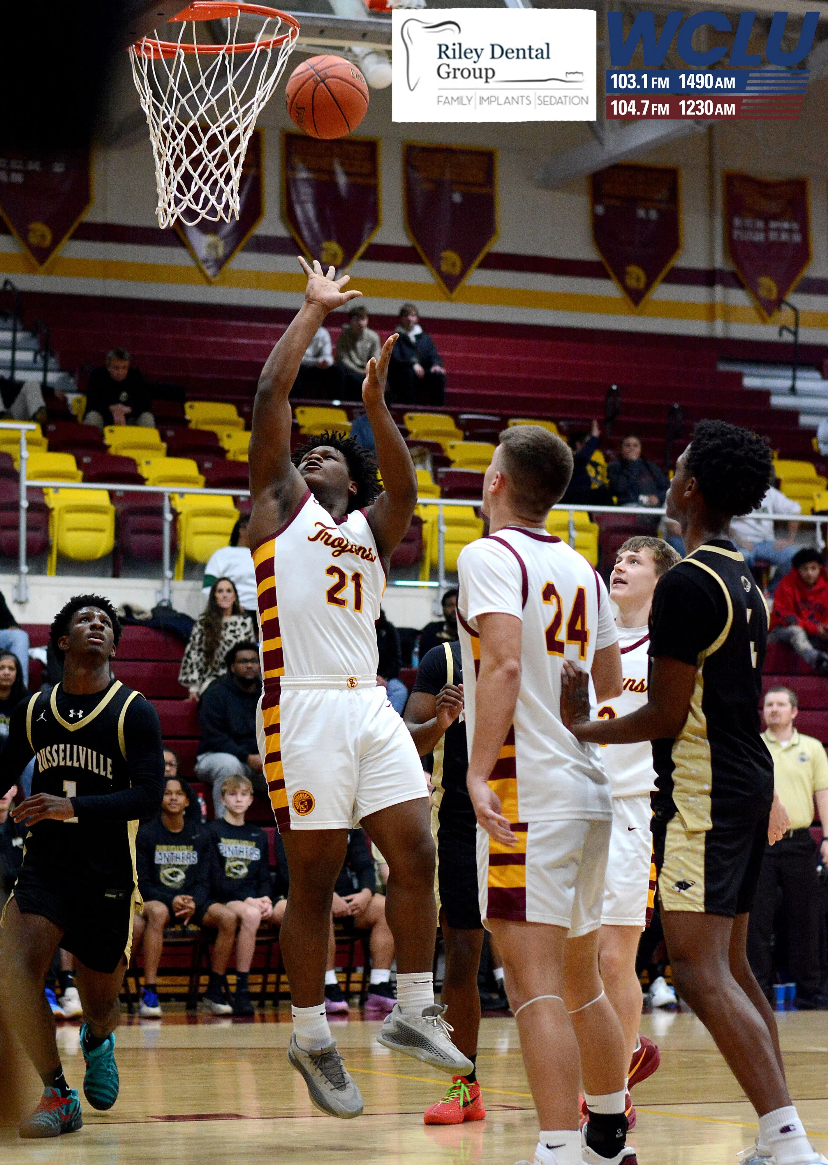 Barren County’s Weston Shelton shoots in the lane against Russellville. The Trojans won, 65-46. Auggie Brown/WCLU Sports