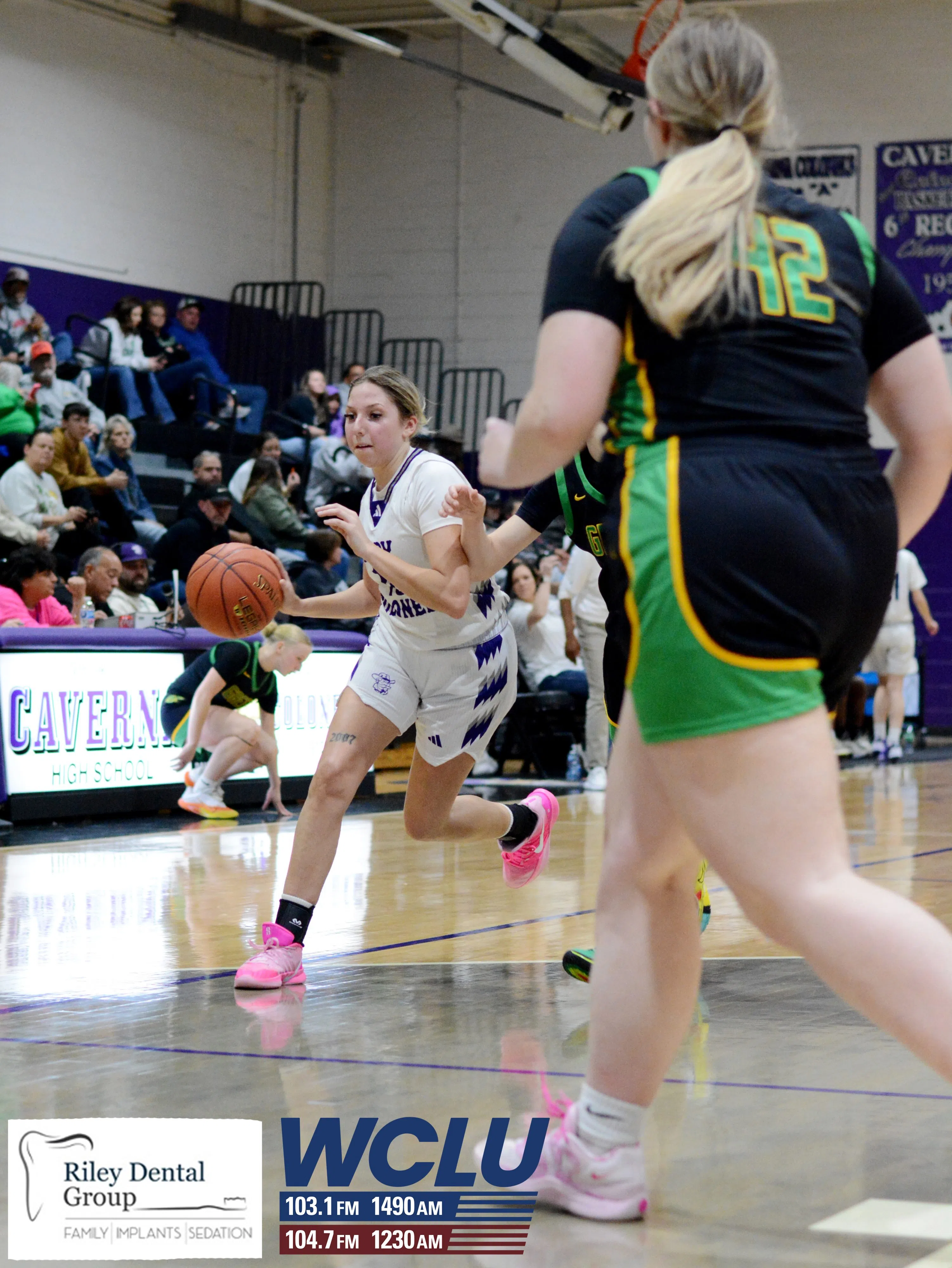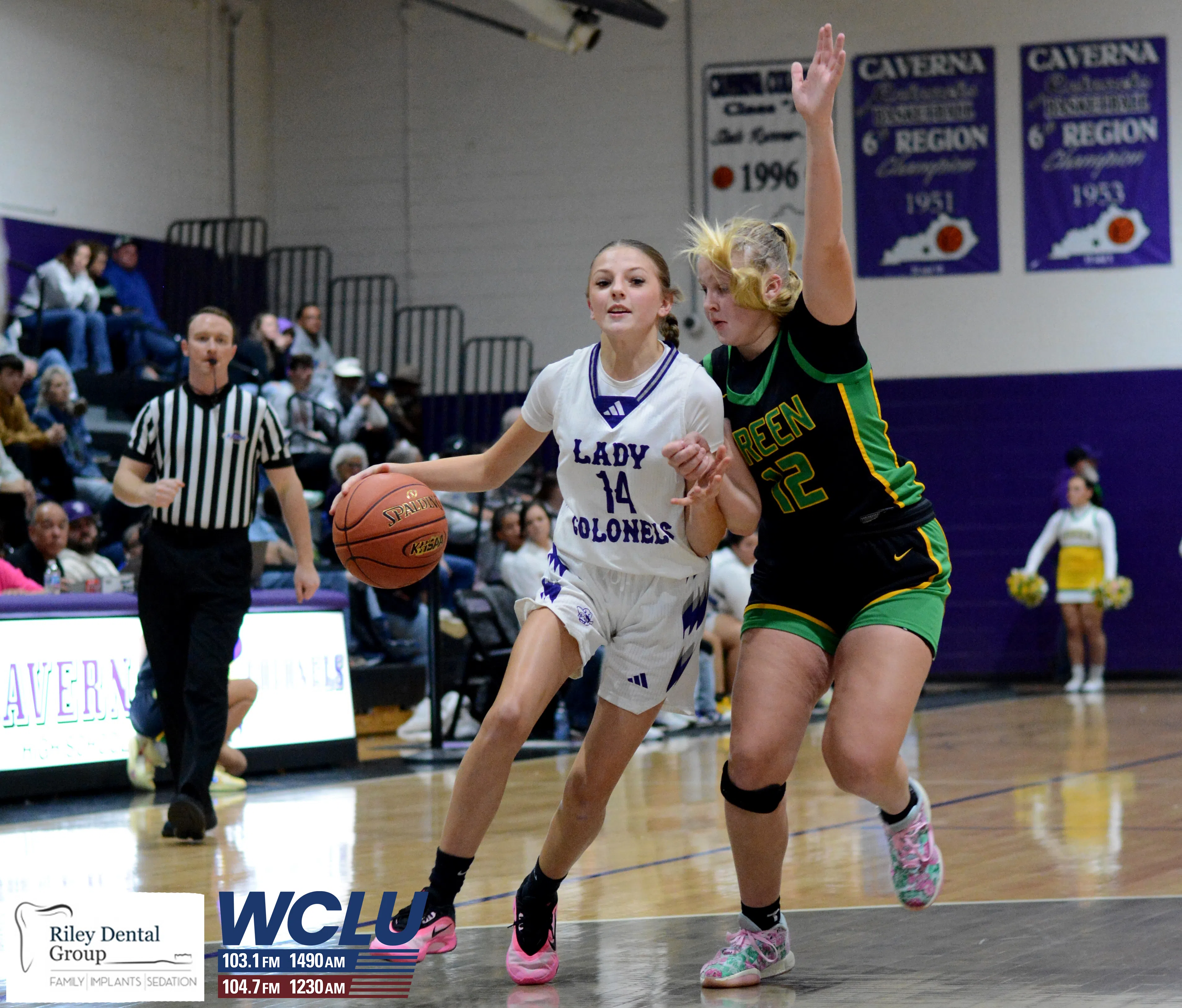Caverna’s Kinley Thompson drives against Green County. The Lady Colonels lost, 89-38. Auggie Brown/WCLU Sports
