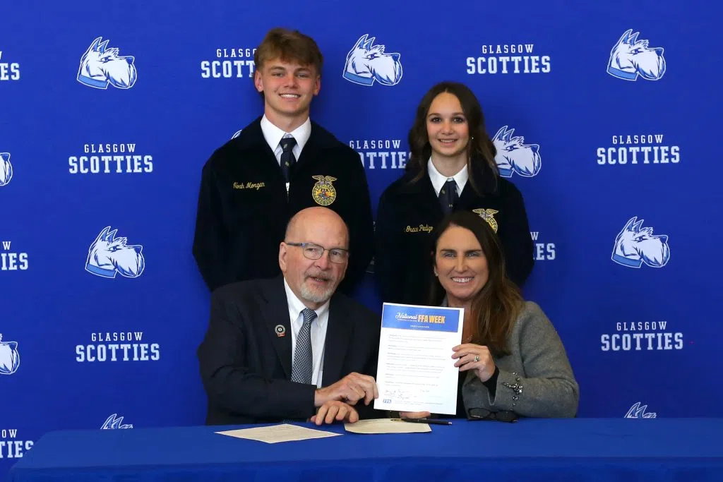 Glasgow High School sophomore Noah Morgan and freshman Jenna Grace Pedigo pose with Glasgow Mayor Henry Royse and Barren County Judge-Executive Jamie Bewley Byrd on Jan. 20, 2026, in the high school’s front lobby. The heads of the city and county signed a proclamation declaring Feb. 21-28 as National FFA Week. Will Perkins/Glasgow News 1