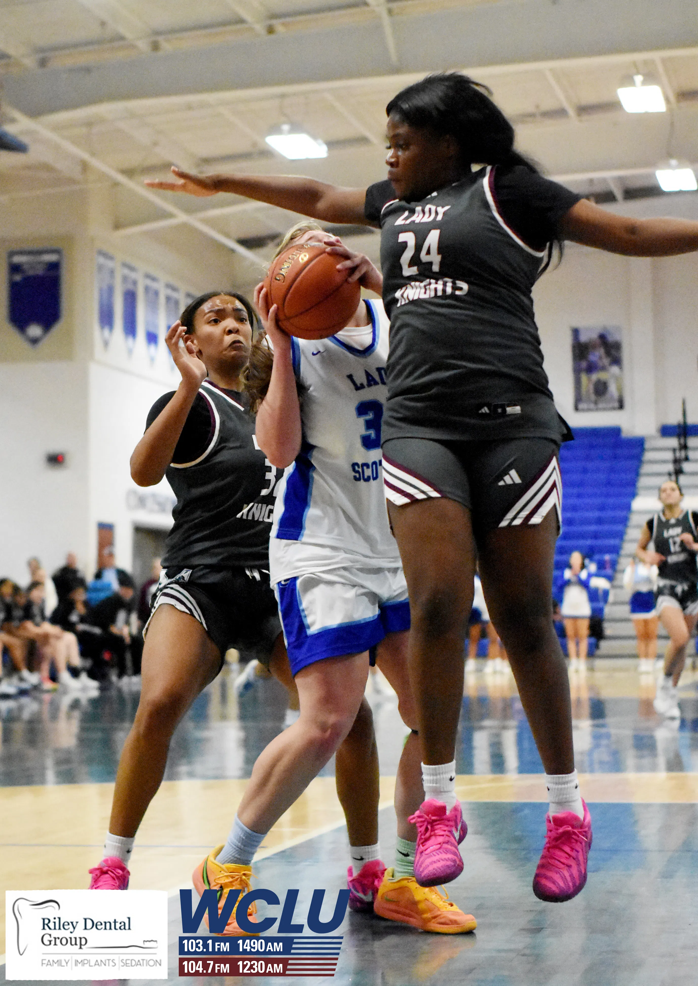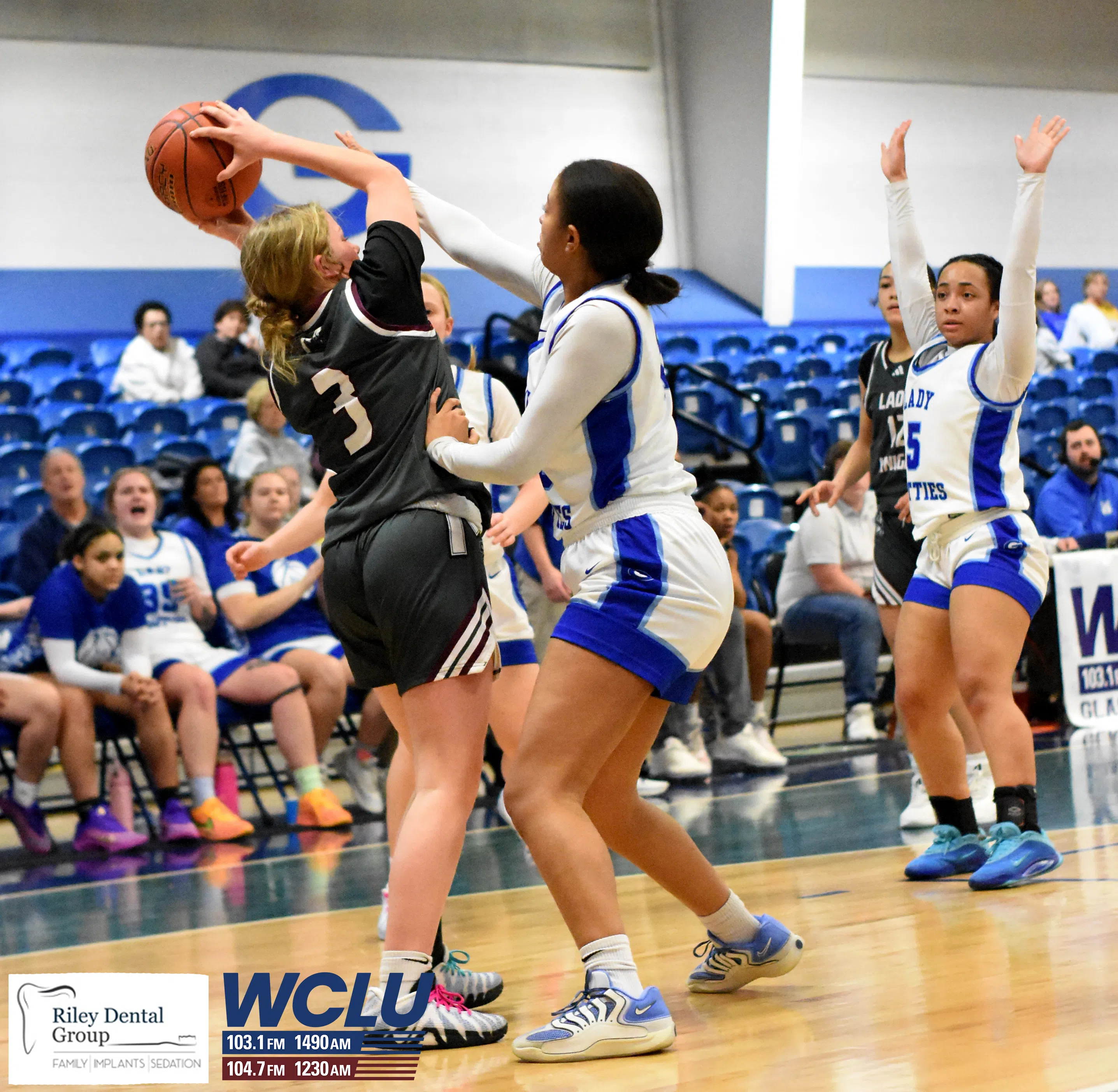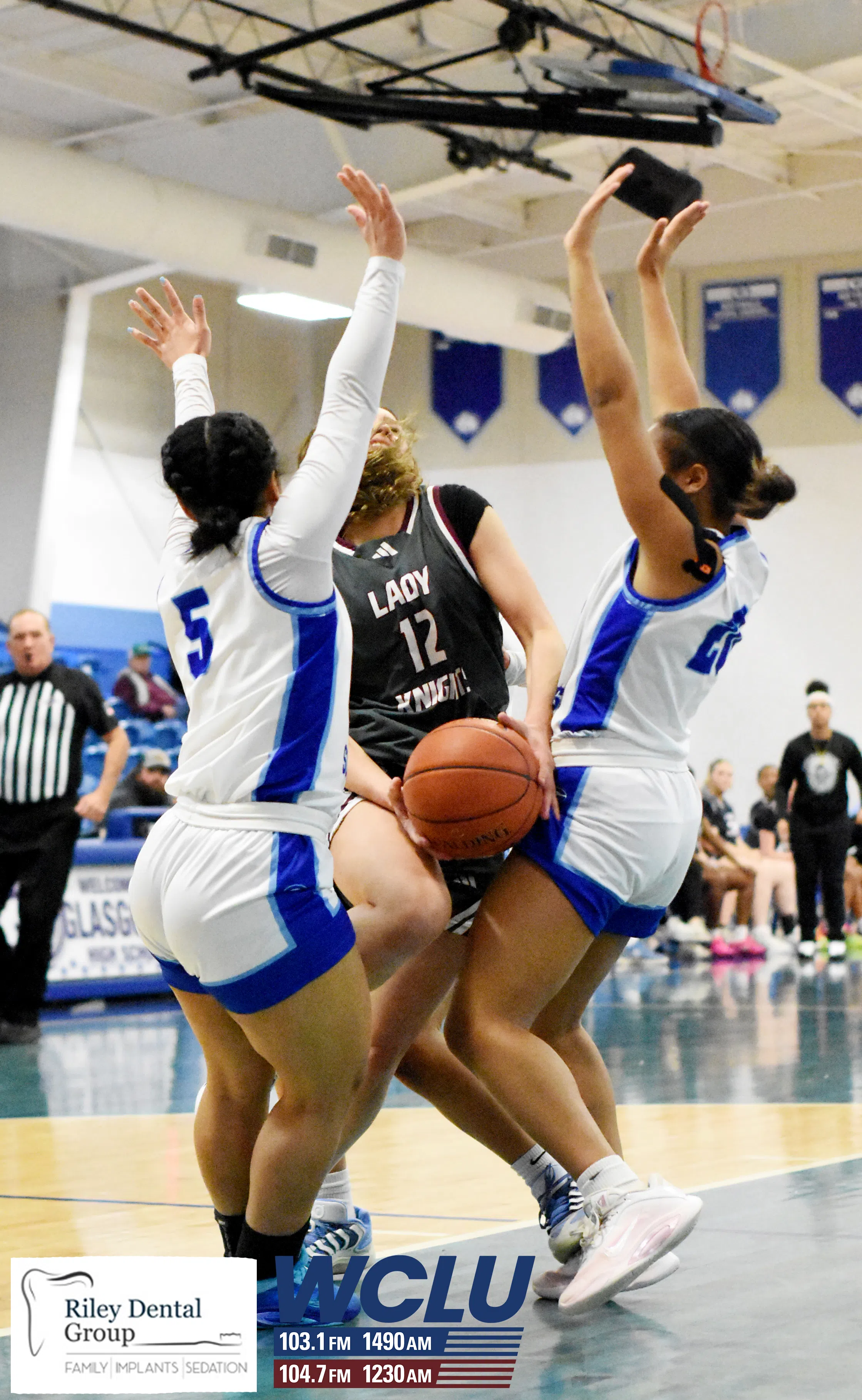 Glasgow’s Jakylie Green and NaTaya Lightfoot combine to draw a charge against Marion County. The Lady Scotties won, 47-45. James Brown/WCLU Sports