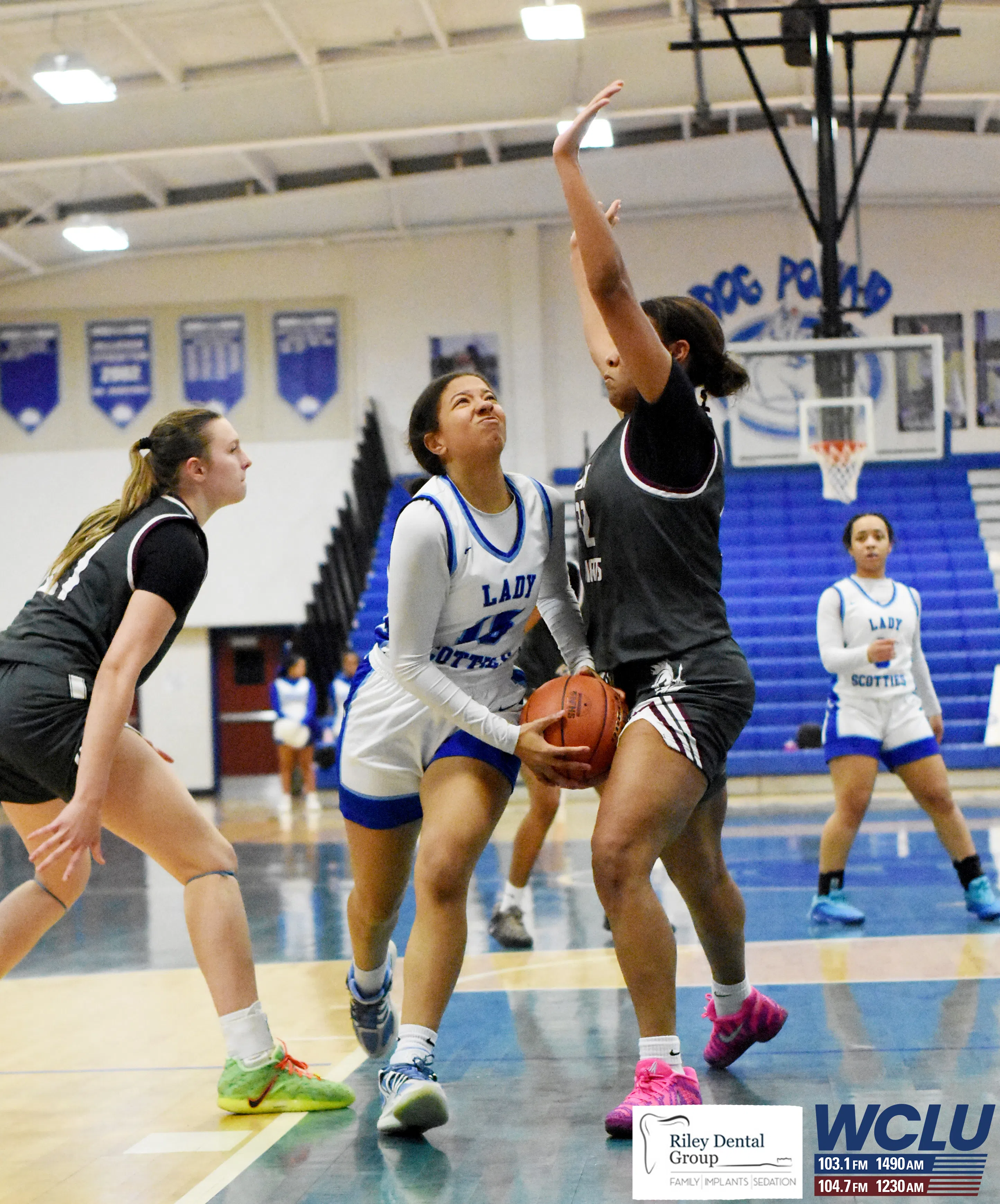 Glasgow’s Riley Strode pump fakes in the lane against Marion County. The Lady Scotties won, 47-45. James Brown/WCLU Sports