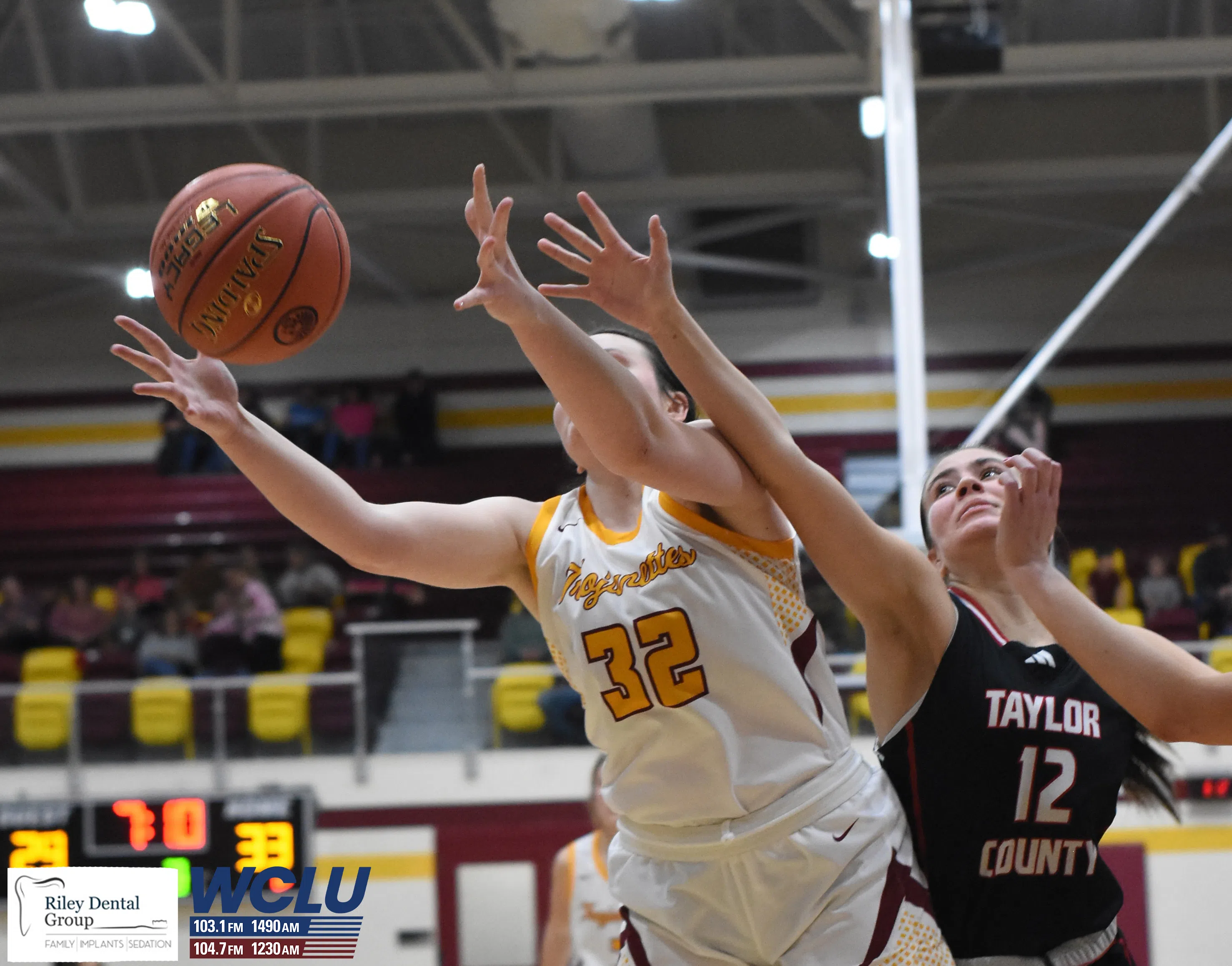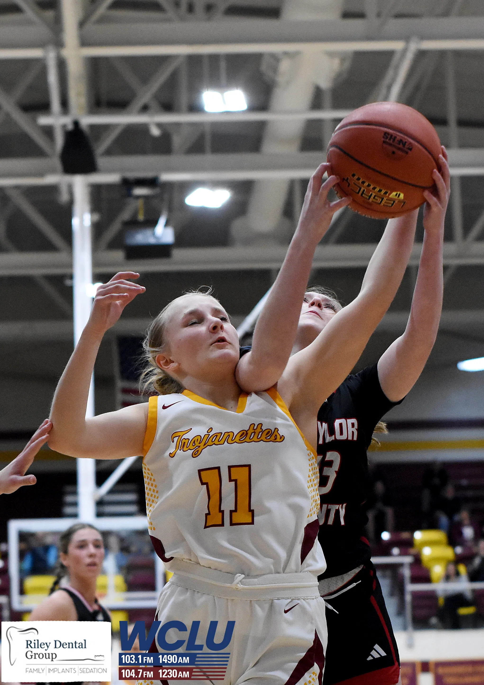 Barren County’s Riley Wilson battles for a rebound against Taylor County. The Trojanettes won, 71-65. James Brown/WCLU Sports