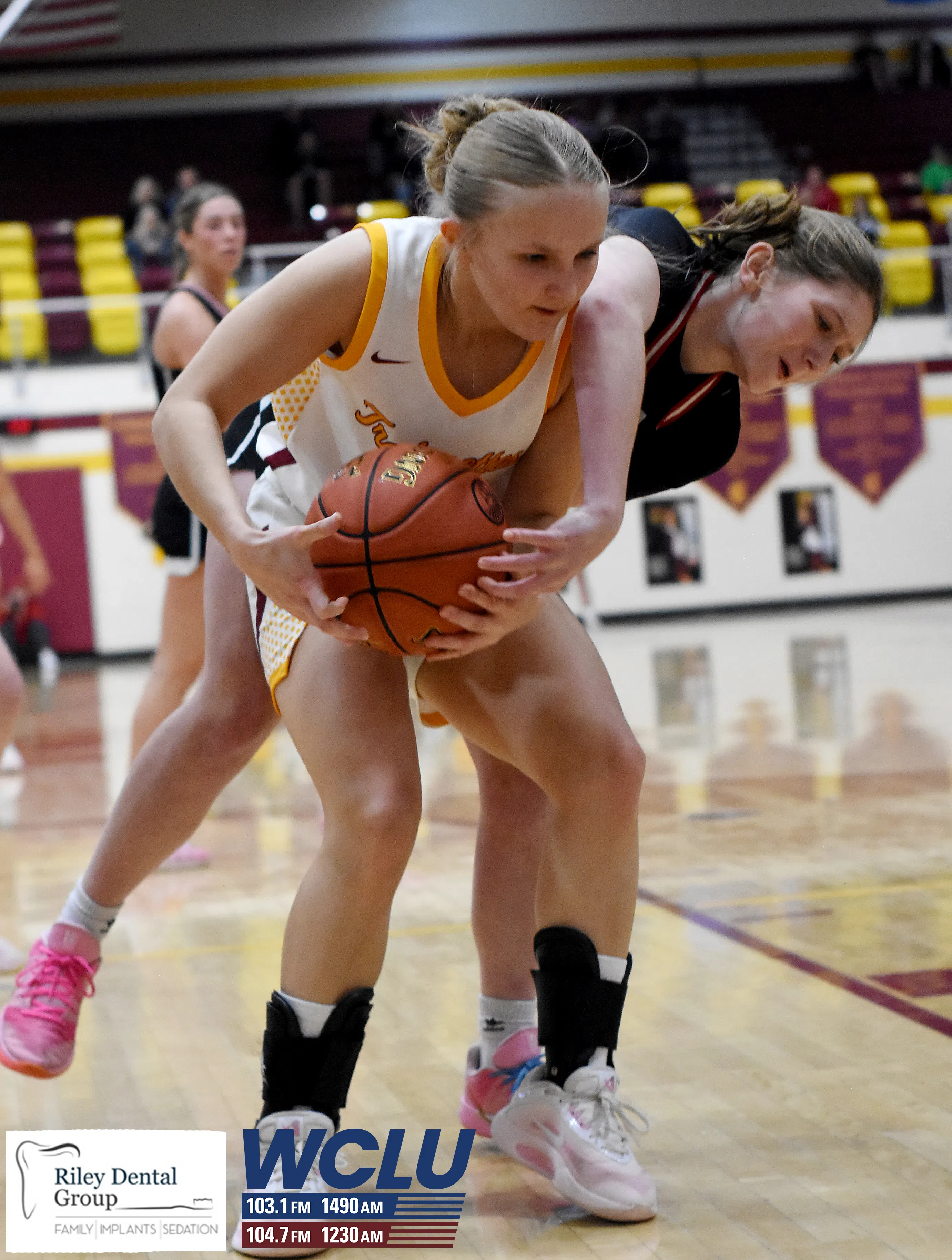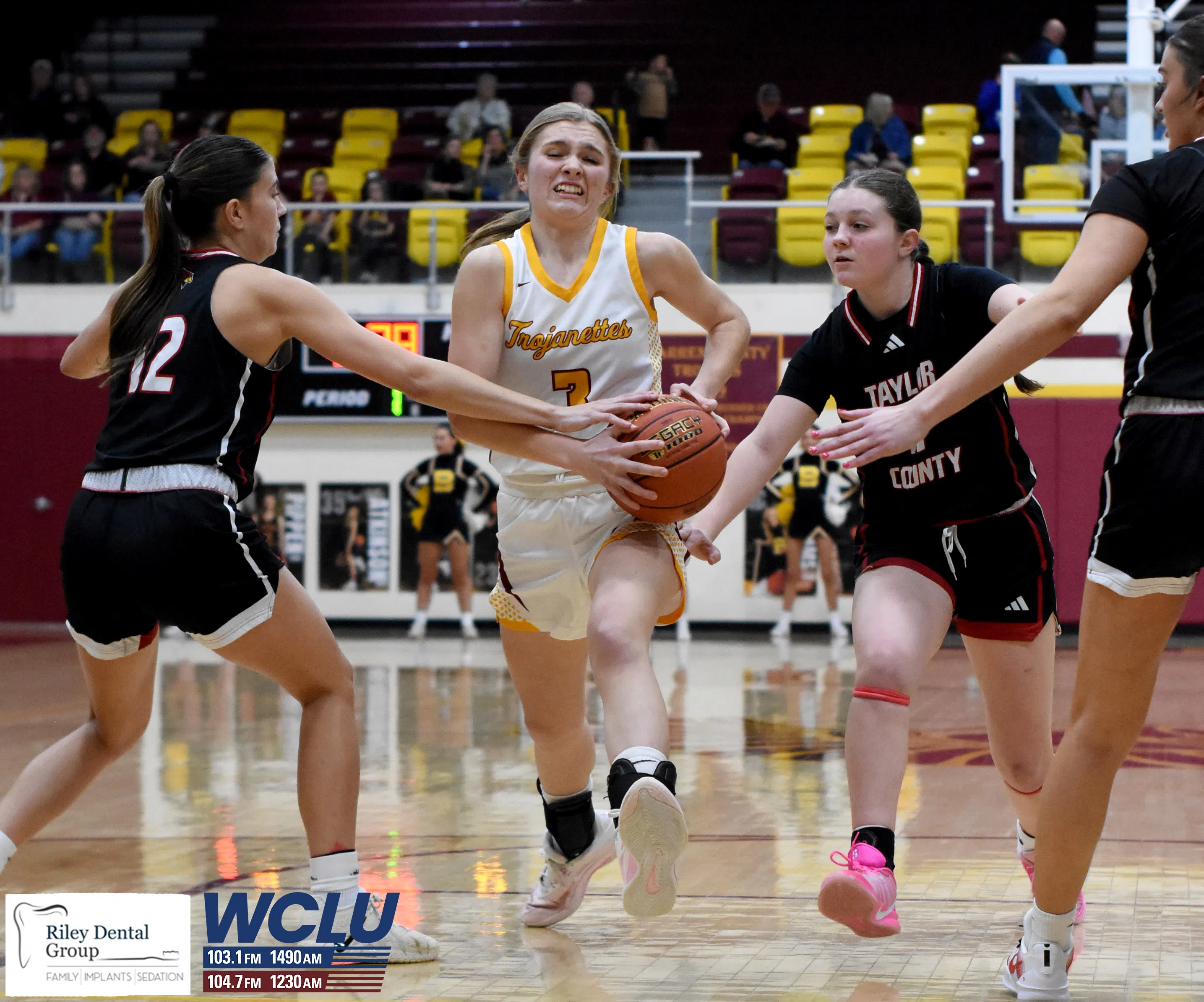 Barren County’s Addy Slagle is fouled as she wrestles for a loose ball against Taylor County. The Trojanettes won, 71-65. James Brown/WCLU Sports