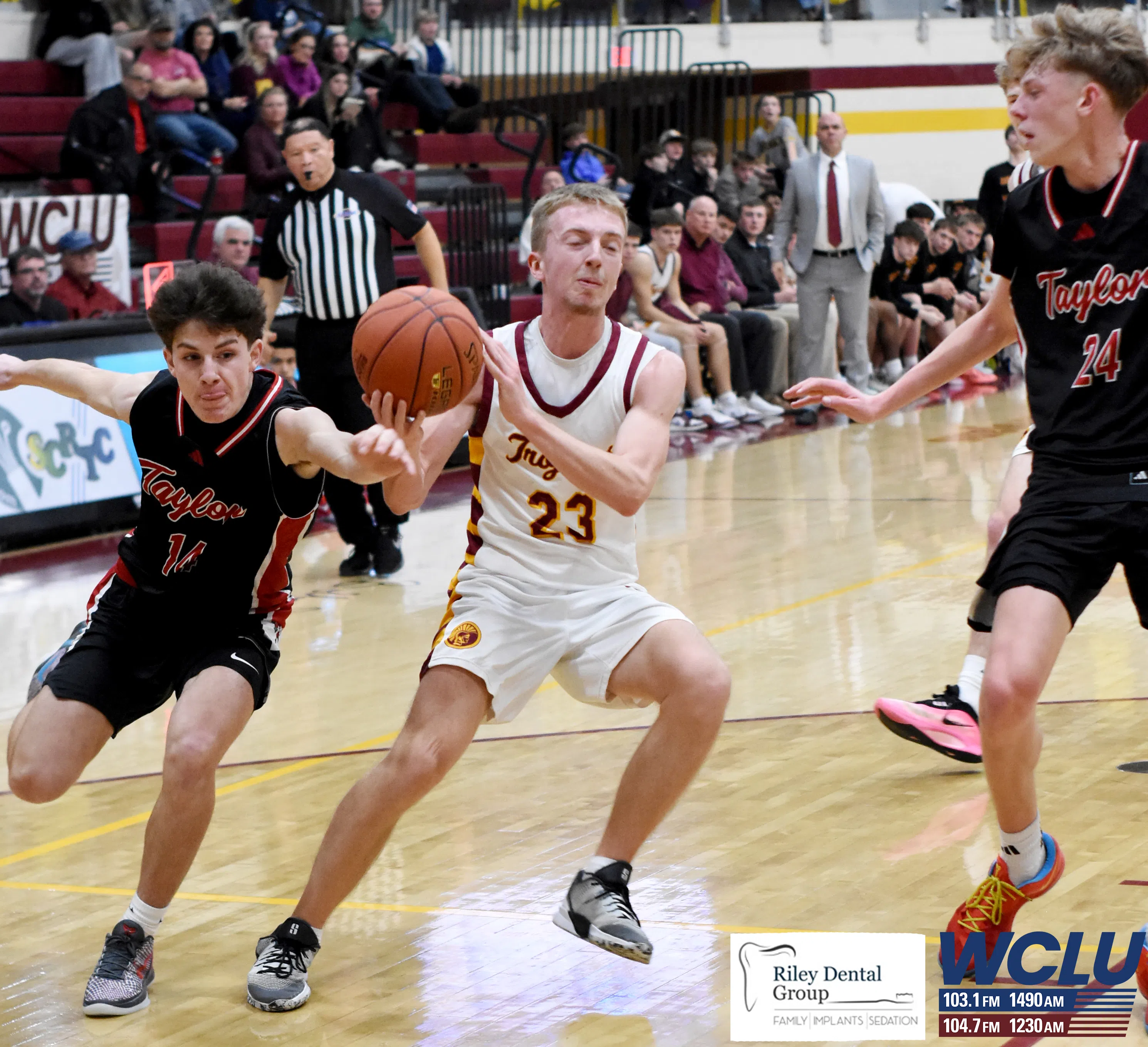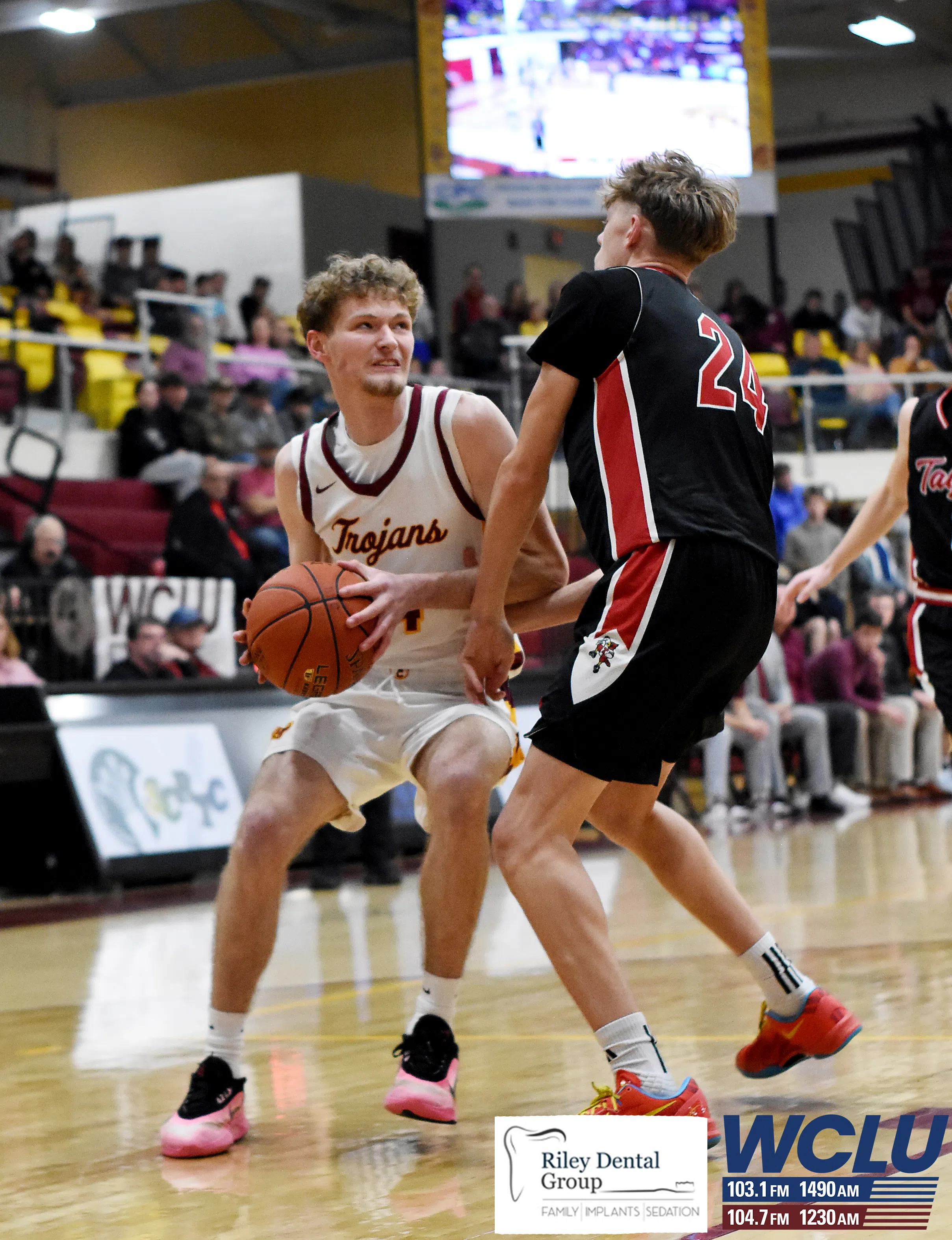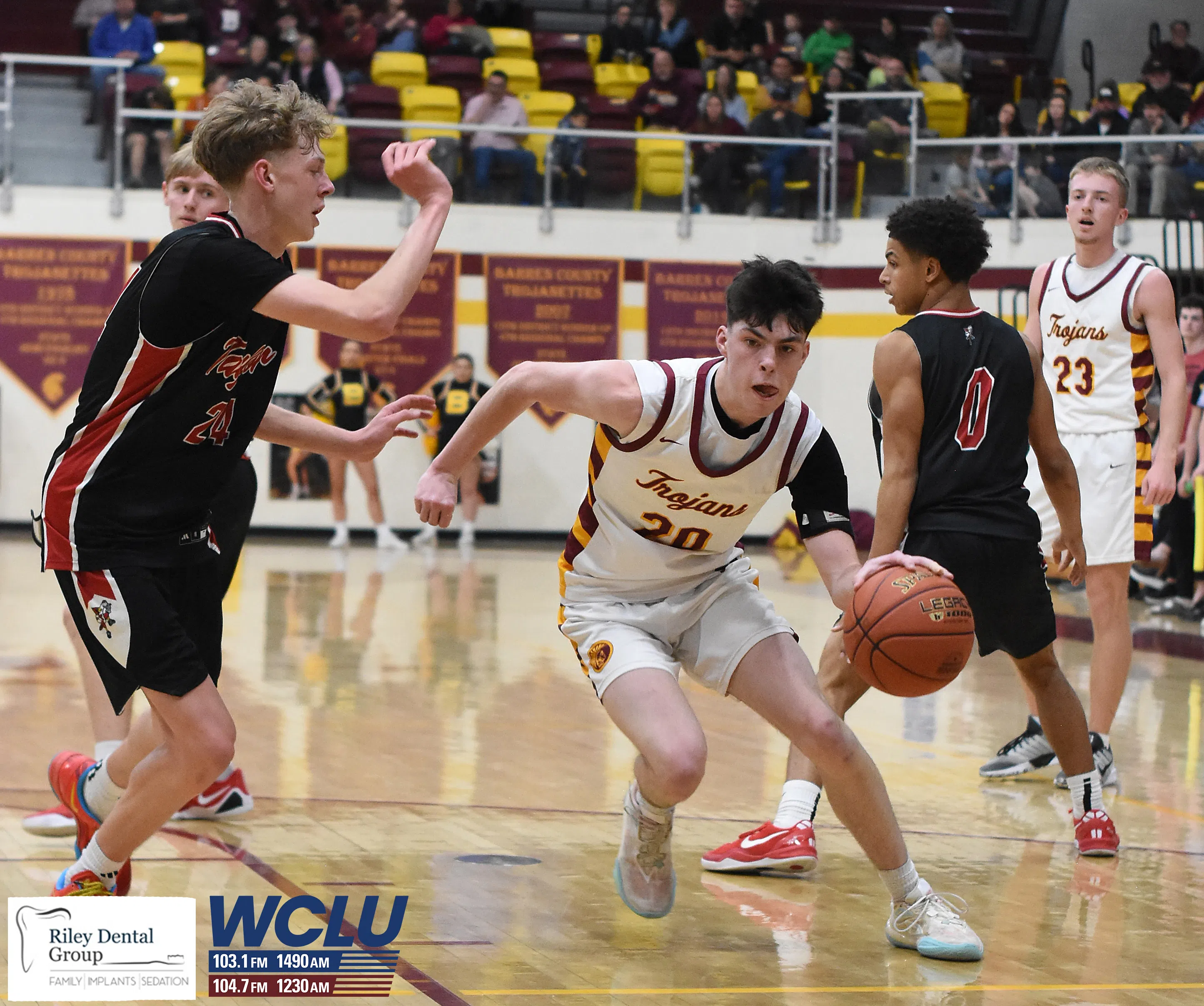 Barren County’s Cade Hardy dodges a defender against Taylor County. The Trojans lost, 69-67. James Brown/WCLU Sports