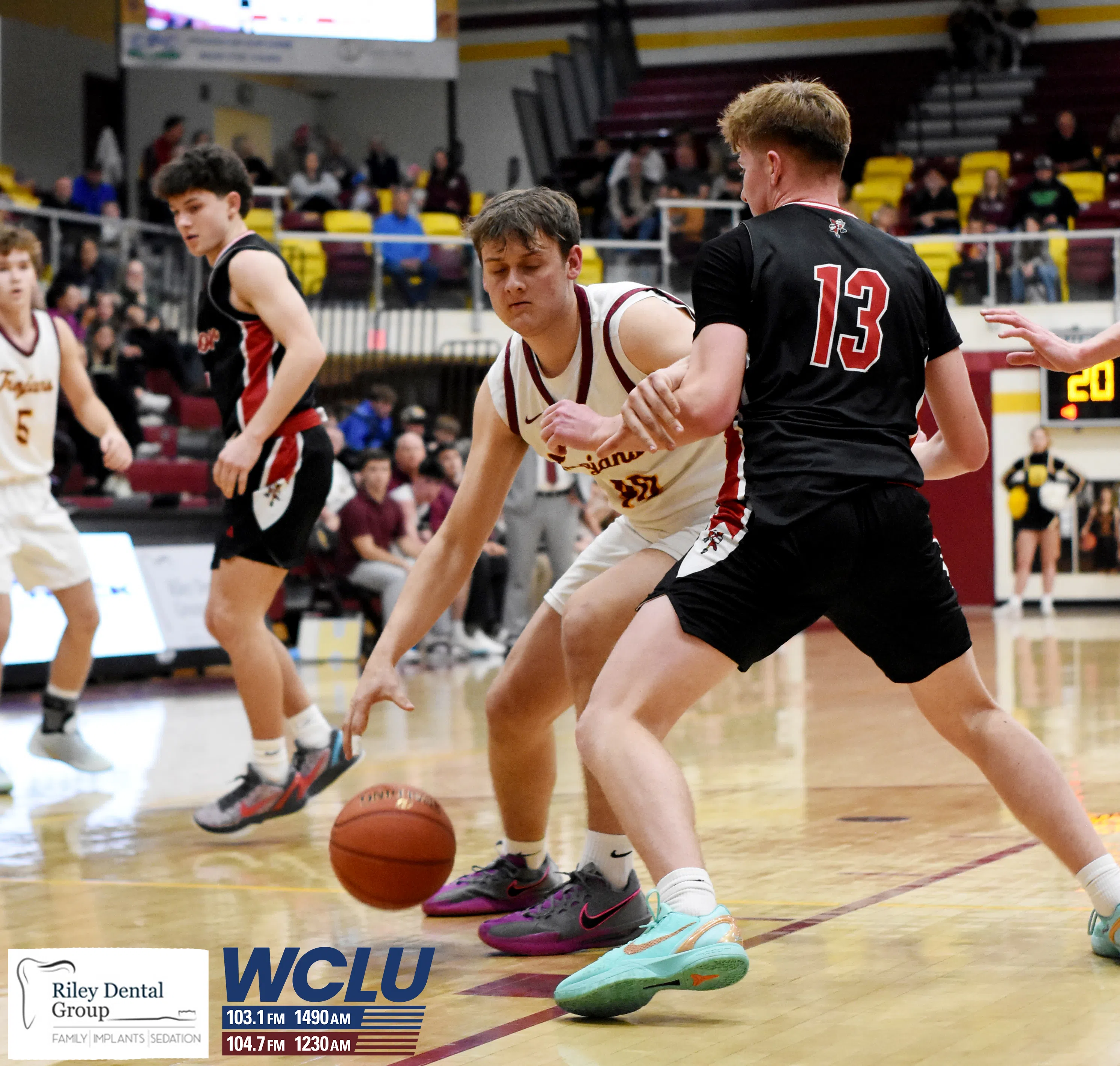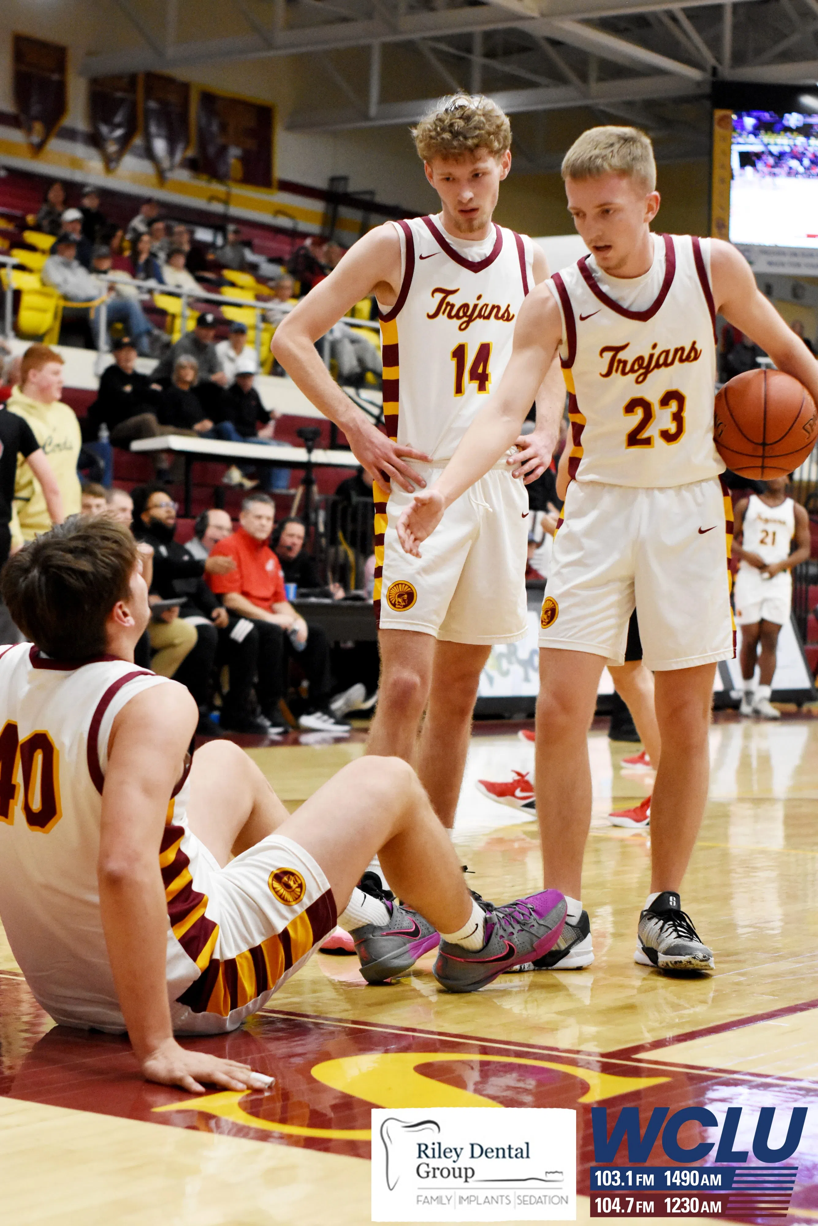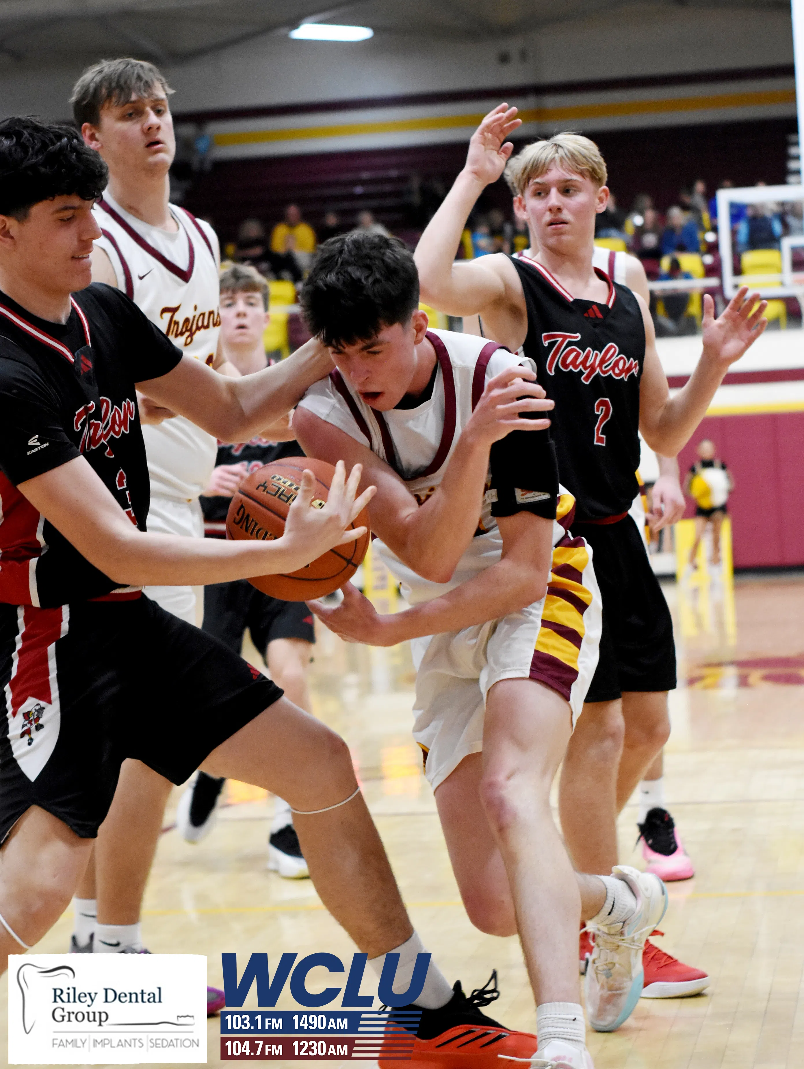 Barren County’s Carson Browning battles for a loose ball against Taylor County. The Trojans lost, 69-67. James Brown/WCLU Sports