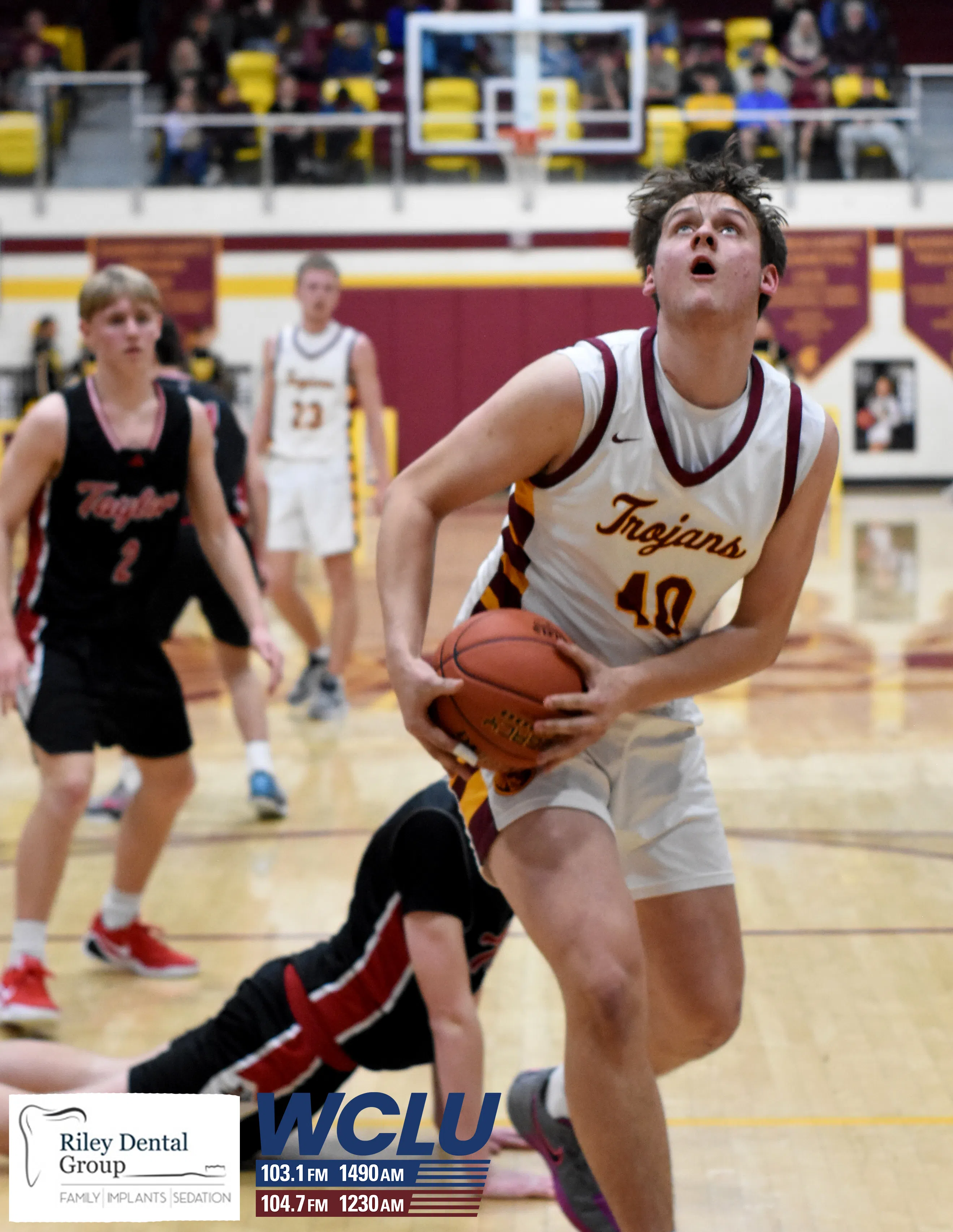 Barren County’s Gavin Nunn looks to score from the block against Taylor County. The Trojans lost, 69-67. James Brown/WCLU Sports