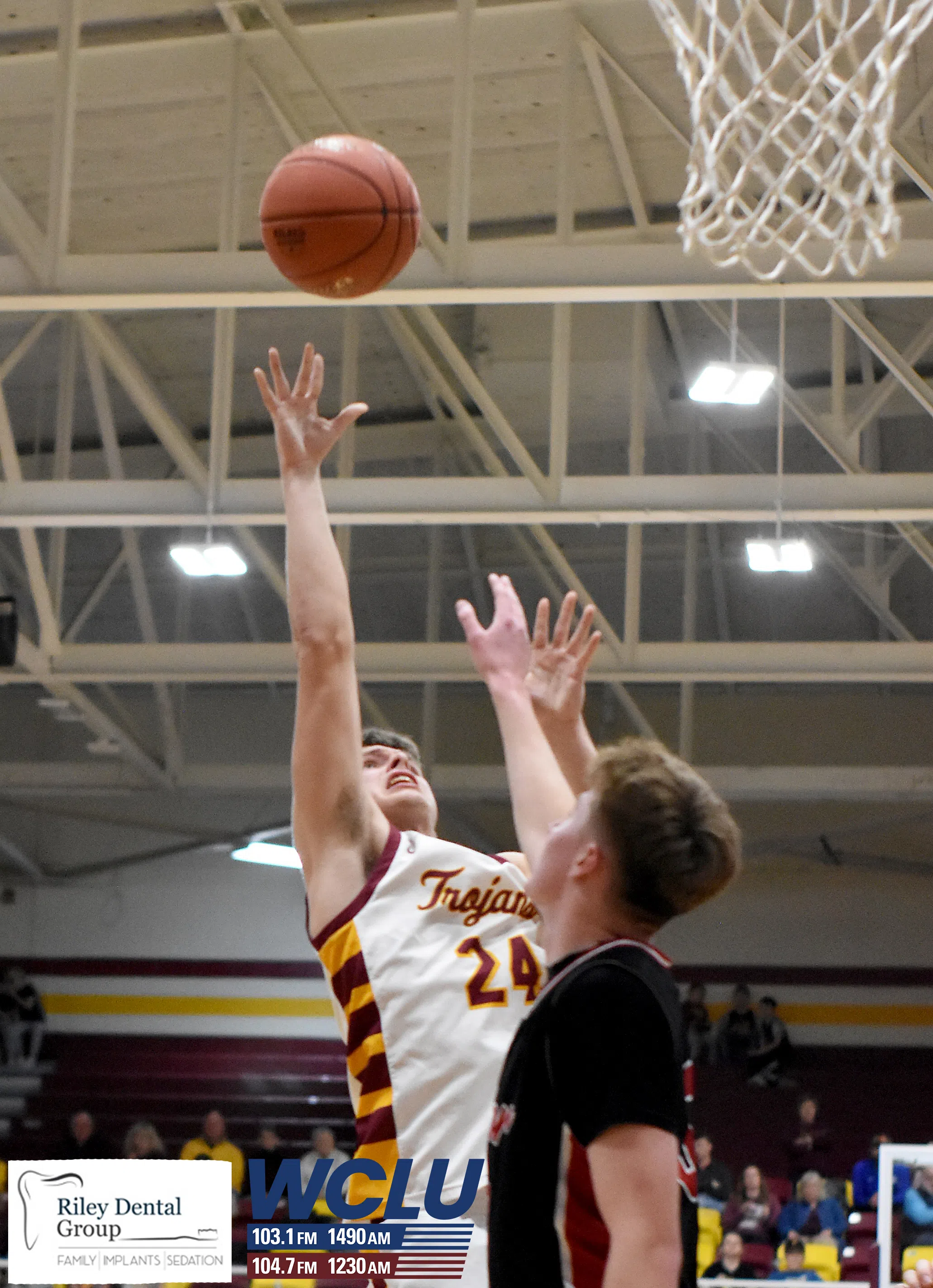 Barren County’s Jaxson Byrd shoots in the lane against Taylor County. The Trojans lost, 69-67. James Brown/WCLU Sports