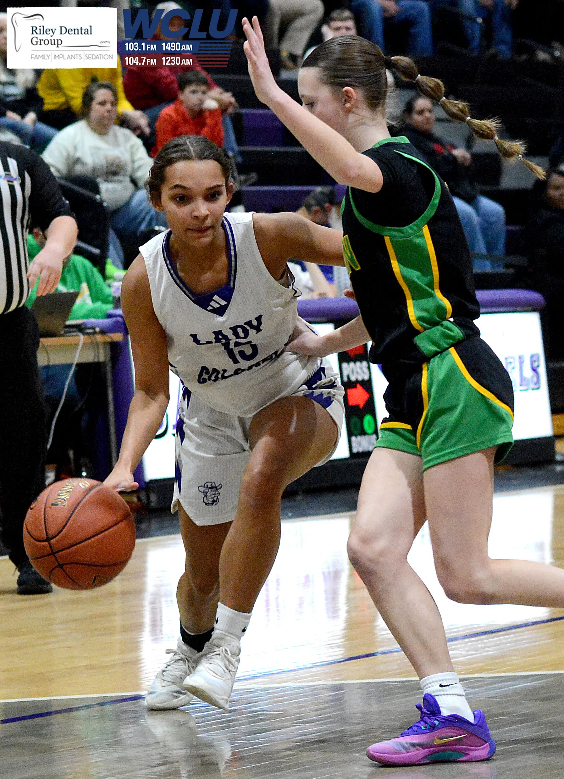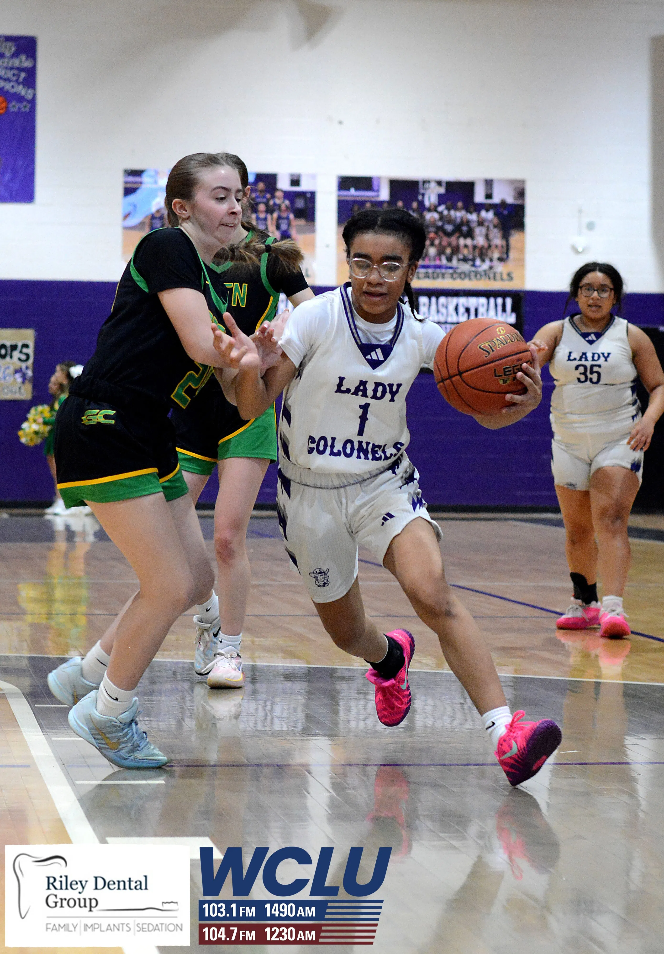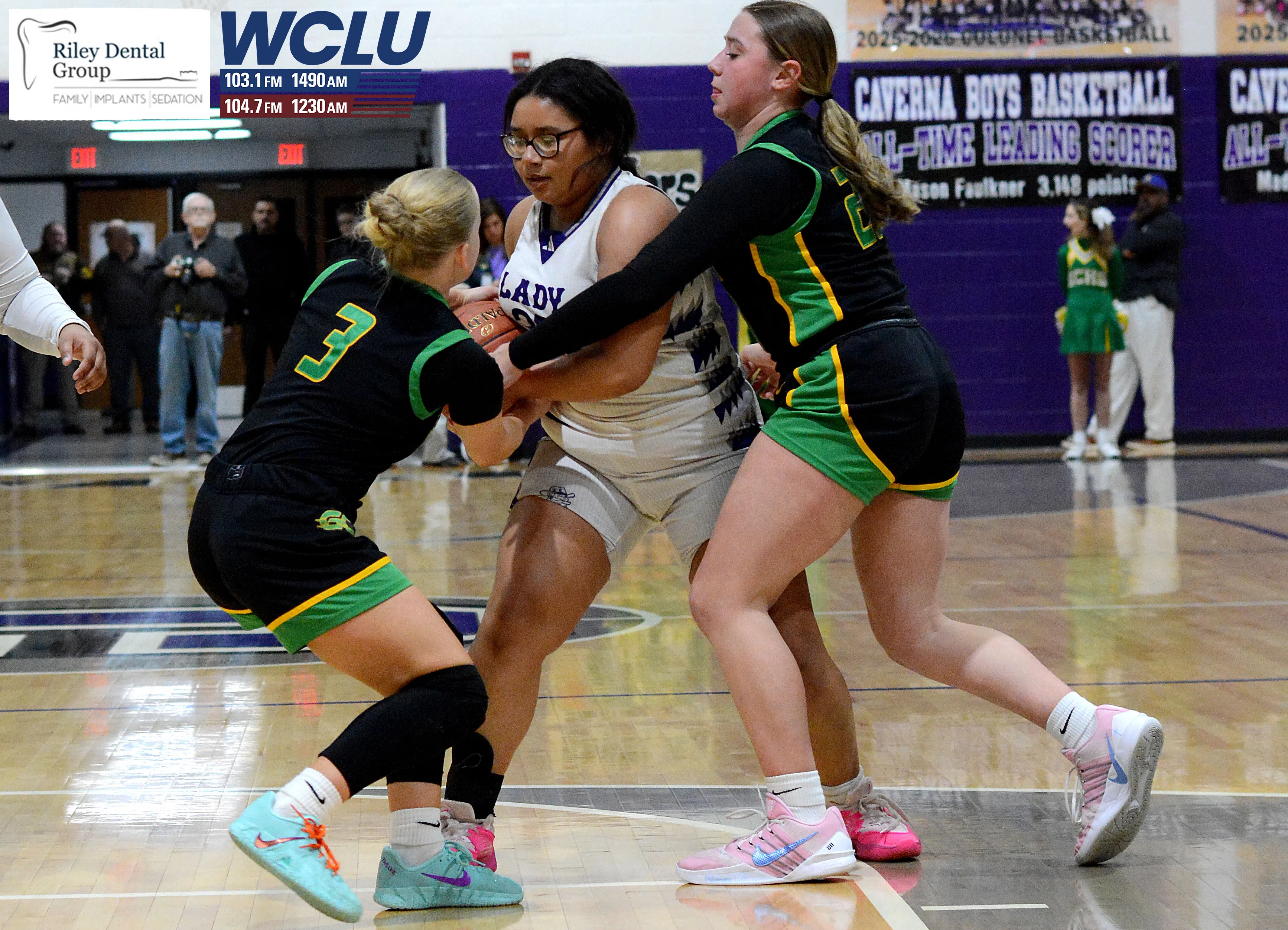 http://Caverna's%20Kamryn%20Cole%20shields%20the%20ball%20from%20defenders%20against%20Green%20County.%20The%20Lady%20Colonels%20lost,%2070-21,%20in%20the%20first%20round%20of%20the%20Girls%2018th%20District%20Tournament.%20Auggie%20Brown/WCLU%20Sports