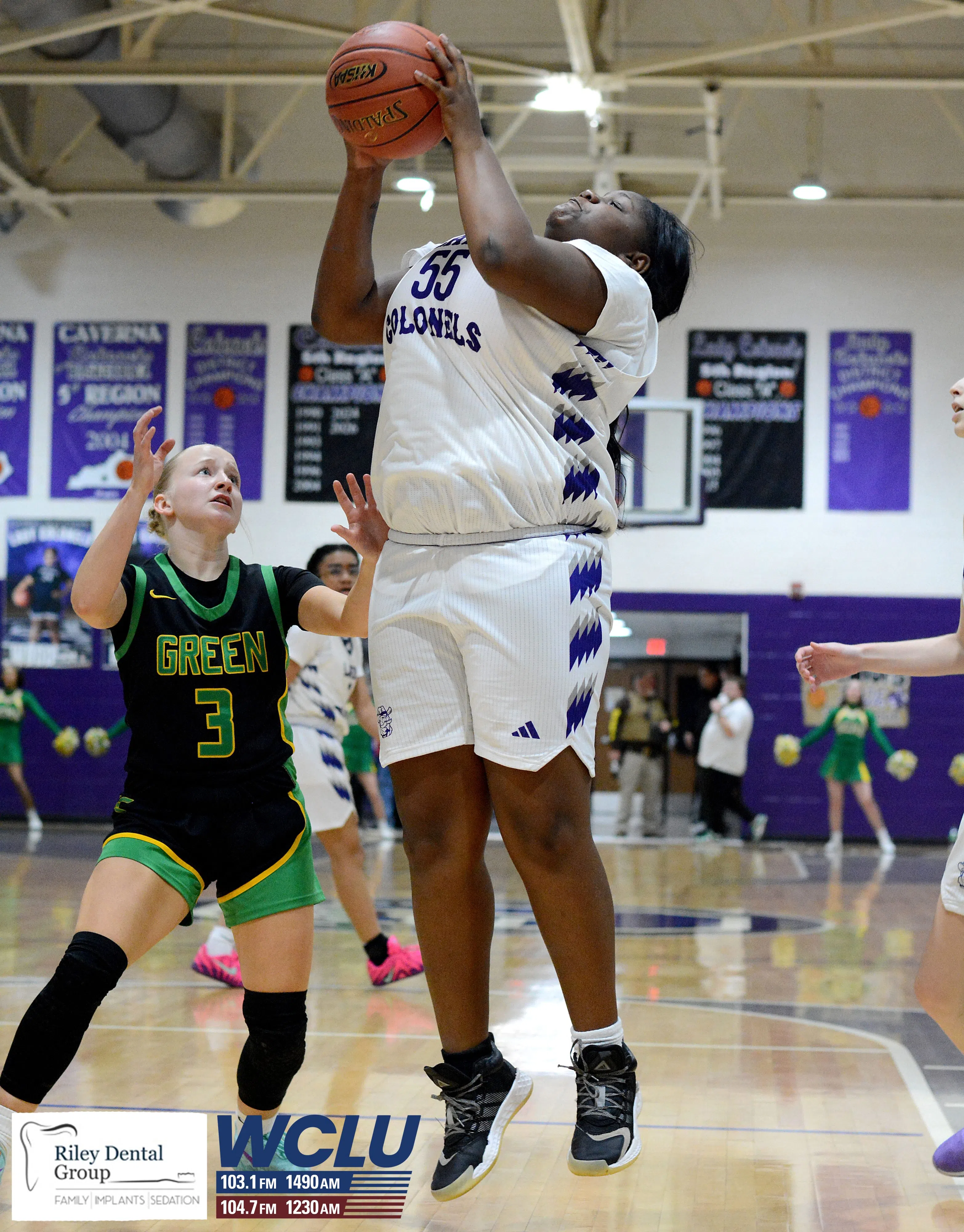 Caverna’s Amani Wooden grabs a rebound against Green County. The Lady Colonels lost, 70-21, in the first round of the Girls 18th District Tournament. Auggie Brown/WCLU Sports